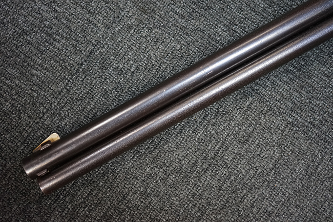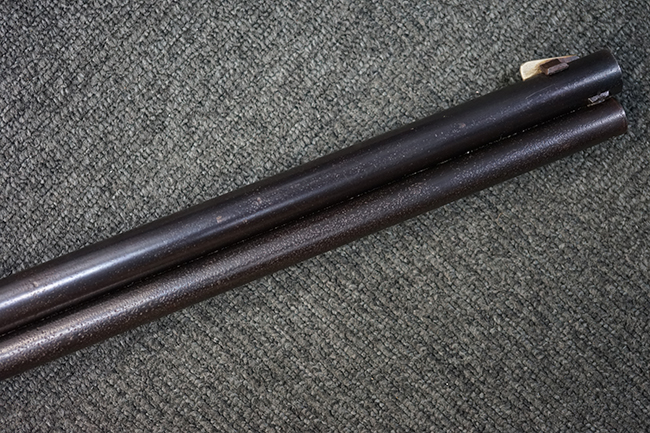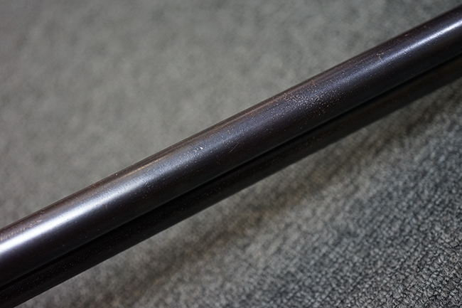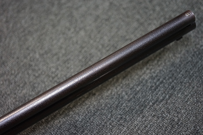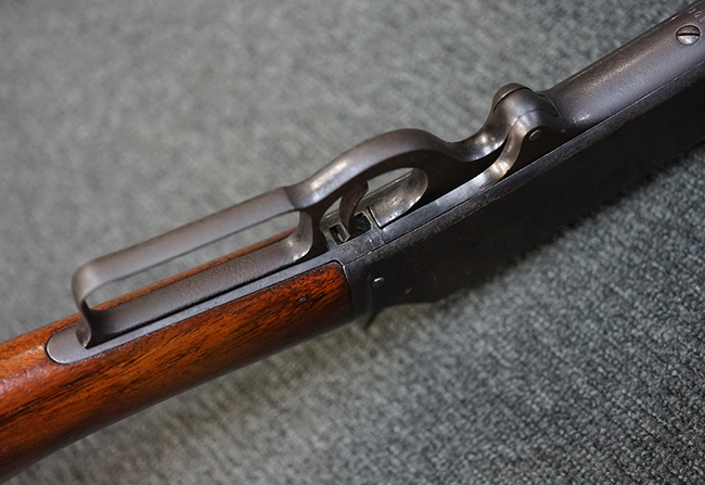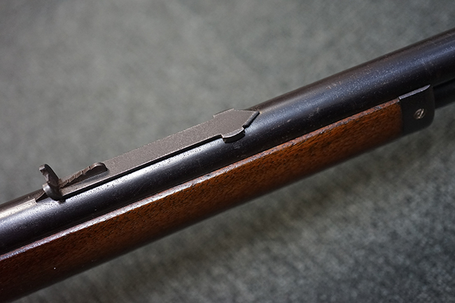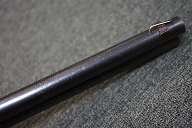 リア・サイトはセミ・バックホーン・サイトで、U字型のノッチは潰れておらず完全です。 照準距離を調節するスライドの動きもスムーズで、小気味良く可動します。 アンダー・レバーはボルトなど他のパーツとの連動していませんが可動し、閉じた際にはキャッチによって遊び無くぴったりと収まります。 銃身のインサートの溶接は銃口付近まで埋まっておりますが、浅いながら銃口から .38-.55Win.弾を使用するライフリングが確認できます。