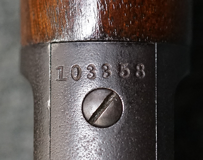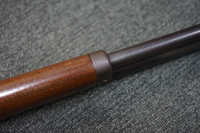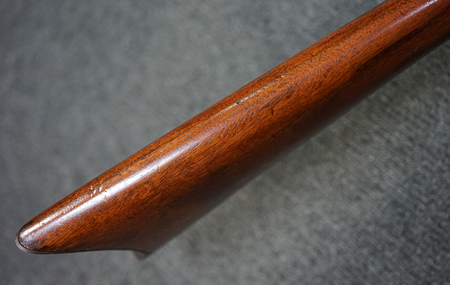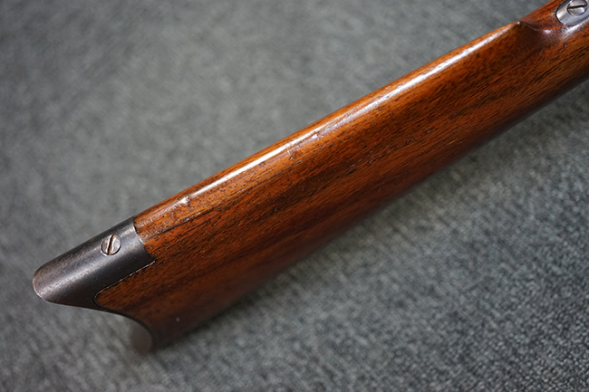 木製部分はハンドガードとストックの色味も揃っており、仕上げの艶が大変鮮やかです。 やはり若干の小傷こそ見られますが、傷には時代が付いており周囲と馴染んでいます。 現状目立ったひびや割れは見られず、機関部への取り付けについてもがたつき無くしっかりと固定されています。 バット・プレートは、銃身長と一致したライフル・モデル特有の綺麗なカーブを描いた三日月型で、隙間無くぴったりと合わせられています。