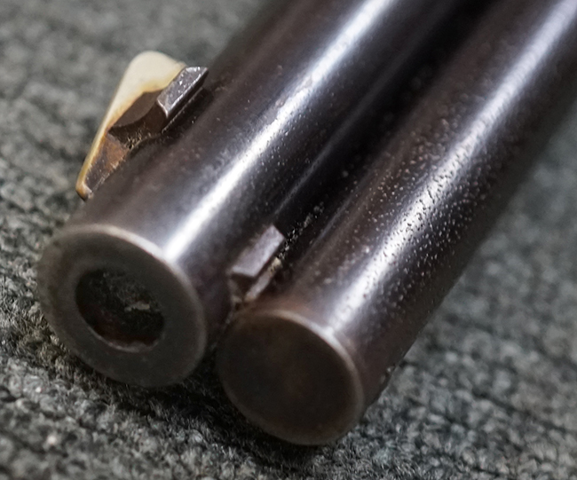 金属部はブルー仕上げが比較的残っていますが、全体に浅く時代錆が広がっています。 しかしながら、ブルー仕上げ自体は鮮やかで、劣化が進行している様子は感じられません。 機関部の一部が小豆色っぽくなっていますが、これも劣化と言うよりは、生産時の微妙な表面処理の差によるものと言った印象です。 傷つきやすいバット・プレートについても、角張った部分の擦れと小さな打ち傷程度で、こちらもブルー仕上げが鮮やかです。 真鍮製のフロント・サイトは薄いブレード型で、歪みなく完全なシルエットが保たれています。 製造された時代を考えると十分良好に保たれた仕上げであり、雰囲気の良い状態と言えます。