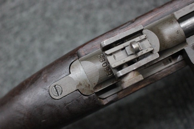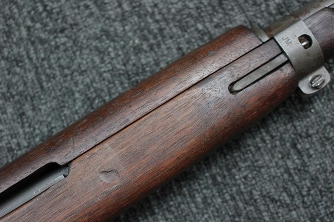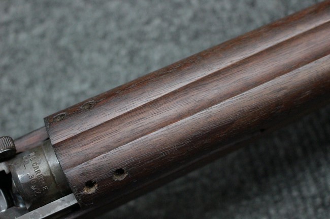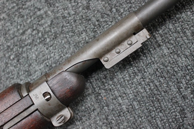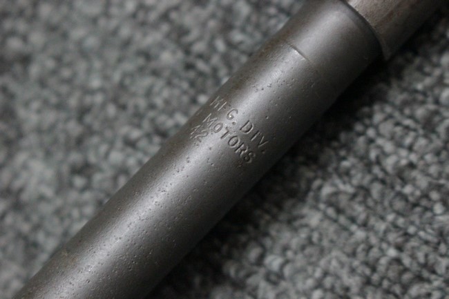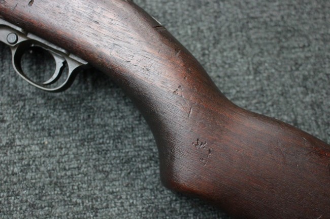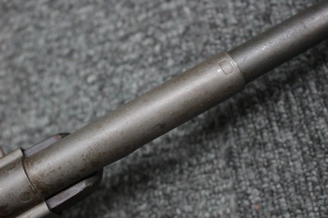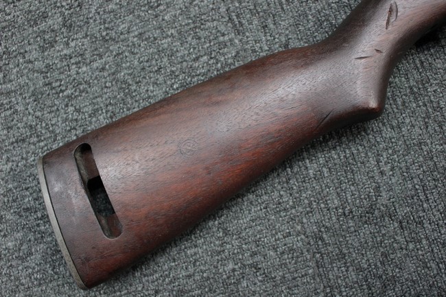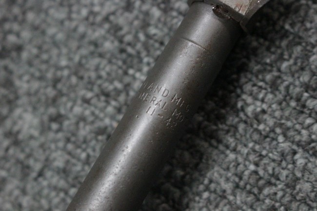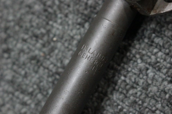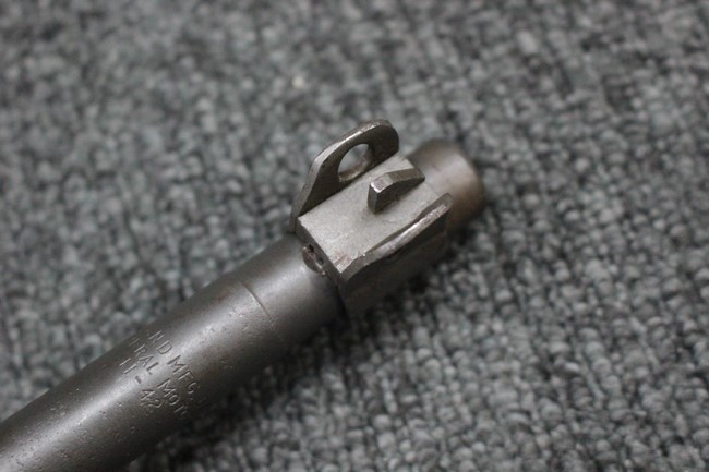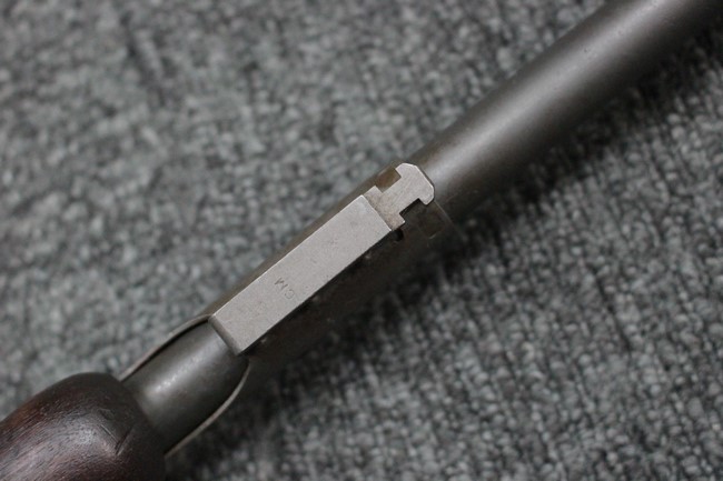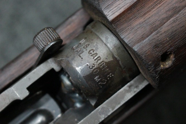 本品はインランド社で製造された個体で、レシーバー後端にシリアルNo.及びメーカーを示す刻印が見られます。 インランド社は第二次世界大戦中にM1カービンを最も多く製造していたメーカーとしても知られています。 シリアルNo.から1942年5月から1943年11月の間に製造された個体である事が判ります。 また、銃身先端付近には「INLAND MFG. DIV. GENERAL MOTORS 11-42」の刻印も入っています。 薬室上のモデル名刻印は「U.S. CARBINE CAL. 30 M2」となっており、M1からの打ち直しとなっています。