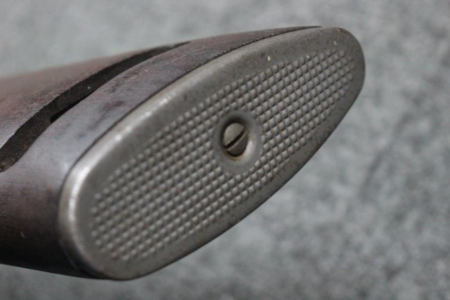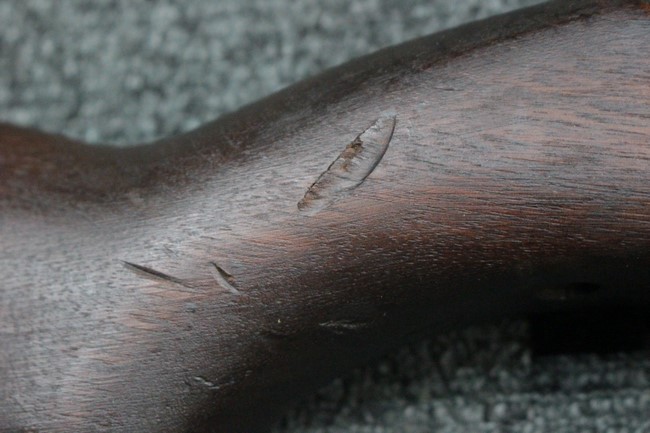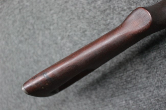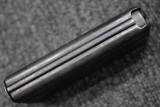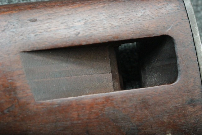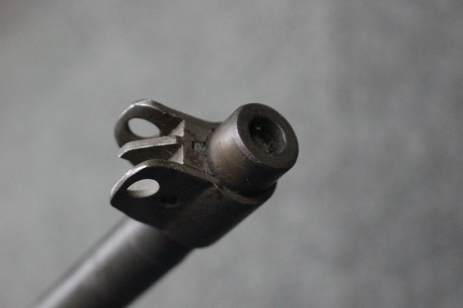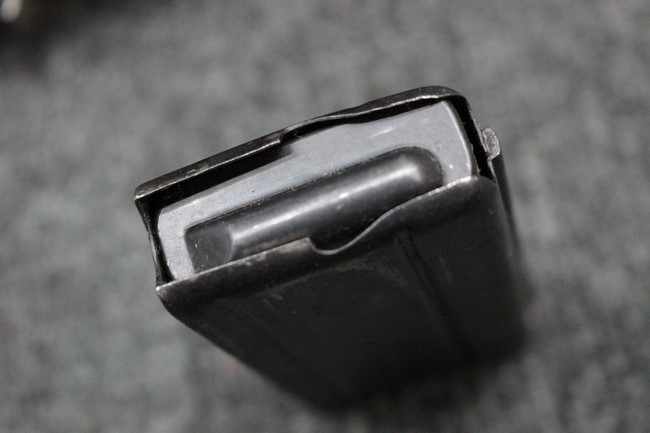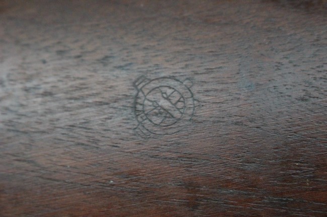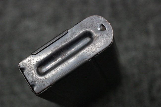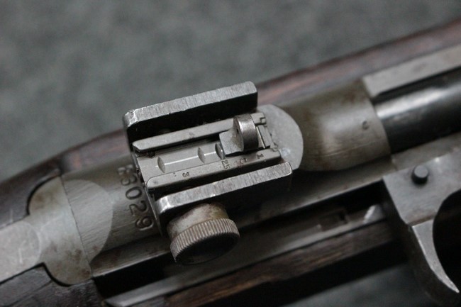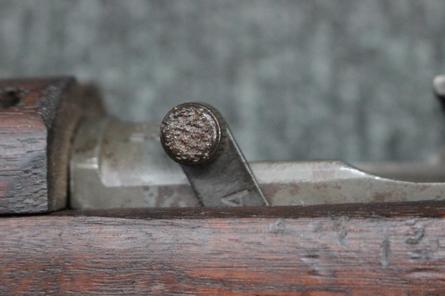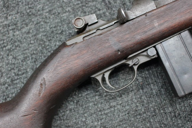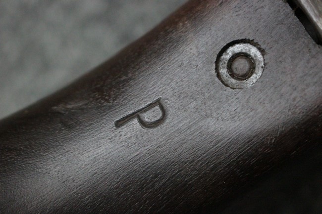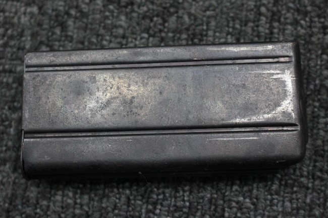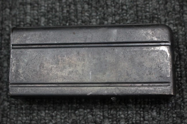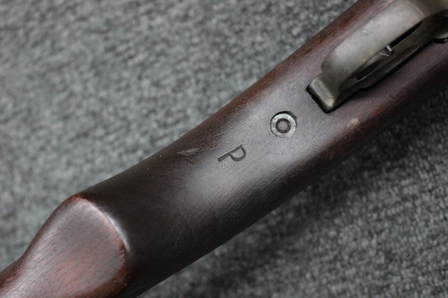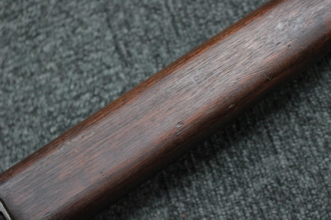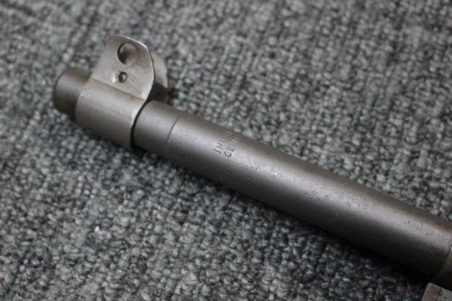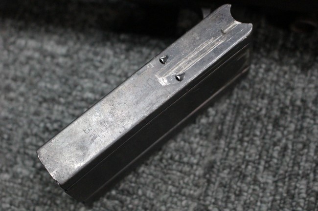 金属部はパーカラジング仕上げが残り、目立った傷はありませんが、全体的に表面サビや退色がみられます。木製ストックは打ち傷、擦り傷が散見されますが、アッパーハンドガードとの色味もそろった良好な状態の物です。グリップ部分前面には「P」刻印、ストック右側面にはクロス・キャノン刻印が確認出来ます。セレクター表面には若干の朽ち錆が出ていますが小気味よく作動します。 バット・プレートは表面仕上げが若干落ちて鉄の地肌が見えていますが、目立った破損等は見受けられず、しっかりとした状態が保たれています。 リア・サイトの作動もしっかりとしています。 付属のマガジンは15連タイプとなっています。マガジンスプリング、トリガーテンションはありません。ボルトが開いた状態で固定された新加工品です。(OS)