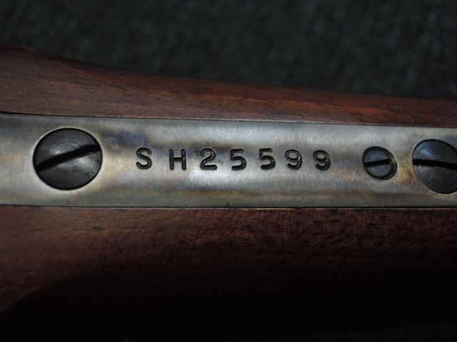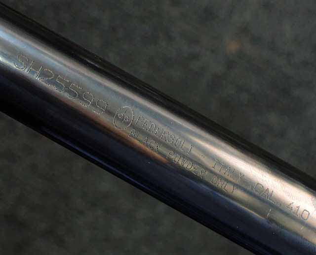 本品はフレームのタング部にシリアル??SH25599があり、また銃身下部にも同じ「SH25599」のシリアルと、イタリアのデビッド・ペデルゾーリ社製の復刻品であることを示す「db」のマークと「PEDERSOLI-ITALY」の刻印があります。 さらに「CAL.410」「BLACK POWDER ONLY」の刻印があり、410番のブラックパウダー仕様の散弾銃であることがわかります。