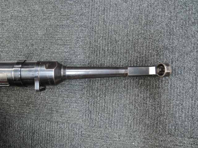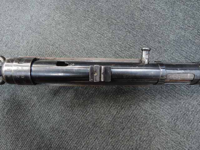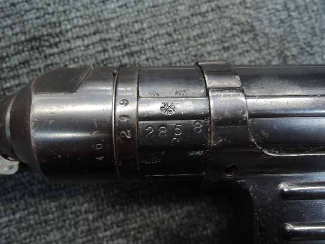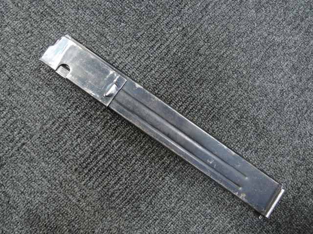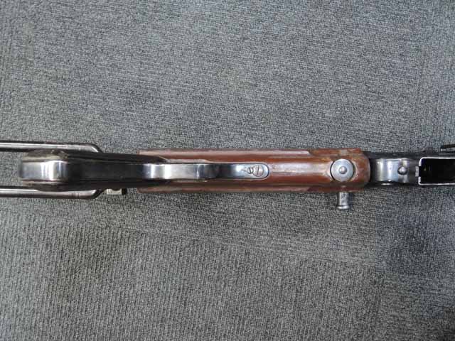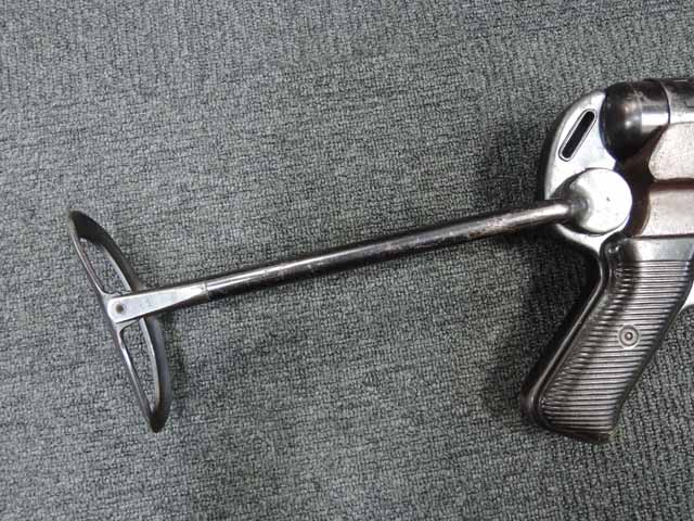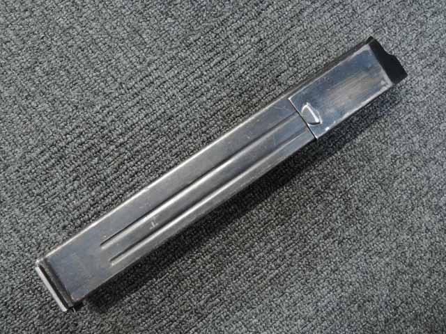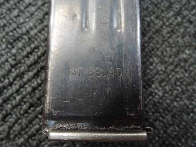 本品は全体に適度な使用感が見受けられ、金属部はやや小傷や擦れが見られるものの、表面仕上げも大部分で残っています。 マガジン・ハウジング部周辺やストック右面の根元付近に僅かな朽ち込みが見られますが、落ち着いておりあまり目立つものではありません。 やや気になる点としてプレス製コッキング・ハンドル・セーフティーの裏側にクラックが見られます。 こちらは操作時にやや注意が必要ですが、現状脱落したり割れてしまう心配はありません。 ベークライト製のハンド・ガードやグリップについてはやや角部に磨耗が見られるものの、その他打ち傷や擦れを除いて目立った破損や欠損等は見受けられず、しっかりとした状態が保たれています。 合金製のバレル・レスト表面は焼付塗装が剥落して地金っぽくなっている印象ですが大きな腐食や欠損等は見られません。 リア・サイトの起倒やマガジンの着脱、ストックの展開操作等は問題なく行う事が可能です。 折り畳みストックの展開及び収納時の操作はタイトで、小気味良くロックされます。 構造上極僅かな遊びが見られるものの、十分許容レベルです。 付属のマガジンには「MP.38u.40」及び1942年製を示す「kur 42」の刻印が入っており、若干の小傷や擦れは見られるものの、大きな凹みや変形等は見受けられず、オリジナルのブルー仕上げが全体に残った良好な状態が保たれています。 マガジンは装着時に僅かに前後に遊びが見受けられますが、勝手に脱落するようなことは無く、しっかりロックされます。 また、マガジンにはスプリングが入っています。