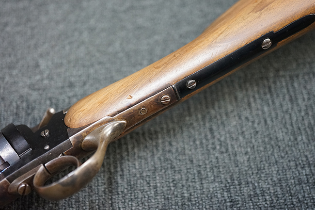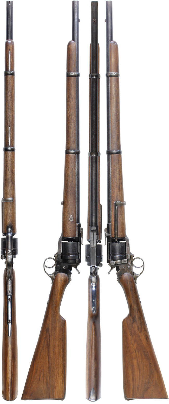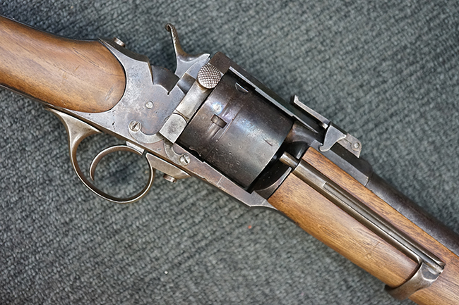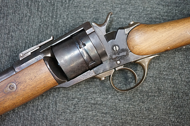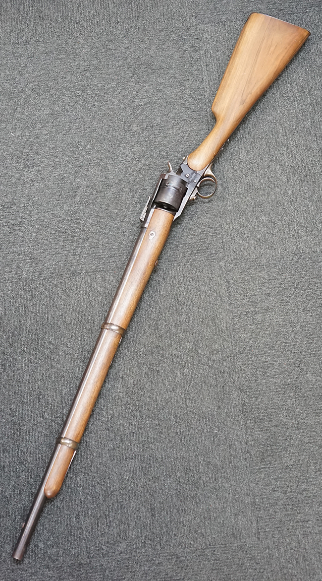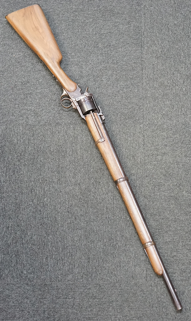 ペラン Mle1865 リボルビング ライフルはフランスのパリ9区 (51 rue Laffitte Paris) にあったPERRIN & CIE. BTE. Paris社で1873年から1880年代に生産されました。 ルイ・ペラン (Louis Perrin) が設計したMle1865 リボルバーをライフルにしたモデルです。 ペラン社の作品は現存数が少ないためあまり知られていませんが、1845年に設立したガン・メーカーかつ発明会社で、1851年のロンドン万博及び1855年のパリ万博で受賞歴があります。 南北戦争中には米国政府にリム・ファイアのリボルバーを輸出しています。 1855年、1858年、1859年、1865年にパーカッション (管打式)、ピン・ファイア (カニ目打式)、センター・ファイアの特許を取得しています。 ペラン Mle1865 リボルビング ライフルは口径12mmの6連発、ダブル・アクション専用のセンター・ファイアです。 手動のエジェクター・ロッド、リーフ・サイト、前部と中央部の二カ所のバンドで留められた軍用タイプのフォア・グリップを装備しています。 元はリボルバーとセットで試作品がフランス陸軍のトライアルに提出され、シャスポー ライフルとルフォーショー ピストルの組み合わせの対抗馬として用意されました。 残念ながらリボルバーとライフルのいずれも採用される事はありませんでした。 しかしながらフランス軍の将校、特に陸軍将校は当時の仏軍用拳銃がパーカッション (管打式) またはピン・ファイア (カニ目打式) リボルバーだったのに対し、ペリン Mle 1865は当時の最新式の独自で開発されたセンター・ファイアだったので私物として非常に好評でした。 ライフルについてもセンター・ファイアという当時の先進的な技術を使ったにも拘らずシャスポー ライフルに負けたのは、ライフル モデルの弾薬が拳銃弾と殆ど変わらない (ライフル弾は拳銃弾よりも若干ケースの長い22mm) 威力が軍用小銃に適していなかったと軍部に判断されたのではないかと考えられています。
