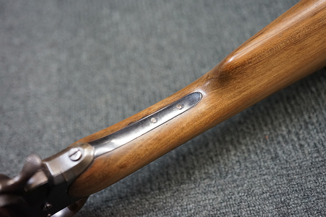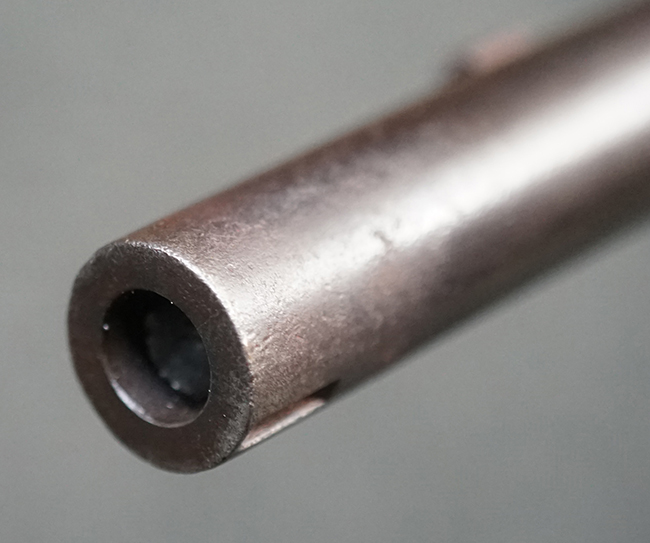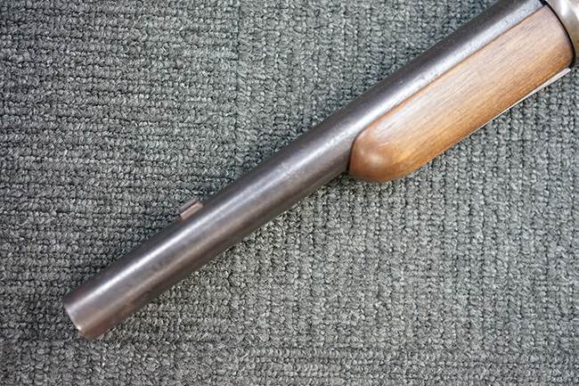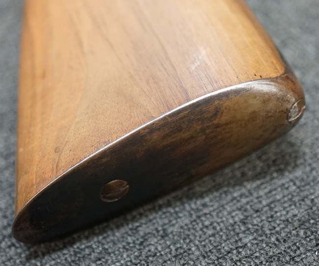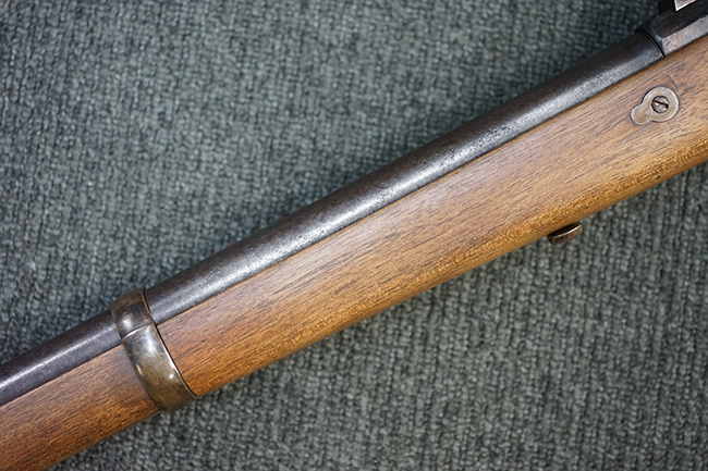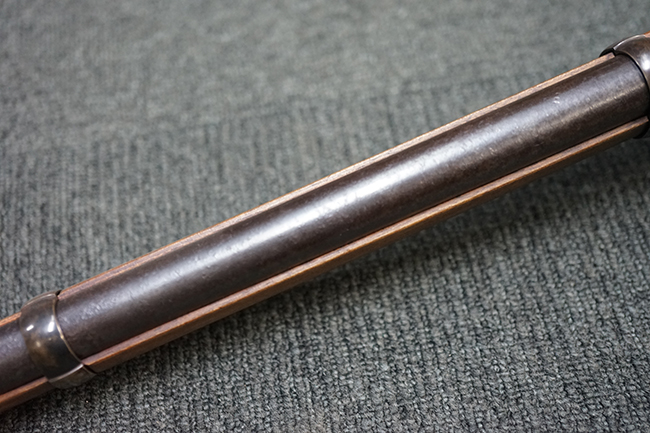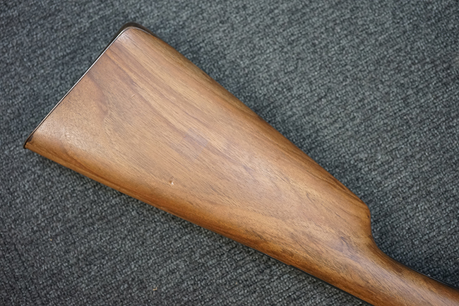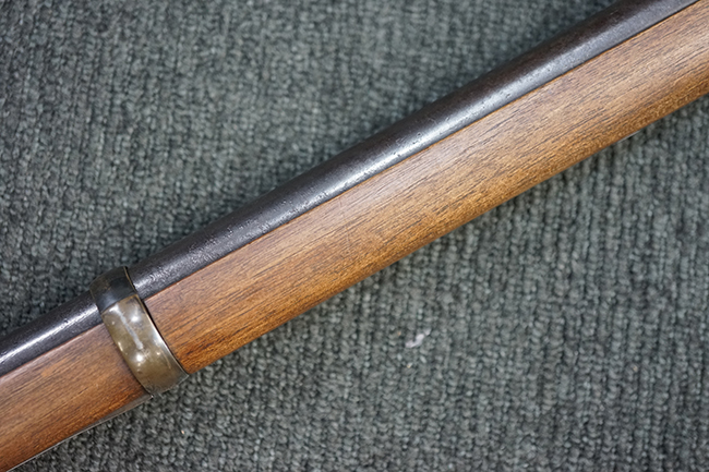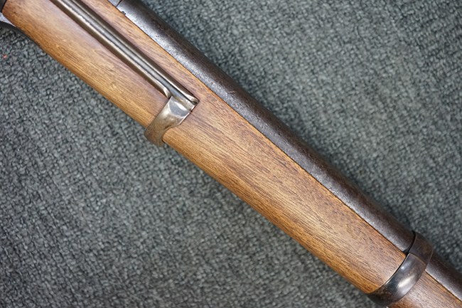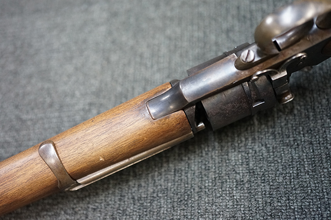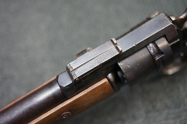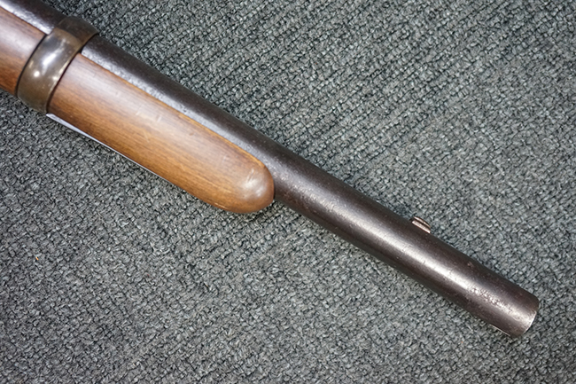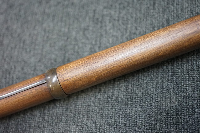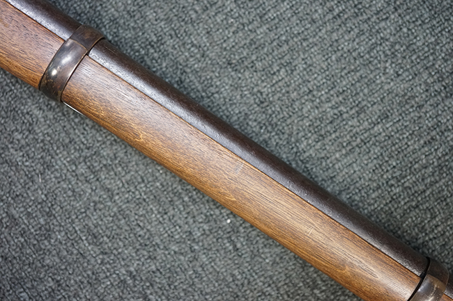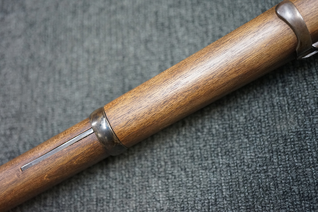 本品の金属部は全体に仕上げ直しが行われており、若干の表面錆や朽ち込み痕が散見されるものの、目立った破損や欠損等は見受けられず、概ねしっかりとした状態が保たれています。 木製銃床及びハンドガード部についても丁寧な仕上げ直しが行われており、バット・プレート取り付け部下部付近に僅かに痩せが見受けられるものの、各部に目立った破損やガタつきなどは見受けられず、比較的良好な状態が保たれています。 傷み易いバット・プレート部については、やや経年による褪色や僅かな表面錆痕が見られるものの、目立った変形や朽ち込み等は見受けられず、銃床への取り付けもガタつきもなくしっかりとしています。 フロント・バンド及びリア・バンドに若干のガタつきが見られるものの許容範囲で、簡単に外れてしまうような事もありません。 完全に無可動化されており、ハンマー及びトリガーとの連動は有りませんが、シリンダーはフリーで回転します。 尚、ハンマーは固定されており、トリガーテンションはありません。 前方に倒れる独特の構造のローディング・ゲートの開閉やリア・サイトの起倒、ローディング・レバー操作については問題なく行う事が可能です。