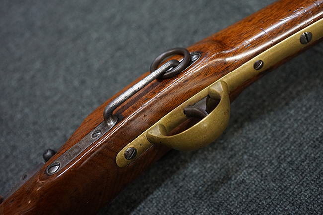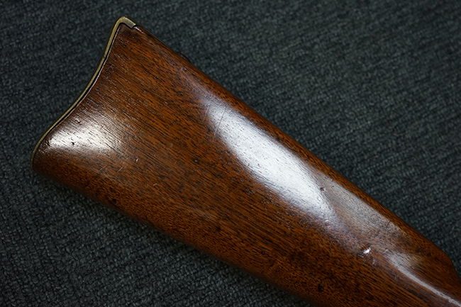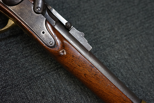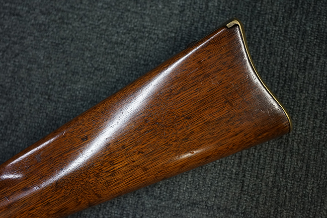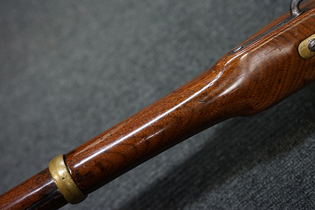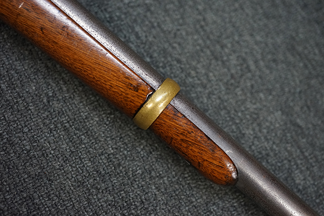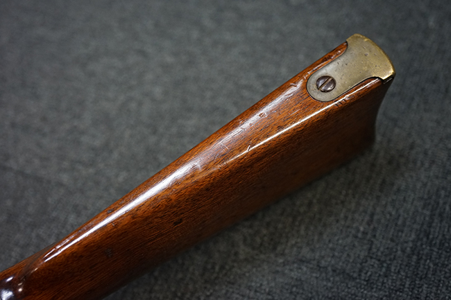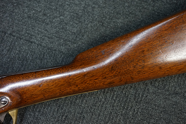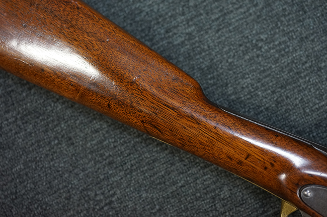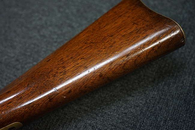 本品は160年以上前に生産された古式銃としてはとても良い状態の品で、特にウォルナット製の木部は南北戦争当時のオリジナル仕上げが完全に残った非常に美しい品です。 銃身及び他の鉄部はオリジナルの仕上げは落ちているものの、古式銃独特の時代錆が良い感じでついており美しいストックとマッチしています。 真鍮製のバレル・バンド、トリガー・ガード、バット・プレートは近年の手が加えてられない良い黄金色に時代が着いたものです。