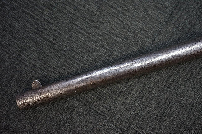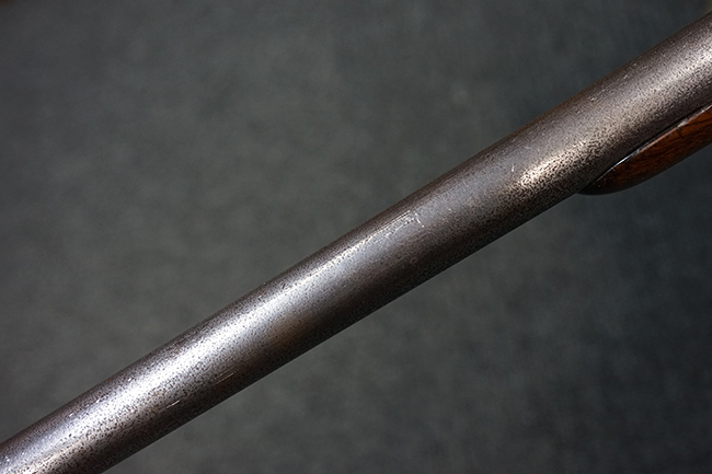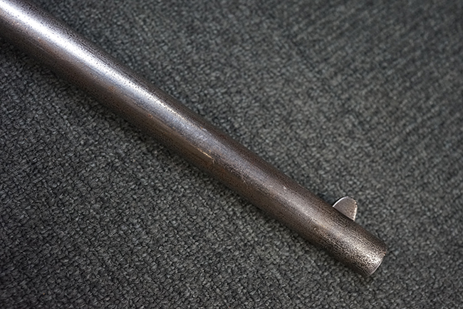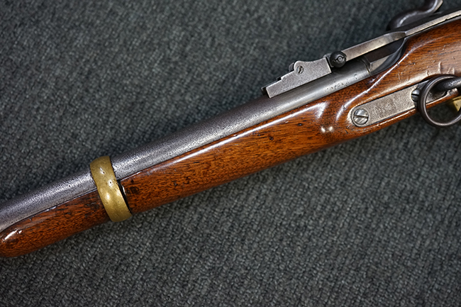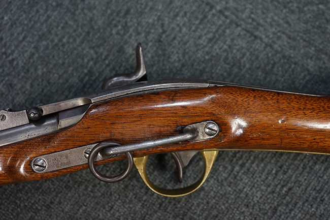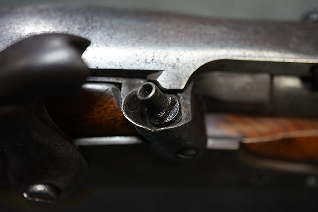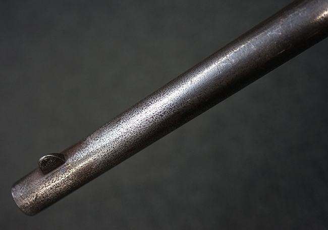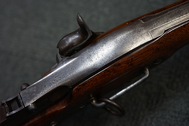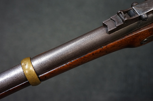 リア・サイトはV字型の三段階フリップ式になっており、300ヤードから500ヤードまでの射程があります。 リア・サイトの作動も完全です。 銃口の溶接はマズル・クラウンより1cm以上深く(奥)にあるので、辛うじて三条のライフリングが確認出来ます。 メリル M1863 カービン、2nd モデルは本品が無可動銃として輸入された唯一の品で、 南北戦争時の騎兵銃を集める上で欠かせない一挺です。 (MM)