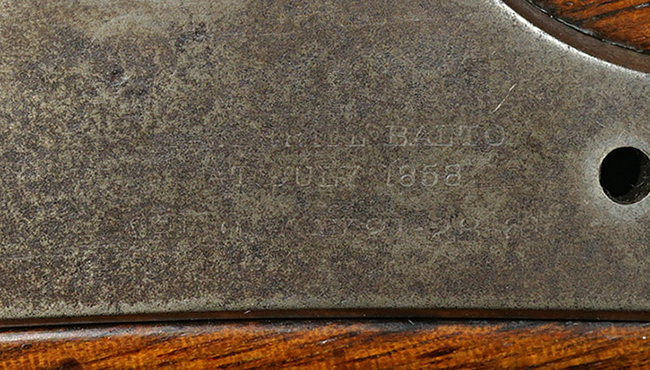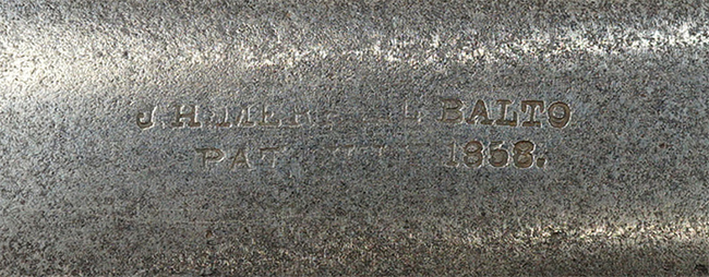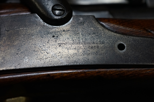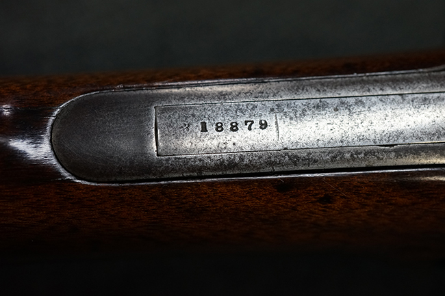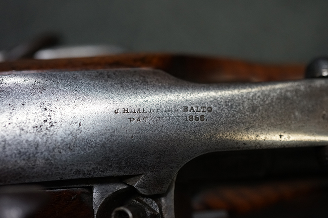 レシーバー上部のブリーチ・レバーの上に「J.H. MERRILL BALTO. (一行目)、PAT. JULY 1858(二行目)」の刻印が打ってあります。 またサイド・プレートの後方(ハンマーの後ろ)に製造年を表す「1864」の年号が、そしてハンマーの前方には「J.H. MERRILL BALTO. (一行目)、PAT. JULY 1858(二行目)、APL. 9 MAY 21-28-61(三行目)」の刻印が打ってあります。 ブリーチ・レバー上の刻印は比較的判読し易いですが、サイド・プレートの刻印は薄くなっています。 ブリーチ・レバー上面後部にはシリアル No.の「18879」が入っています。またサイド・プレートとこの真鍮製のバレル・バンド、トリガー・ガード、バット・プレートの三点共に「&」の刻印が打ってあります。