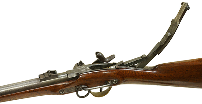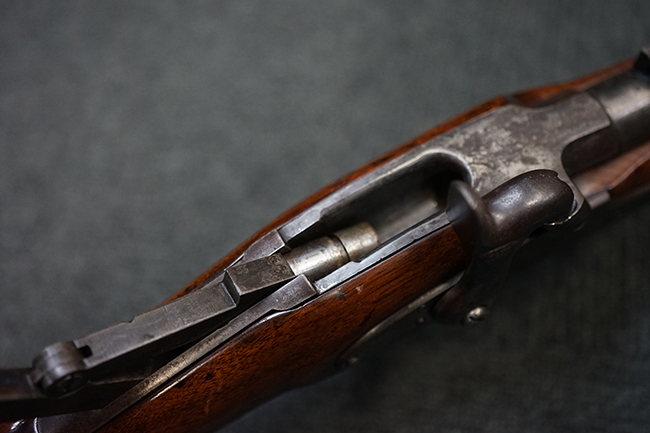 レシーバー上部のブリーチ・レバーを両サイドのラッチを2cmほど前方にずらしてロックを解除し大きくレバーを後方に上部に起こして装填する特殊な構造でした。ブリーチ・レバーを完全に解放するとブリーチから実包を押し込むプランジャーも連動し後退し、装填が可能になります。 装填後、再度ブリーチ・レバーを前方に戻すとプランジャーが前方に移動して実包をチャンバーに送り込みます。 そして当時の主流である右側面のサイド・ロックにあるハンマーを起こし、ニップルに雷管を被せて射撃可能状態 いなります。
