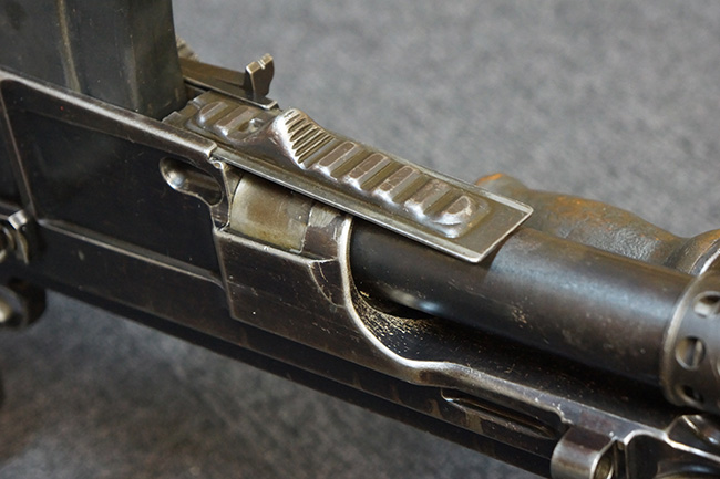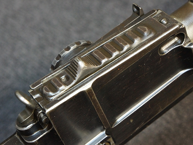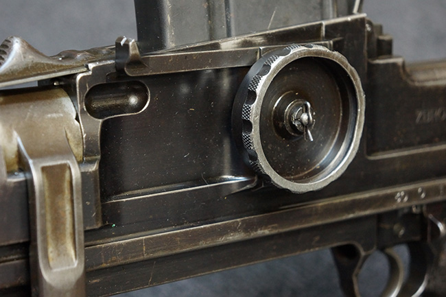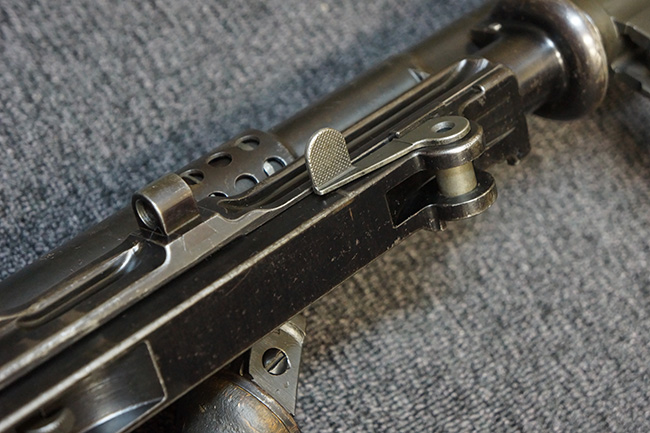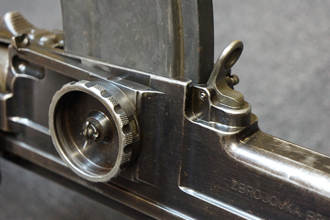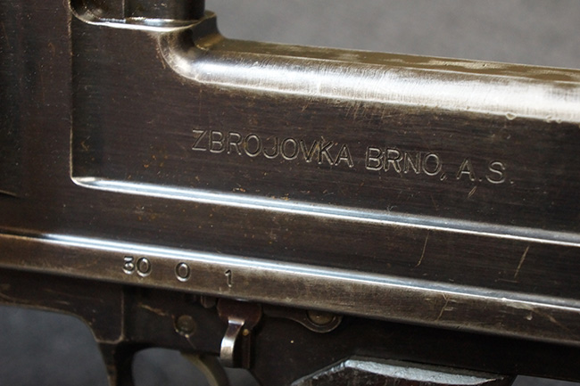 本品の機関部左側面にはチェコのZBで製造された事を表す「ZBROJOVKA BRNO, A.S.」の刻印が入っています。 セレクター表示については、「30(連射)」、「0(安全位置)」、「1(単射)」の数字表記となっています。 また、機関部後端の上面にはシリアルNo.が打刻されています。
