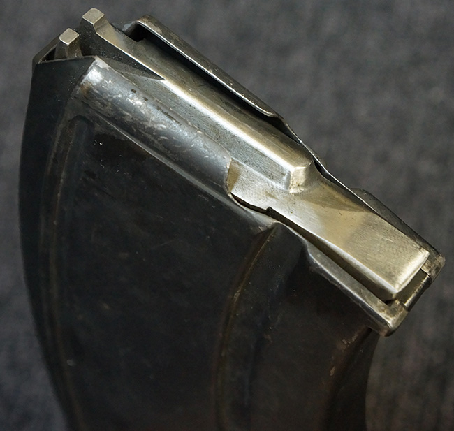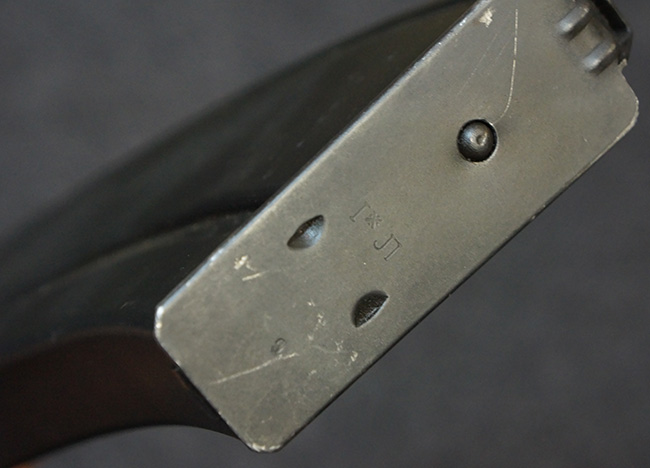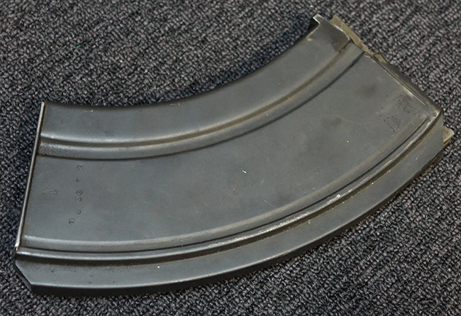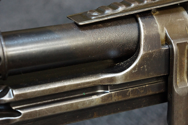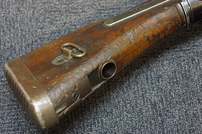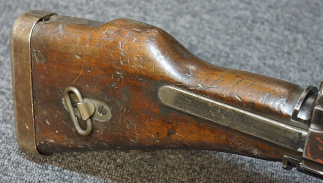 キャリング・ハンドルやバット・ストック、ピストル・グリップといった木部は全体に打ち傷が散見されるものの、目立った破損等は見受けられず、しっかりとした状態が保たれています。 グリップ左側面前部に長さ約2cmのヘアライン・クラックが見受けられますが、強度的には影響の無いレベルです。 付属のマガジンにはマガジン・スプリングは入っていません。