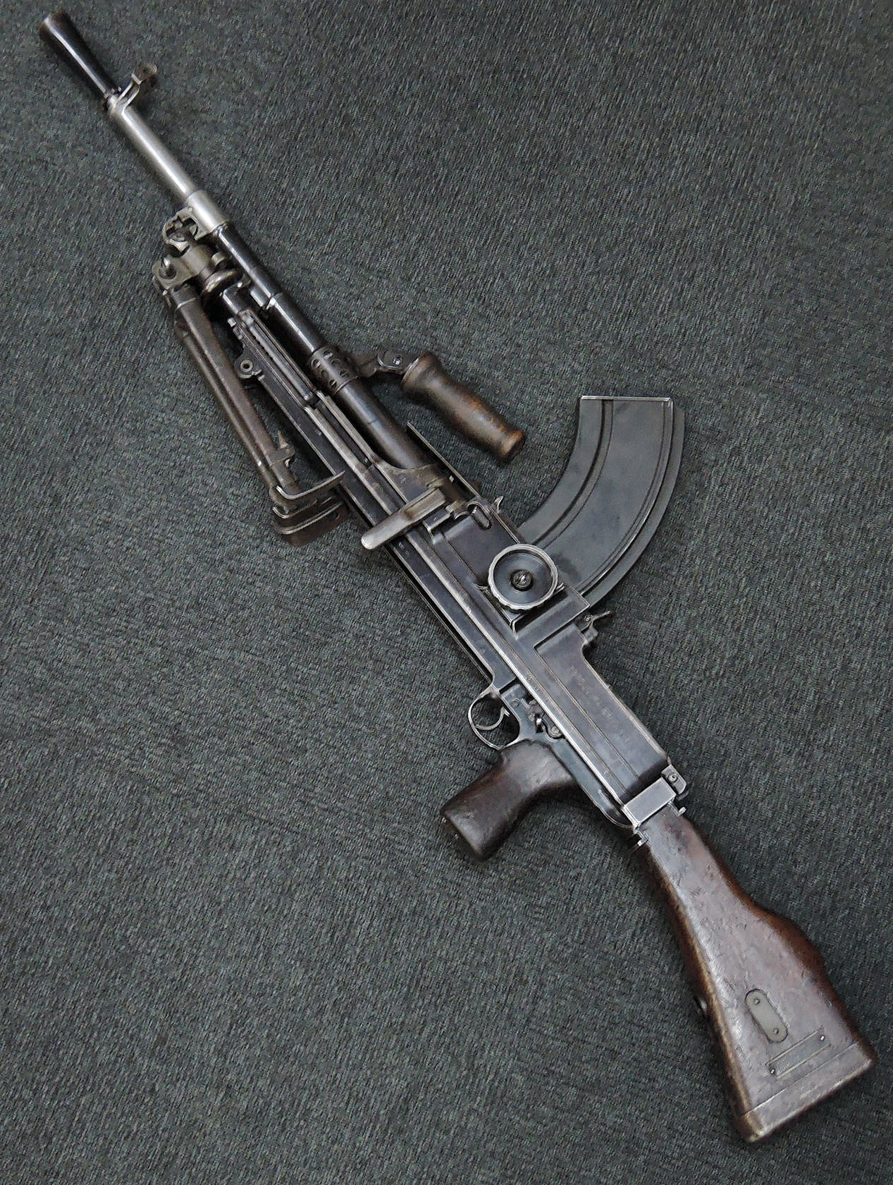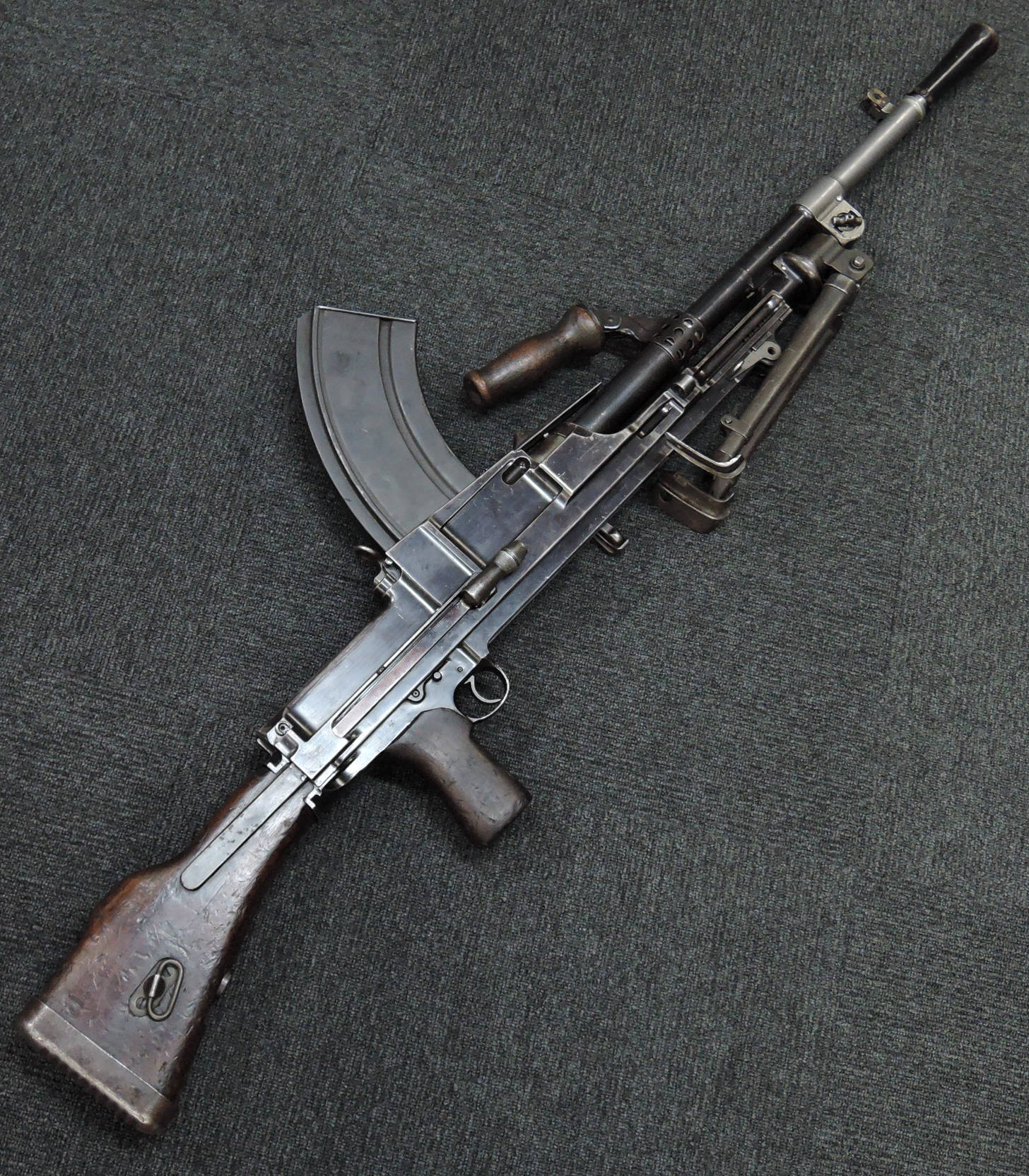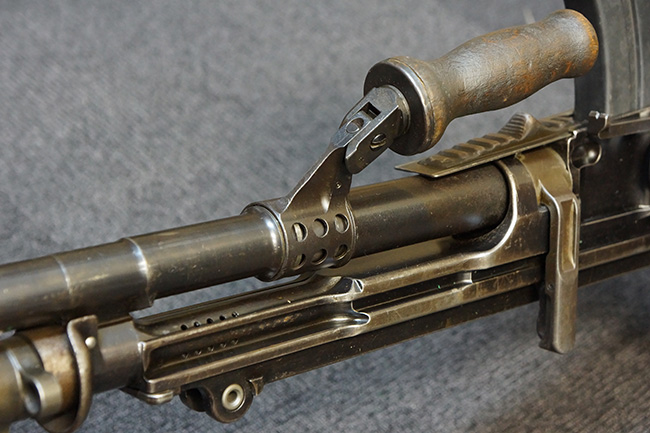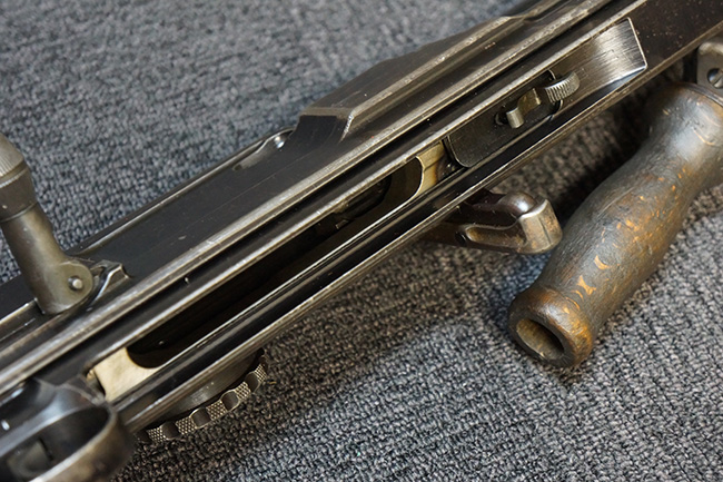 第一次世界大戦後の1920年代、英軍はそれまでの主力軽機関銃であったルイス軽機関銃に代わる新たな軽機関銃のトライアルを開始しました。 1930年代に入るとチェコ製のZB Vz.26の改良型であるZB Vz.27軽機関銃 (後に更なる改良型のZB Vz.30軽機関銃) を新たに候補に加えてトライアルが続けられ、最終的にはこのZB系軽機関銃に改良を加えた物がブレン軽機関銃として英軍に制式採用されました。 本品はそのような新型軽機関銃のトライアル過程の中で1930年代前半に試作されたZGB Vz.33と呼ばれるプロトタイプです。 ZGBとはチェコのZB(ゾブロヨフカ・ブルーノ)及び大英帝国を表すGBを組み合わせた物です。