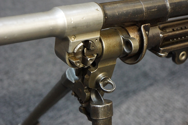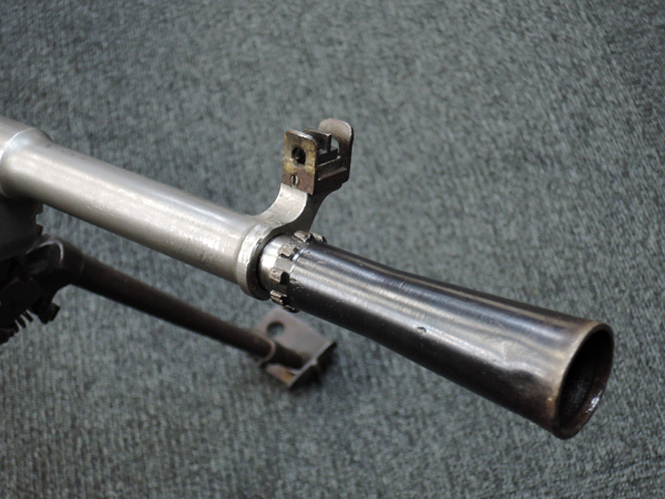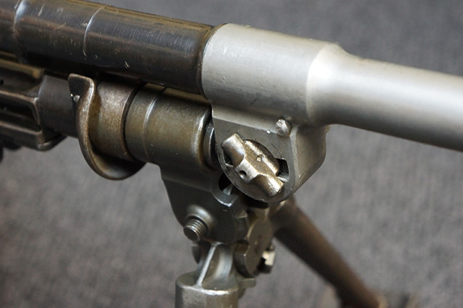 1933年に試作されたZGB Vz.33にはモデル2及びモデル3と呼ばれるタイプが存在し、本品はモデル3の特徴であるレシーバー左側面の光学サイト用ブラケットが装備されていないにも関わらず、ガス・シリンダーの形状についてはモデル3に近い事から、モデル2及び3の過渡期のプロトタイプであると思われます。 また、ZGB Vz.33以前のモデルでは銃身に冷却用のバレル・フィンが装備されていましたが、本品にはZGB Vz.34以降のタイプに装備されるようになった冷却フィンの無い銃身が組み合わされています。 しかしながら、この銃身についても銃口部のフラッシュ・ハイダーが別パーツとなっており通常のブレン用とは異なる事から、各種試作された銃身の1種であると思われます。 (KK)