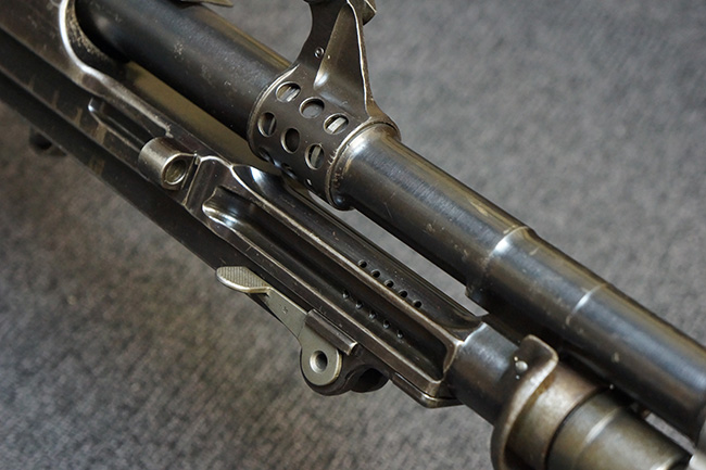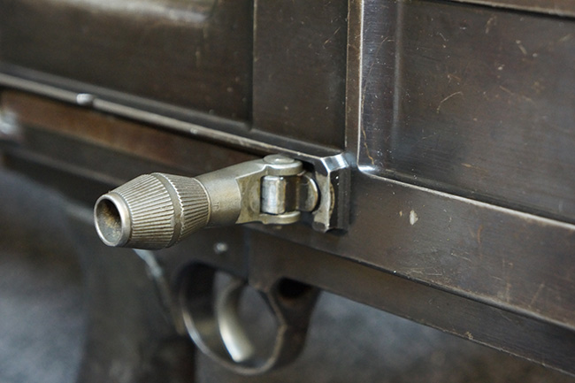 本品の金属部分については、やや使用感が見られ、機関部上面や角の部分等に表面仕上げが落ちている箇所が見受けられるものの、オリジナルの表面仕上げも大部分が残っています。 機関部上面については仕上げが斑状に落ちて鉄の地肌が表れています。 独特な形状のフラッシュ・ハイダーは全体にブルー仕上げが残っております.