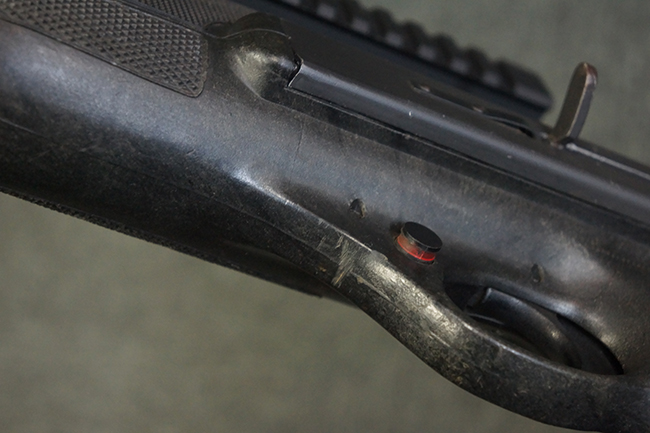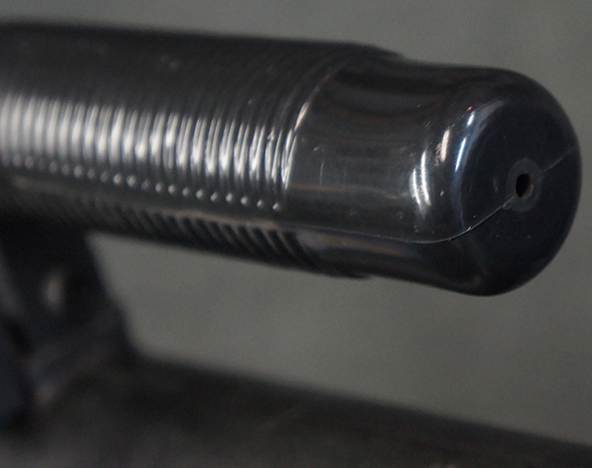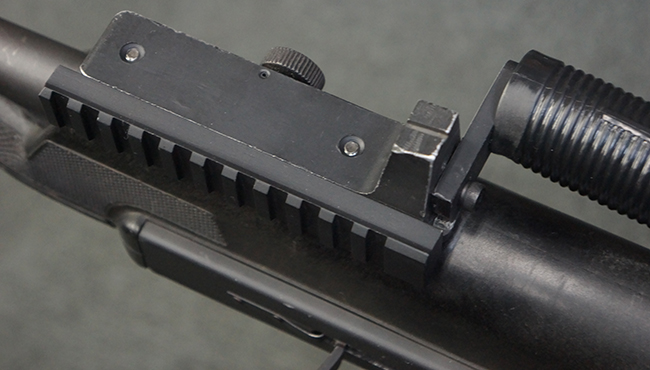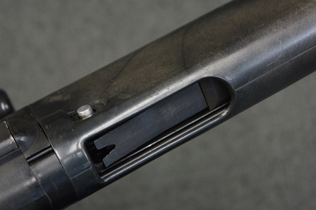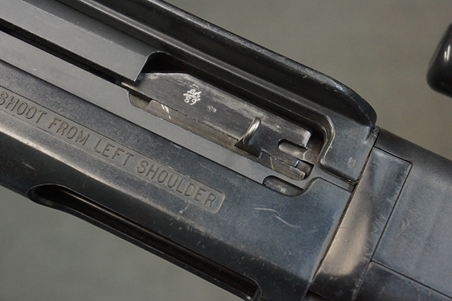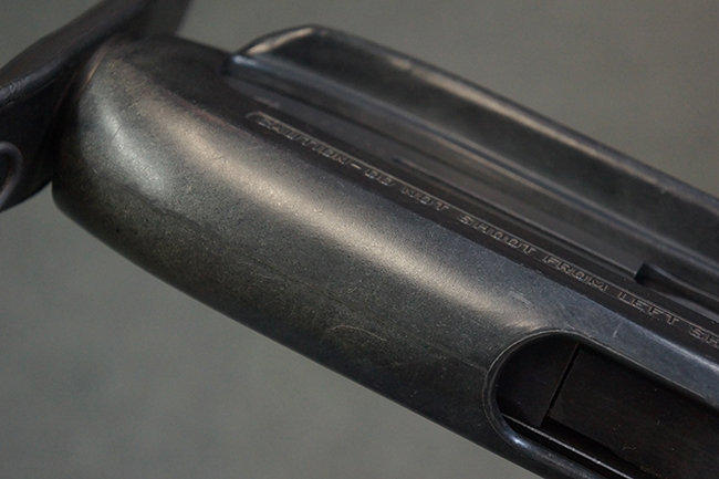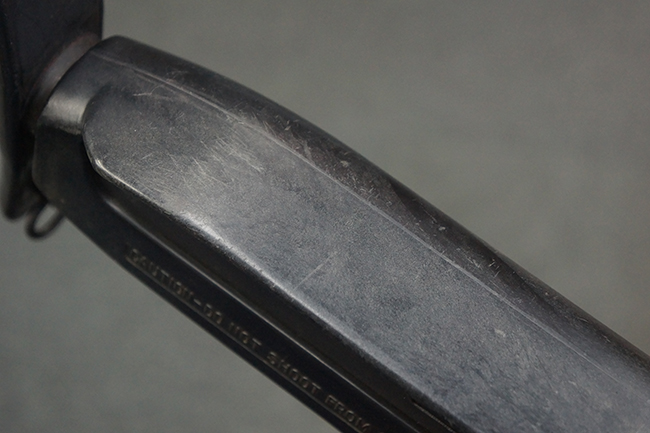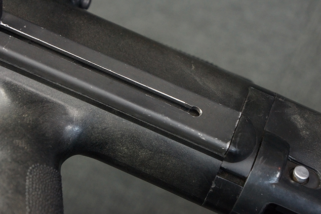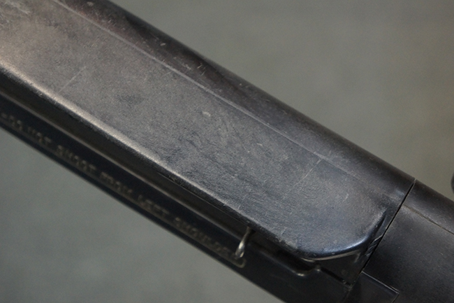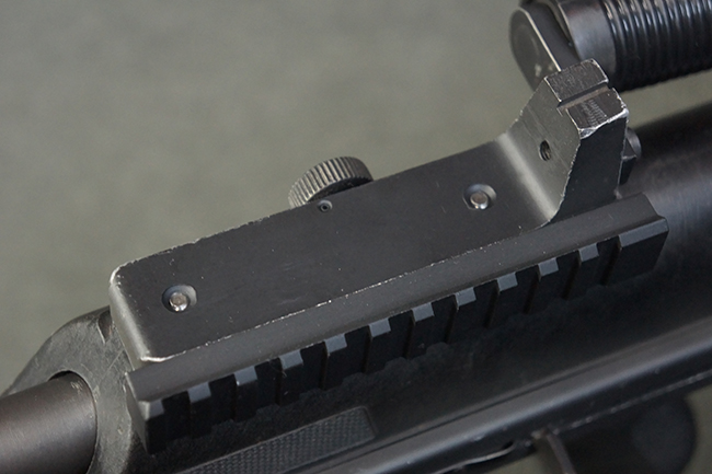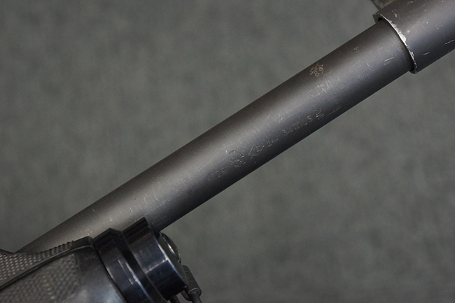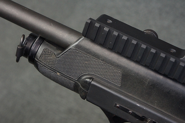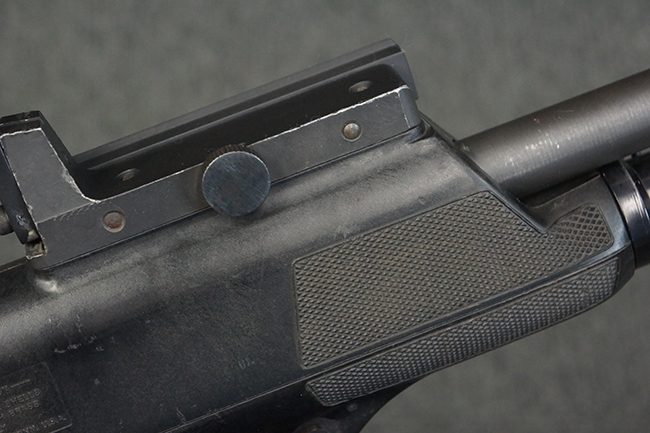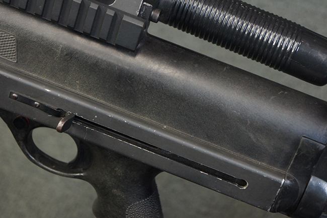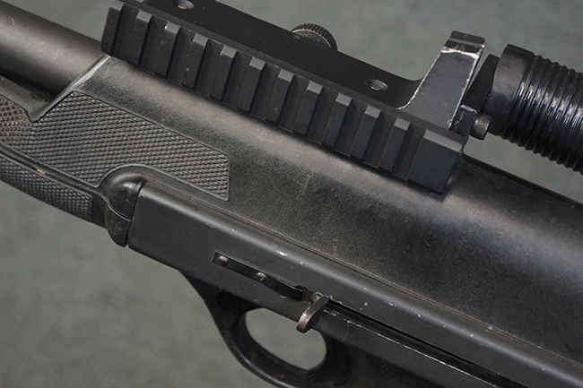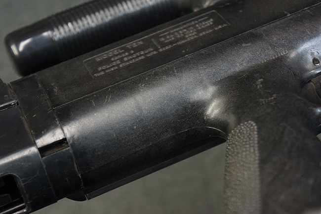 本品は後期型のハイ・スタンダードM10Bで、本体右側面には「MODEL TEN SERIES B POLICE SHOTGUN」のモデル名の他、「THE HIGH STANDARD MFG. CORP. - HAMDEN. CONN. U.S.A.」のメーカー刻印等が入っています。 また、レシーバー右側面後方の排莢口下部には「CAUTION - DO NOT SHOOT FROM LEFT SHOULDER」の注意書きがモールドにより入っています。 本品にはフラッシュ・ライトは付属せず、リア・サイト・ベースの左側面には取り外し可能な20mmのアクセサリー・レールが取り付けられています。