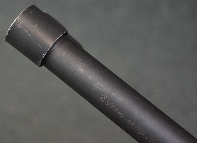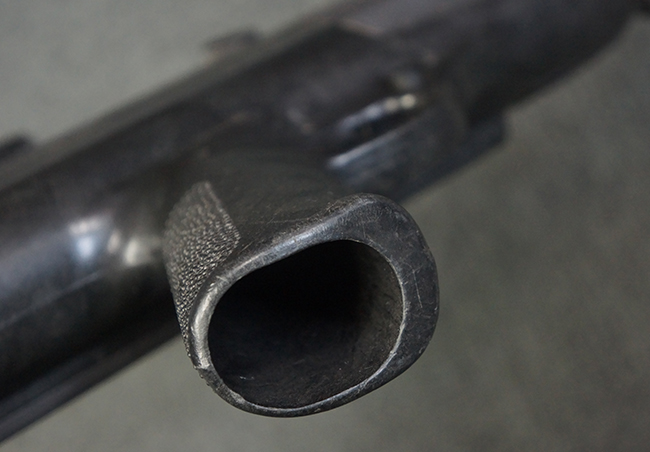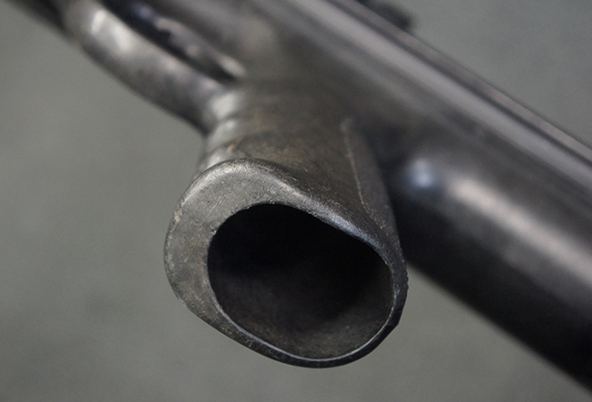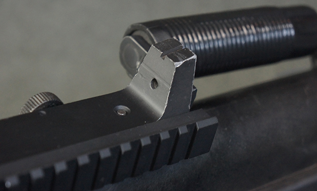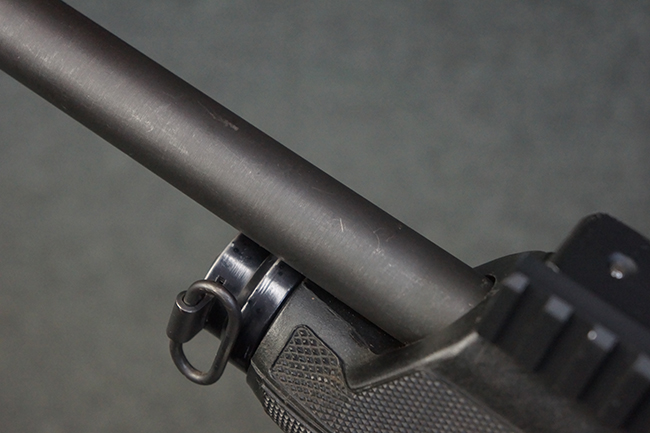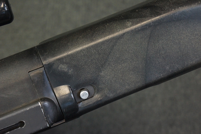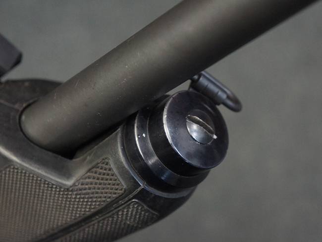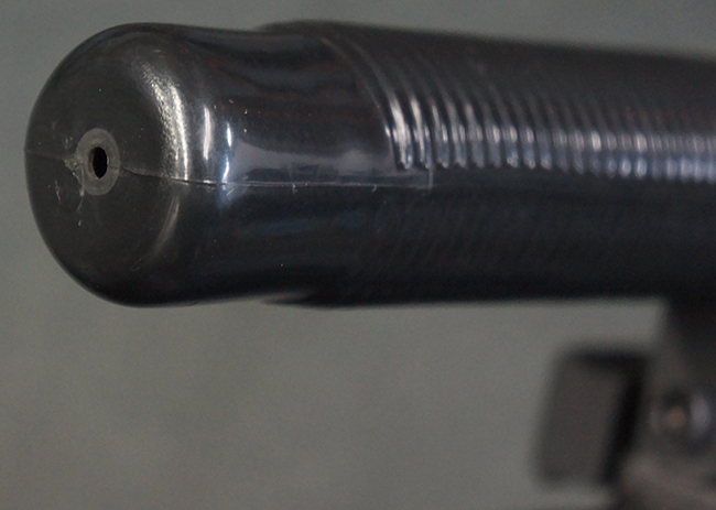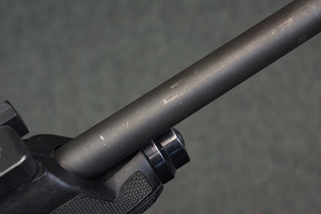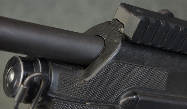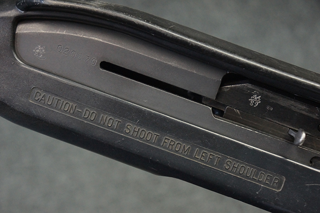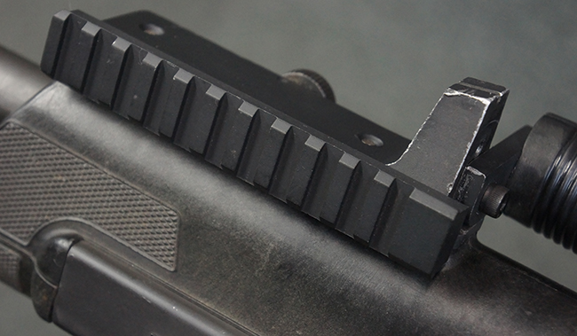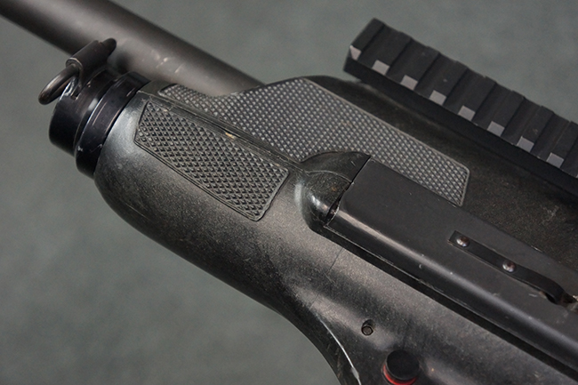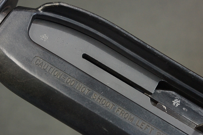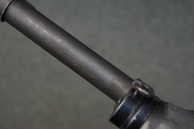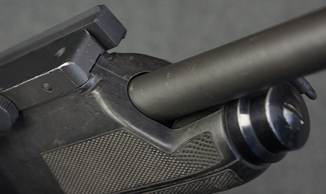 本品は後期型のハイ・スタンダードM10Bで、本体右側面には「MODEL TEN SERIES B POLICE SHOTGUN」のモデル名の他、「THE HIGH STANDARD MFG. CORP. - HAMDEN. CONN. U.S.A.」のメーカー刻印等が入っています。 また、レシーバー右側面後方の排莢口下部には「CAUTION - DO NOT SHOOT FROM LEFT SHOULDER」の注意書きがモールドにより入っています。 本品にはフラッシュ・ライトは付属せず、リア・サイト・ベースの左側面には取り外し可能な20mmのアクセサリー・レールが取り付けられています。
