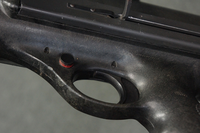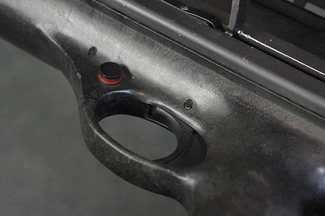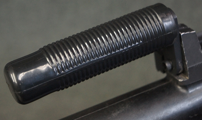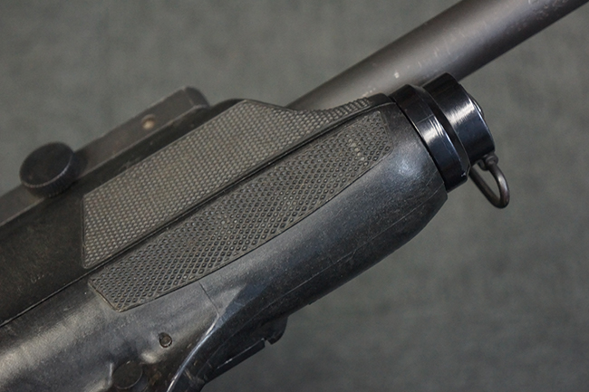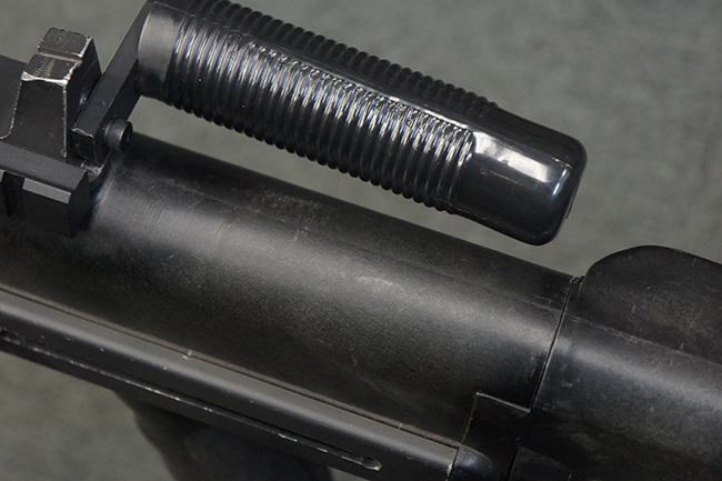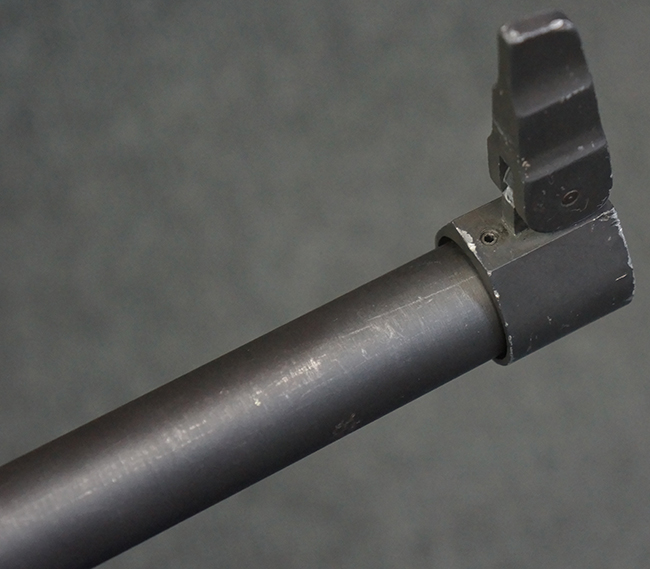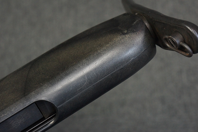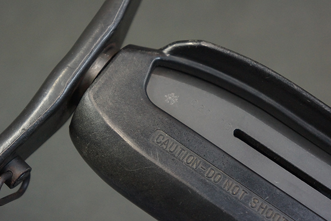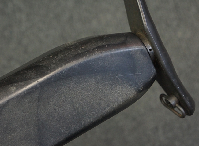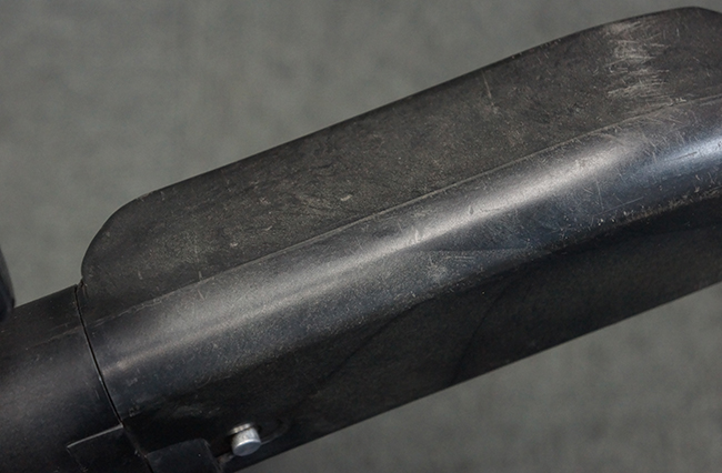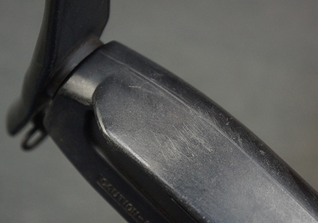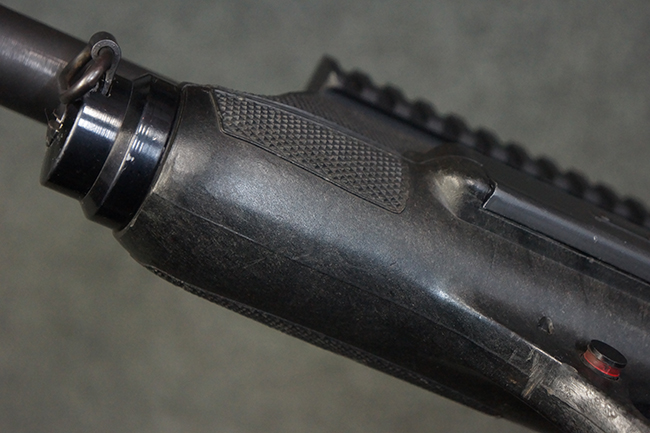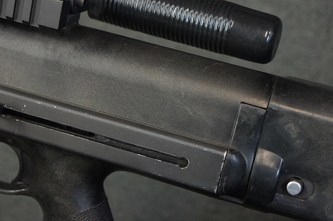 本品は全体にやや使用感が見受けられ、本体を覆う樹脂部は全体にやや小傷や擦れが見受けられるものの、目立った破損や欠損は見受けられず、比較的良好な状態が保たれています。 ハンドガードやグリップ部の滑り止めのモールドについては、若干の打ち傷は見受けられるものの、目立った摩耗は見られず良好に残っています。 銃身等の金属部についても、やや小傷や擦れは見受けられるものの、目立った破損や錆等は見受けられず、オリジナルのパーカー仕上げも比較的残っています。 傷みやすいゴム製のキャリング・ハンドルやバット・プレート部についても、若干の打ち傷や僅かなひびは見受けられるものの、大きな経年劣化や破損等は見られず、しっかりとした状態が保たれています。 フロント・サイトの起倒、バット・プレート部の回転については問題なく行う事が可能です。 セーフティ・ボタンの切り替えについても問題なく、安全位置でトリガーがロックされます。