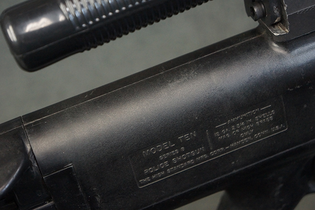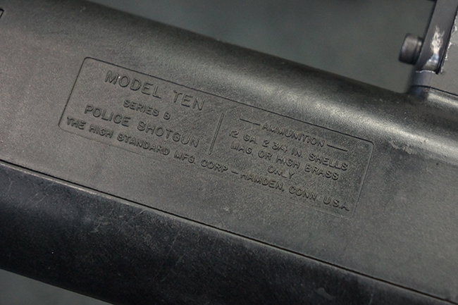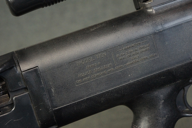 ハイ・スタンダードM10ポリス・ショットガンは、1960年代後半から1970年代初頭にかけて法執行機関向けに販売されました。 しかしながら、指定されている弾薬を使用した場合でも作動不良が頻発した他、トリガーの感覚が掴みにくく、さらに反動でフラッシュ・ライトのバッテリーが損傷する等多くの欠点が指摘され、最終的に使用が中止されました。 また、排莢口が本体右側面後方に設けられているため、右肩からしか射撃できないといった点も欠点とされました。 (KK)