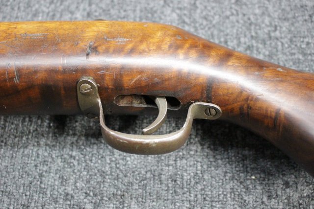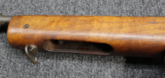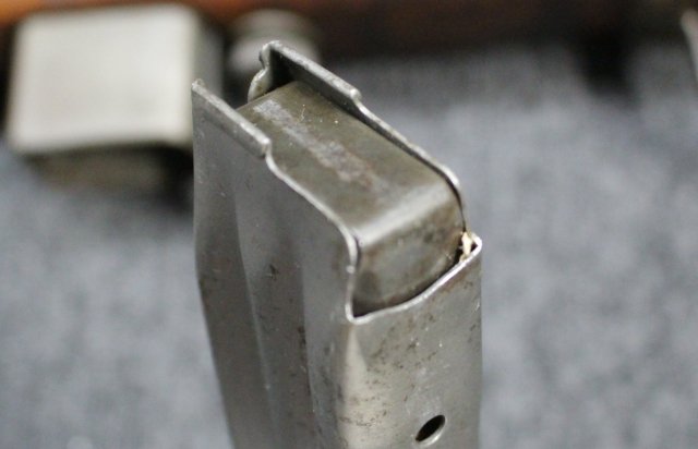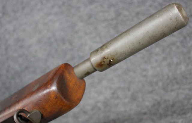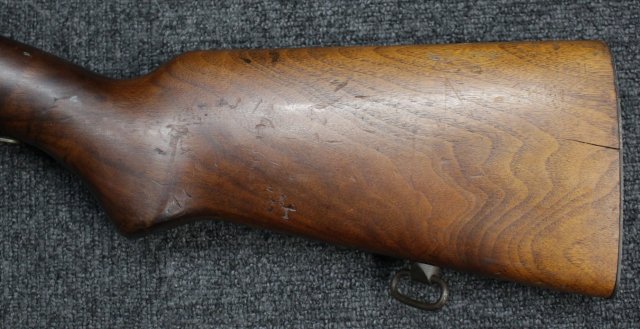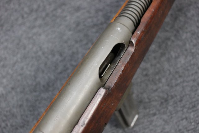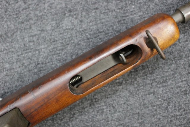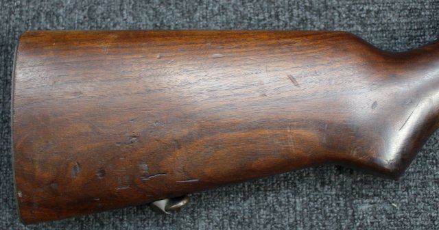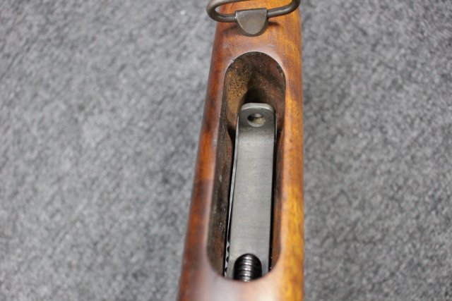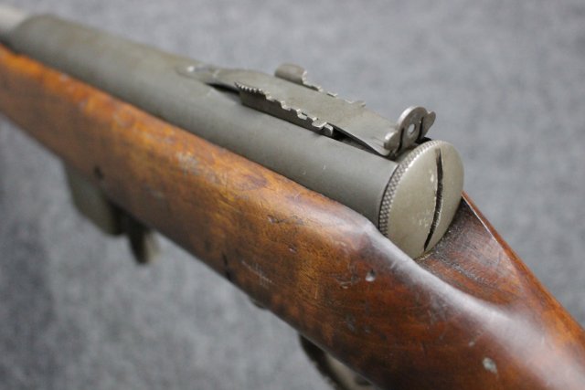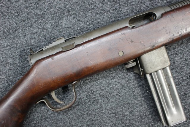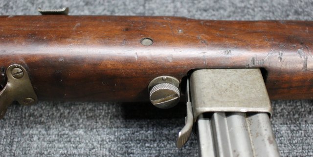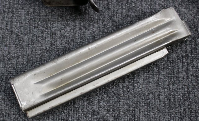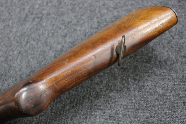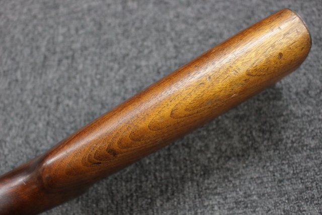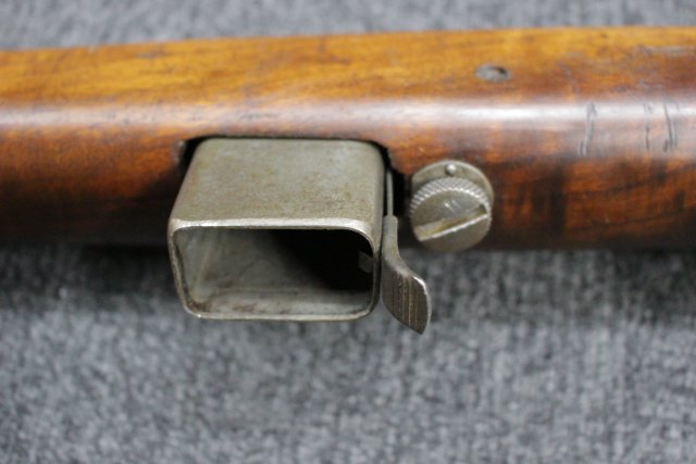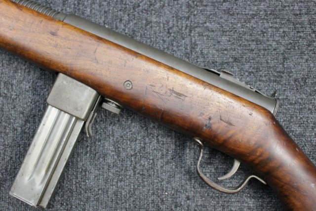 本品は全体に適度な使用感が見受けられ、パーカー仕上げの金属部はやや小傷や擦れ、若干の時代錆が見受けられるものの、目立った欠損等は見受けられず、概ねしっかりとした状態が保たれています。 木部に関しては、全体にやや打ち傷や線傷等は散見されるものの、艶のある仕上げも比較的残った良い雰囲気となっています。また、バット・ストック左側面にヘアライン・クラックが見られますが、現状強度的にはしっかりとした状態が保たれています。 傷み易いバット・プレート部についても、やや打ち傷及び銃床との間に僅かに隙間が見られるものの、大きな変形や目立った腐食等は見受けられず、取り付け自体もガタつきもなくしっかりとしています。 マガジンの着脱やセレクターの調整、リア・サイトのスライダー調整については問題なく行う事が可能です。 付属のマガジンは本体と同じくH&R製で、通常の20連のダブル・カラム・マガジンの両側面に深いリブを入れて12連に装弾数を落とした珍しいタイプとなっています。 マガジンは全体に若干のアタリや仕上げが薄くなり金属の地肌が表れている箇所が見受けられるものの、大きな変形等は見られず、概ねしっかりとした状態が保たれています。 マガジンは装着時にやや遊びが見られますが、概ね許容レベルです。 尚、マガジン・スプリングは入っていません。