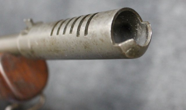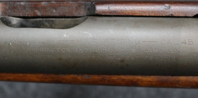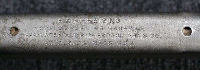 本品のレシーバー上面には「MODEL 50 - H&R REISING - CAL.45 HARRINGTON AND RICHARDSON ARMS CO. WORCESTER, MASS, U.S.A. PAT. PENDING」のモデル名及びアドレス刻印が打刻されています。 レシーバー右側面にはL2608のシリアルNo.が入っています。
