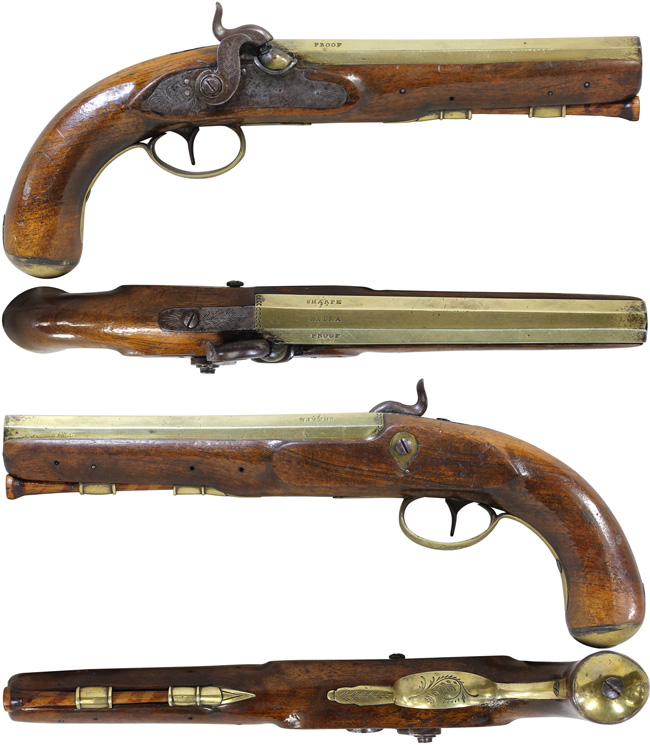 本品は銃身に「Ketland & Co.」の刻印が入っている事から、Thomas Ketland社によって製造された品であると考えられます。 また、撃発方式がフリントロック式ではなく管打ち式である事から、Ketland社の製品の中でも最後期に製造されたと考えられます。 銃身上面にはベルギー・リエージュのプルーフ刻印 (楕円形の中にE.L.G=Liege Epreuveの文字と星のマーク) が入っていますが、これは英国で製造された後、ベルギーのプルーフ・ハウスに持ち込まれて打刻されたものと思われます。 また、銃身上面には英語で「SHARPE EXTRA PROOF」の刻印も入っています。