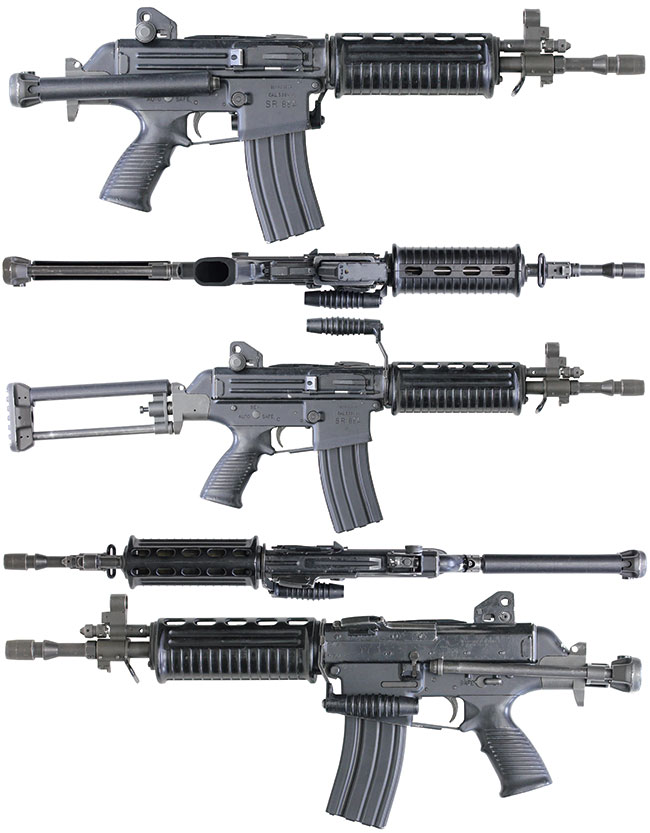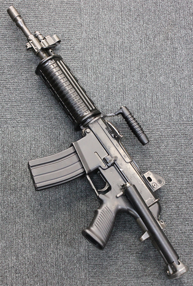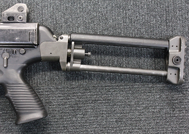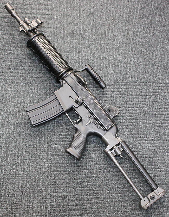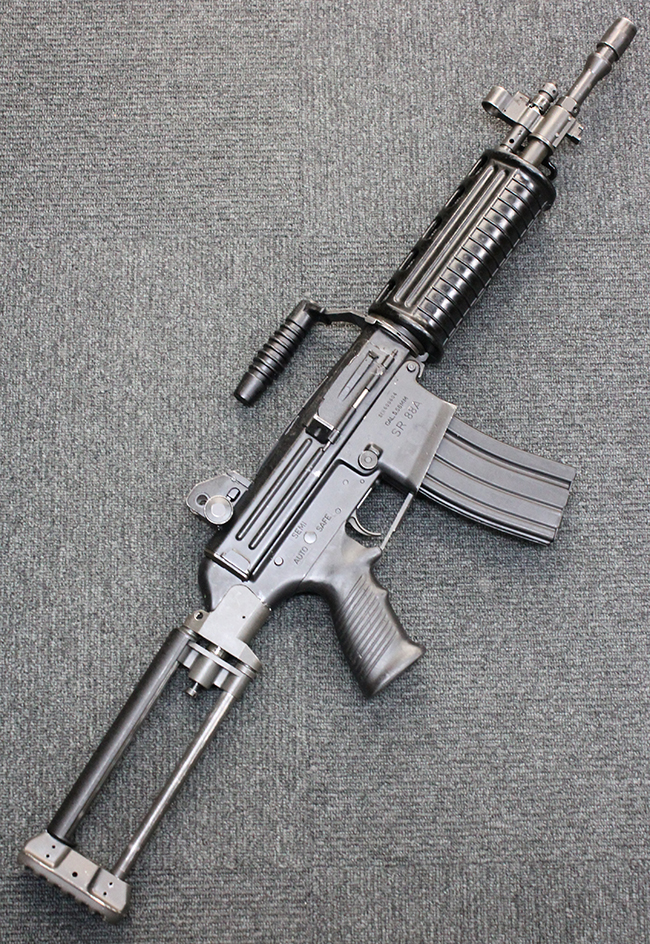 SA88AはSR88のハンドガードやストックをより人間工学に基づいた形状のタイプへと変更する等の改良を加えたモデルです。 SR88Aには固定ストック・モデルの他、伸縮式のストックを装備したカービン・モデルも製造されました。 カービン・モデルの伸縮式ストックは、2本のストック・パイプがレシーバー側面に沿って伸縮する構造となっており、展開時にはバット・プレート部が90°回転してロックされる、FN MINIMI 機関銃のパラトルーパー・モデルと同様の構造となっています。 (TY)(KK)
