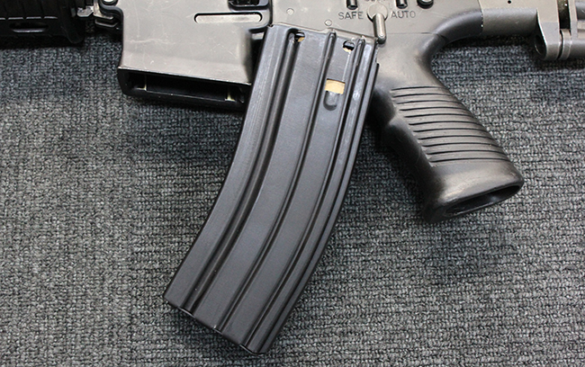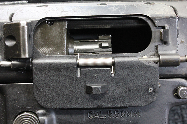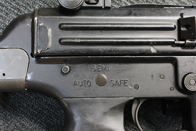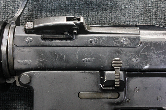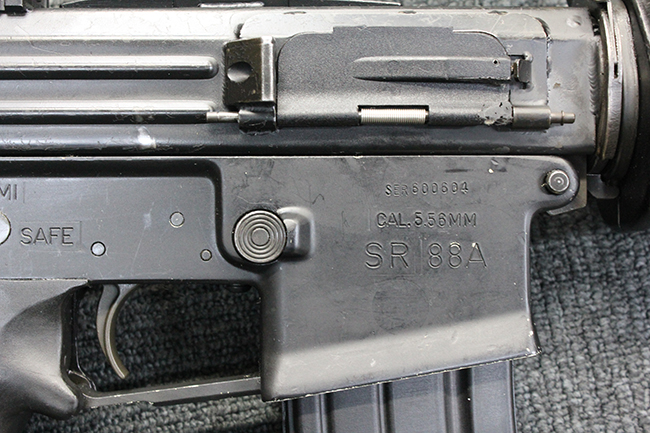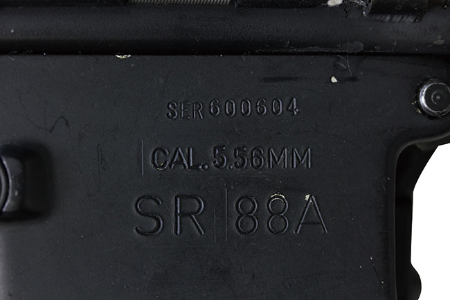 本品はシリアルNo.600604(お客様ご連絡中)の品です。 ロア・レシーバー右側面にはシリアルNo.と同じ位置に「CAL.5.56MM SR88A」の刻印が入っている他、アッパー・レシーバー左側面にはCIS社製造を意味する「MFG.BY CHARTERED INDUSTRIES OF SINGAPORE PTE .LTD」のメーカー刻印が入っており、いずれもはっきりと判読可能です。