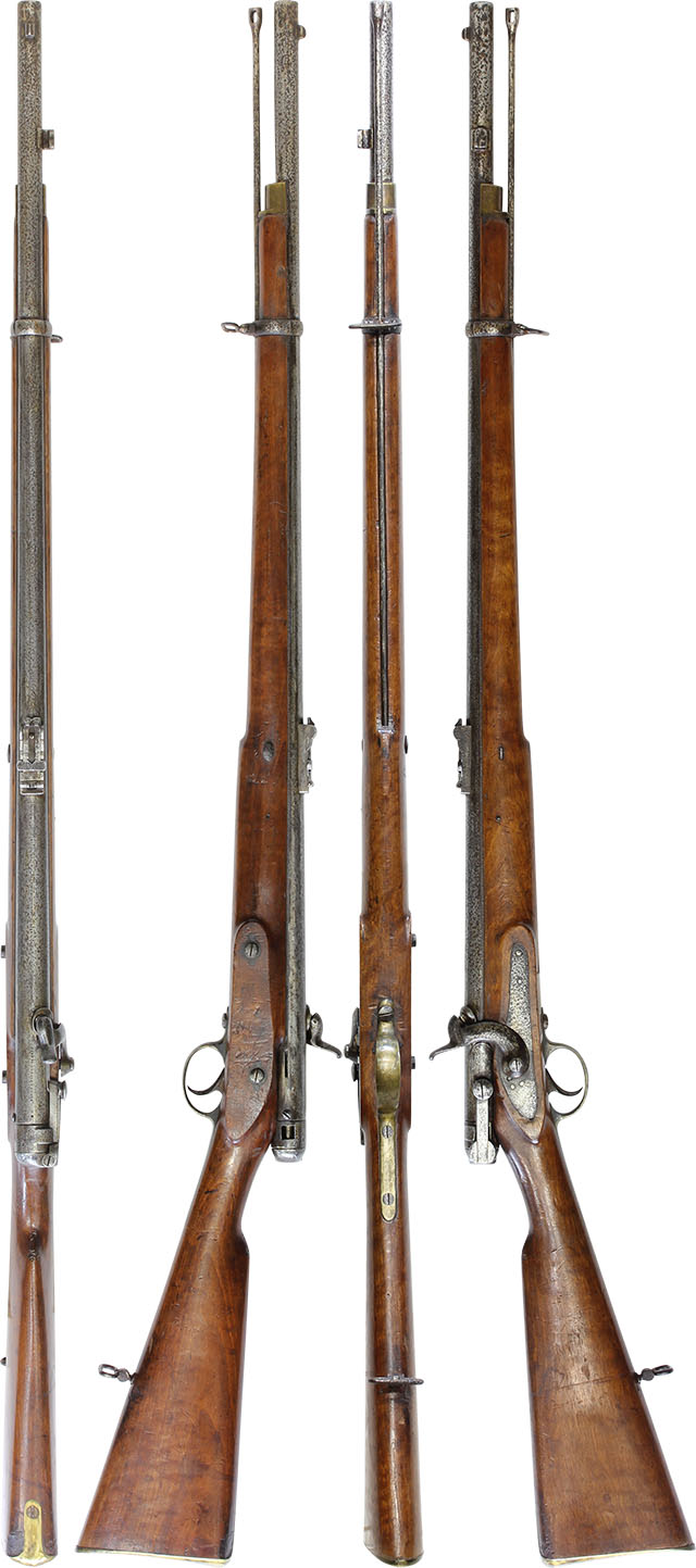 本品は銃身中間部と銃床がウェッジにより固定されており、フロント・バンド下部にスリング・スイベルが設けられた歩兵銃モデルです。 リア・サイトはエンフィールド・タイプの物が装備されており、銃身先端付近の右側面には銃剣の着剣ラグが設けられている事から、軍用として製造された品であると考えられます。 本品の銃身上面には「TERRY'S PATENT」のパテント刻印の他、口径を示す「30 BORE」の刻印、そして「BREECH LOADING ARMOURY Co. LIMITED LONDON」のメーカー刻印が入っています。 銃身を取り外した裏面には、口径を示す「30」の数字の他、「T.W」の刻印、そして銃身を製造したと思われる「J.R.COOPER」のメーカー刻印が入っています。 銃身下面には他にも、王冠の下にBPの文字が入った刻印の他、クロスソードの上に王冠が描かれた刻印の二種類のバーミンガム・プルーフハウスの刻印が入っています。 銃身や尾栓、薬室開放時に操作するレバーには10945のシリアルNo.が入っています。 サイド・ロック・プレートには「TOWER 1866」の刻印が入っています。Tower軍用刻印はロンドン塔にあった英国政府の銃砲検査機関において、軍用として耐えうる品質を有しているか検査を受けた証です。