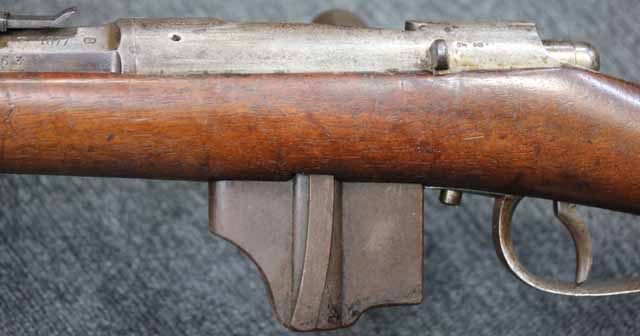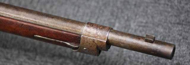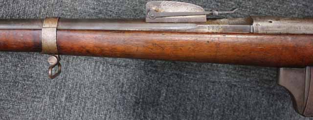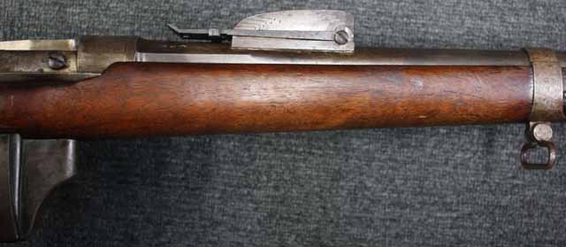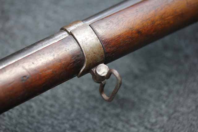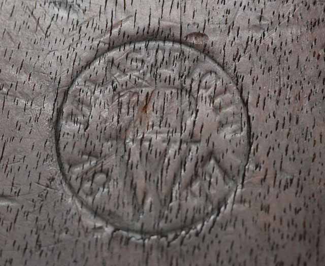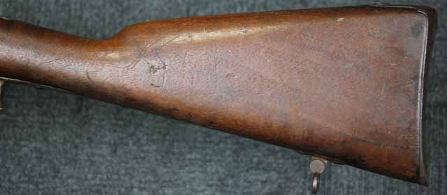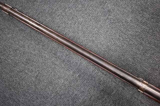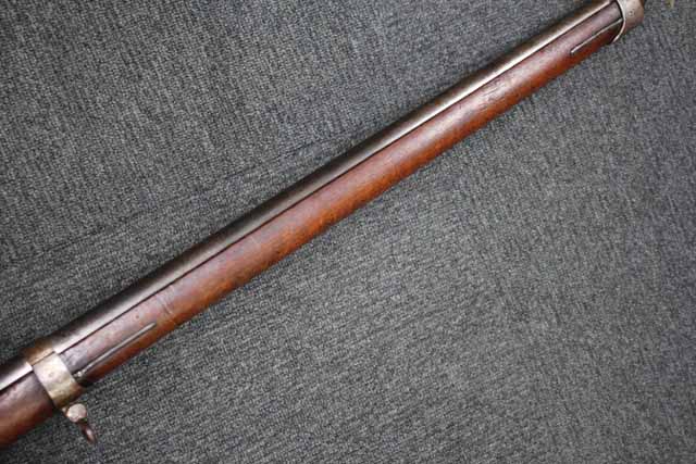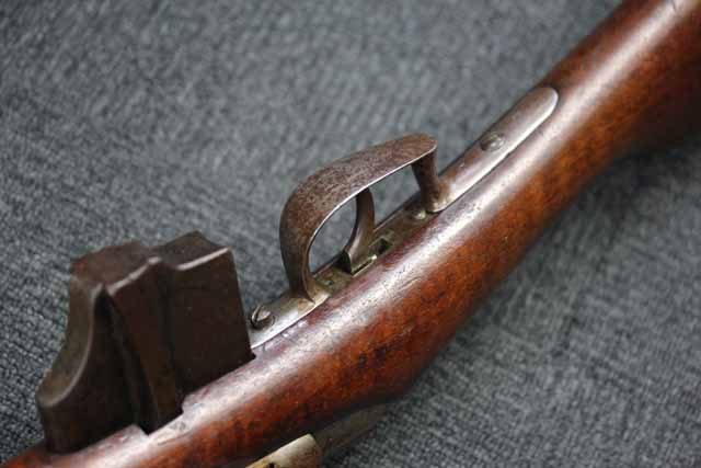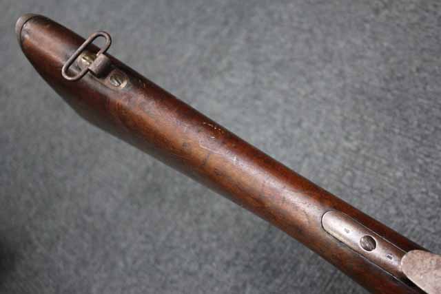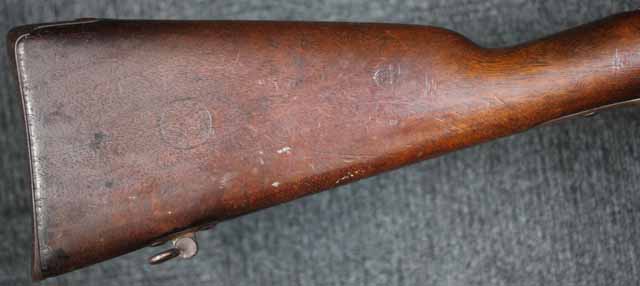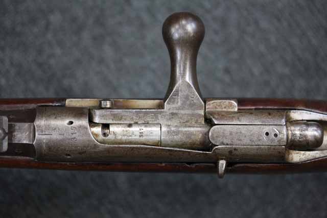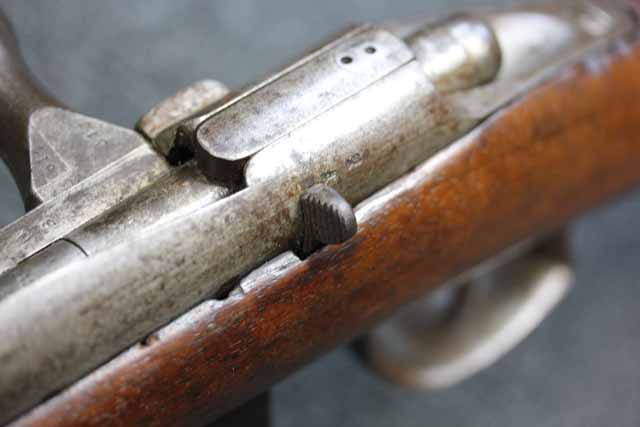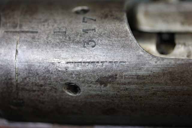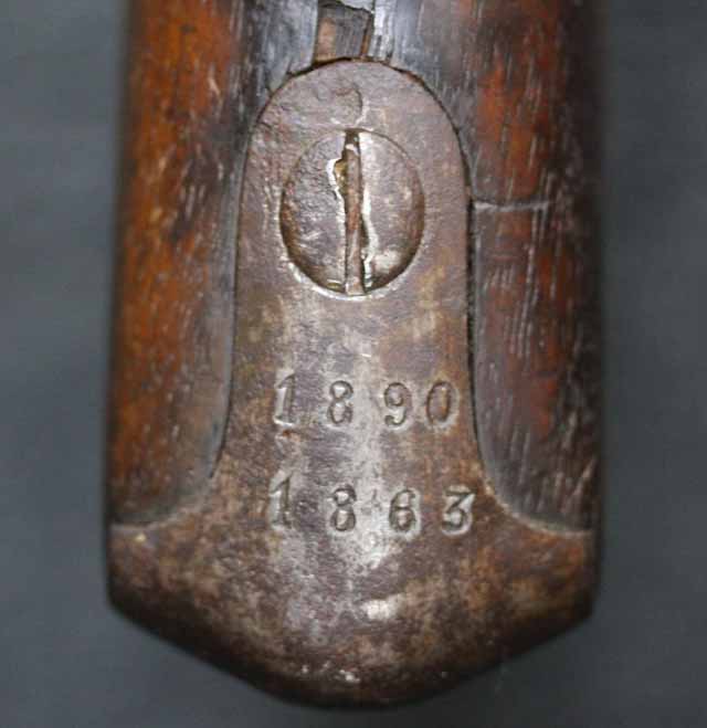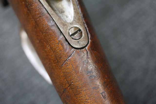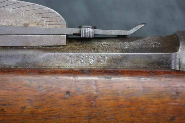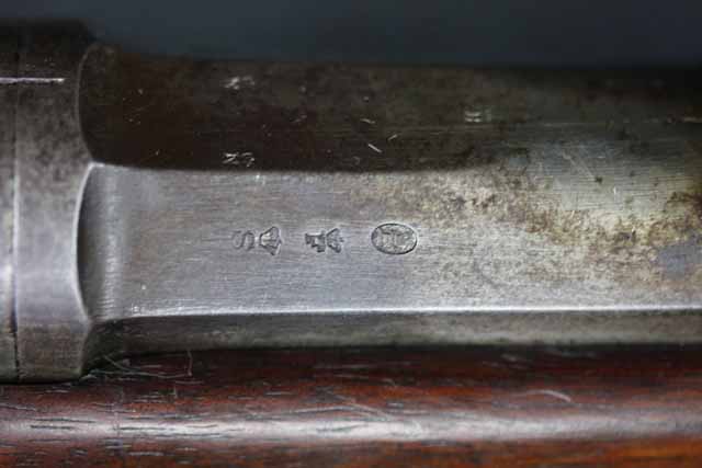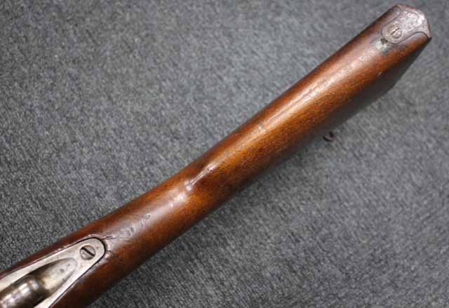 本品はオランダのP.STEVENS社製で、機関部前部左側面には非常に薄くなっているものの、メーカー刻印の一部が確認できます。 本品のシリアルNo.は、機関部やボルト、ボルト・ハンドル前部及び後部、銃身、トリガー・ガード、弾倉でマッチしています。 本品の銃身左側面には1863及び1877の2つの年号が打刻されている他、バット・プレート部分にも1863及び1890の2つの年号が入っています。