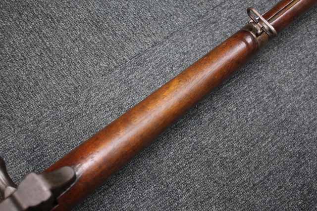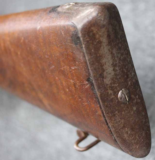 本品の銃身や機関部といった金属部分には全体に時代錆が表れているものの、目立った破損や欠損等は見受けられず、適度な時代感の付いた雰囲気の良い状態となっています。 ボルトなど元々白磨き仕上げであった部分の一部には白磨き仕上げが僅かに残っている箇所も見られます。 木製銃床についてはやや使用感が見受けられ、全体に打ち傷や線傷が見られるものの、大きな破損や欠損等は見受けられず、比較的しっかりとした状態が保たれています。 銃身との取り付け部付近の木部や、バット・ストック上部のバット・プレート取り付け部付近に僅かな欠けが見受けられますが、いずれも強度的に問題のないレベルのものです。 傷み易いバット・プレートについては全体にやや表面錆や朽ち込み痕は見受けられるものの、大きな変形や破損等は見受けられず、比較的しっかりとした状態が保たれています。
