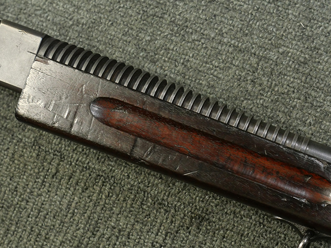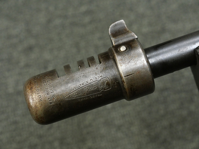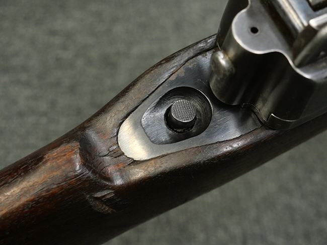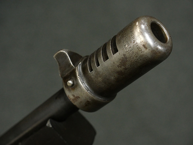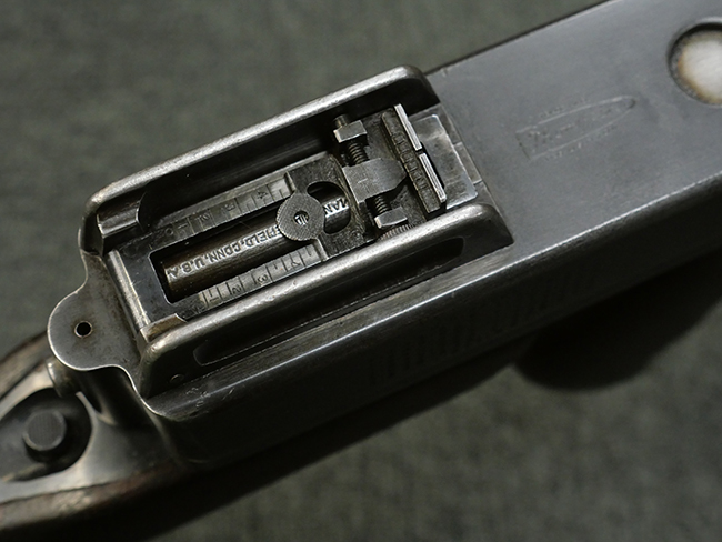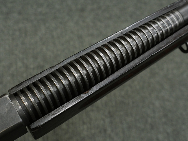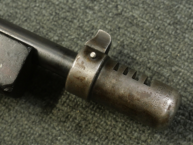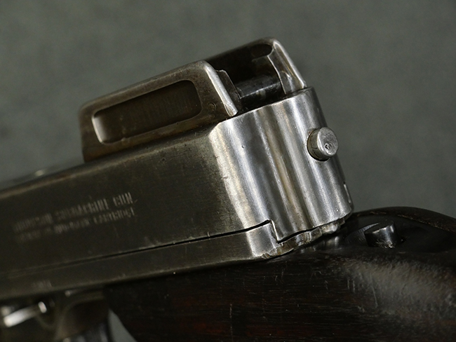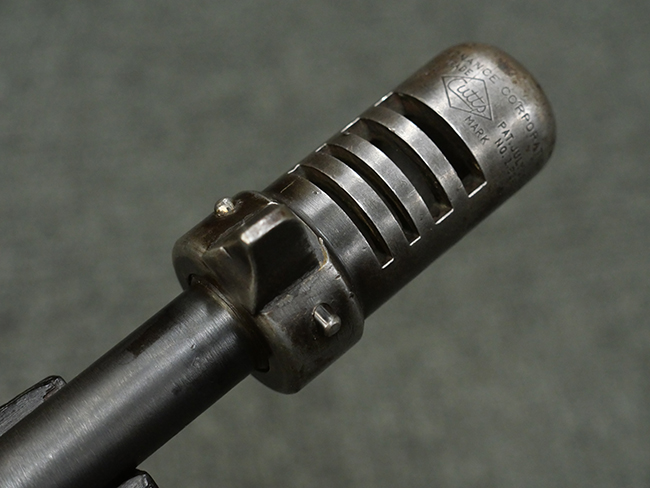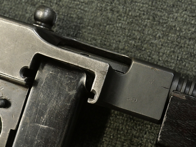 本品はシリアルがSで始まる事から、サベージ社製であることがわかります。 バレル・フィンがあり、Lyman (ライマン) 社製のラダー・サイトが付いた仕様です。 カッツ・コンペンセーター表面の刻印についてはしっかりと確認可能です。 尚、セレクター及びセーフティはいずれも削り出しタイプの物が取り付けられています。 尚、ハンドガード後端にはサベージ製を示す「S」の刻印が見られます。