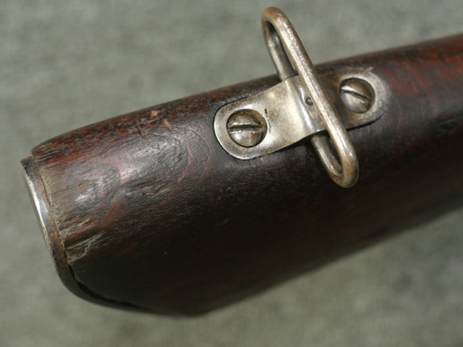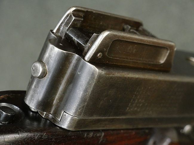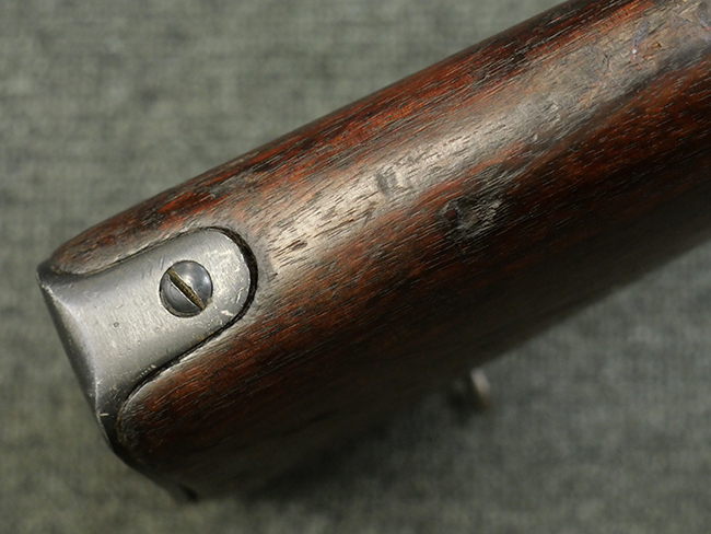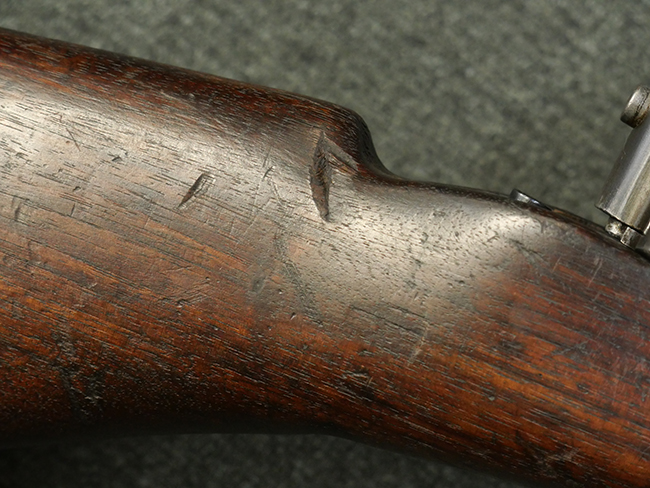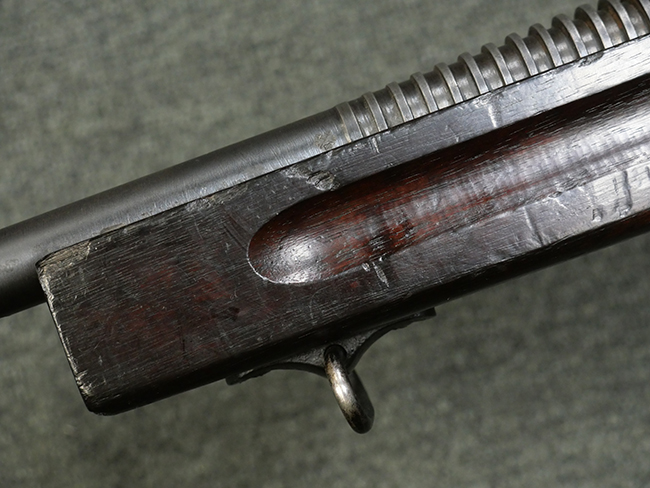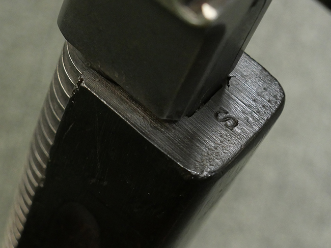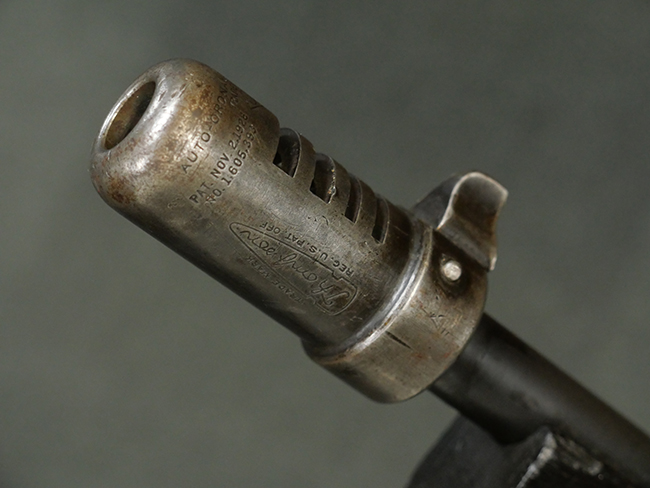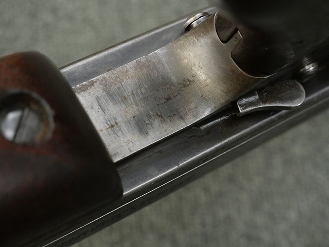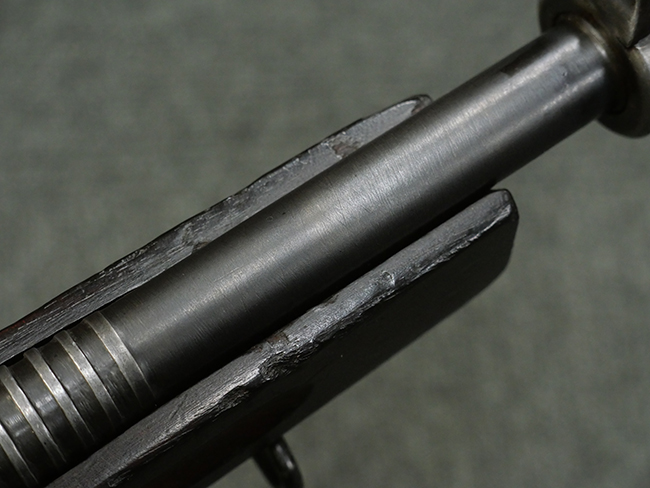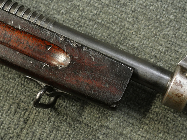 本品はシリアルがSで始まる事から、サベージ社製であることがわかります。 バレル・フィンがあり、Lyman (ライマン) 社製のラダー・サイトが付いた仕様です。 カッツ・コンペンセーター表面の刻印についてはしっかりと確認可能です。 尚、セレクター及びセーフティはいずれも削り出しタイプの物が取り付けられています。 尚、ハンドガード後端にはサベージ製を示す「S」の刻印が見られます。