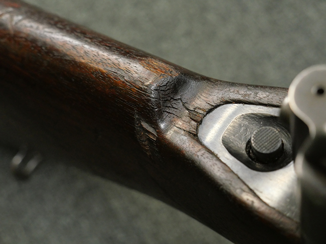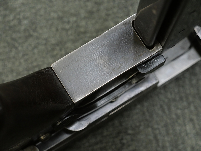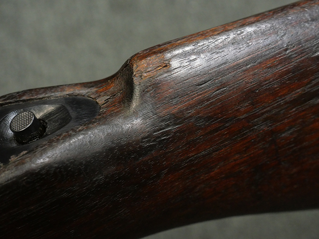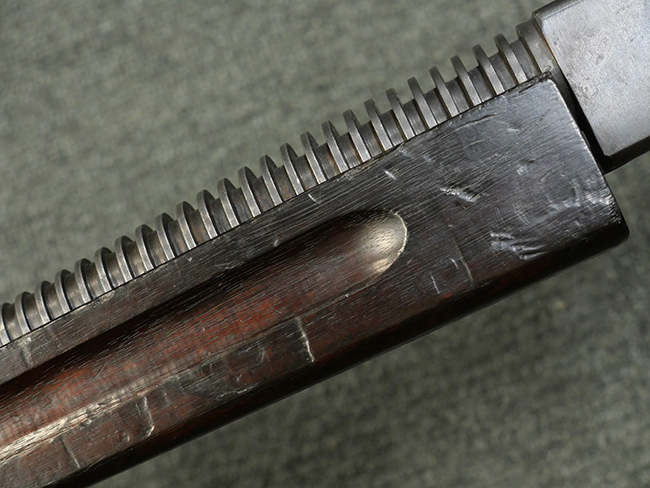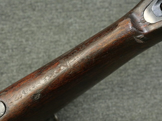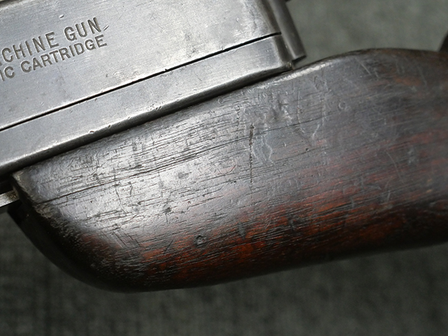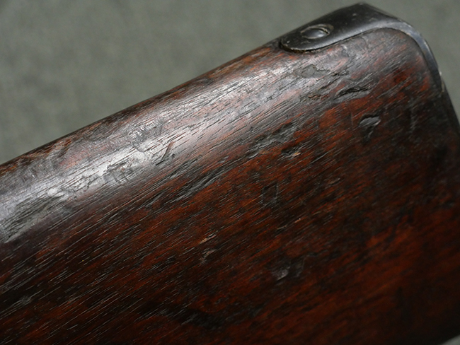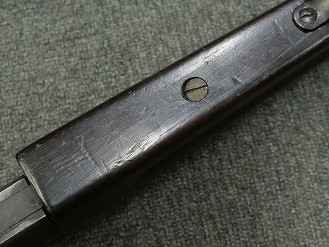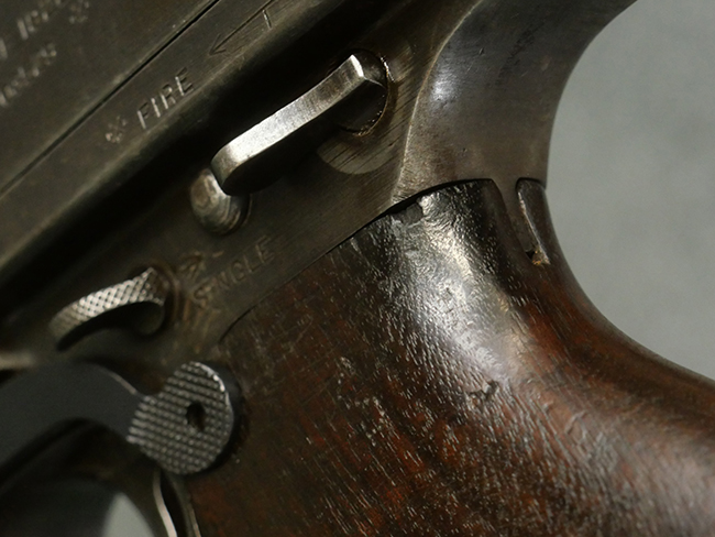 本品の金属部には角部に仕上げが薄くなっている箇所が見受けられるものの、全体に目立った欠損等は見られず、大部分で表面仕上げ残った概ねしっかりとした状態が保たれています。 木製のハンドガード及びバット・ストックは、木部には若干の打ち傷や角部の摩耗が見られるものの、大きな破損等は見られません。 ハンドガード右面に強度に長さ約4cmほどのクラックが見られますが、現状大きく欠損している箇所は見られません。 ハンドガードはグリップやバット・ストックに比べてやや暗めの色合いとなっていますが、大きな違和感のない程度のものです。 グリップには若干の打ち傷や左面上部に小さな欠けが見られるものの、取り付けにガタつきは見られません。 また、グリップ左側面には複数のピン状打刻によって「S」の刻印が打たれています。 バットストックには頬の当たる部分にやや目立つ打ち傷が見られる他、銃本体の取り付け金具付近に乾燥に伴う古いヒビが見られますが、現状広がっている様子はありません。 また、バット・ストック基部左側面に長さ約10cm程、右側面に長さ約1.5cm/約0.5cmほどのクラックが見られますが、こちらも現状広がっている様子はなく、銃本体への取り付け金具の固定にガタつきも見られません。 バット・ストックの取り付けは、ごく僅かな遊びが見られますが十分許容レベルで、着脱もスムーズに行えます。 バット・プレート部は、細かな打ち傷や一部に擦れが見られるものの、ストック内コンパートメントの蓋の開閉についても問題なく行う事が可能です。 マガジンの着脱やリア・サイトの起倒・調整についても問題なく行う事が可能です。 また、トリガーとの連動は有りませんが、セレクター・レバーやセーフティ・レバーの切り替えも可能です。