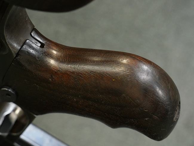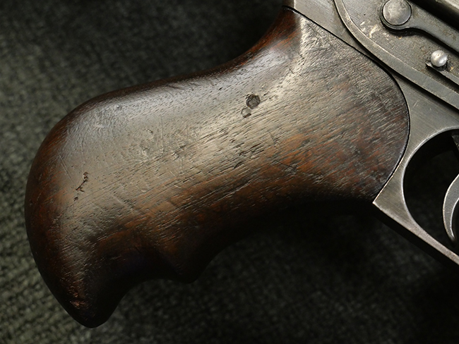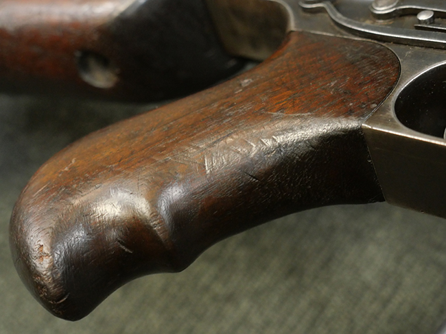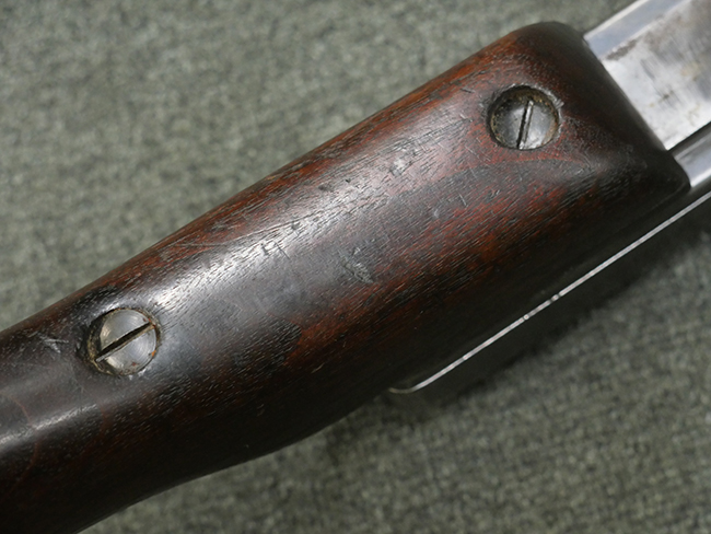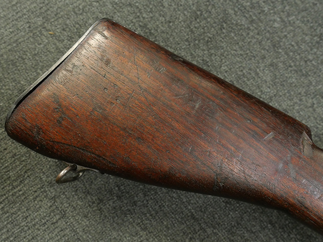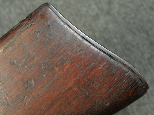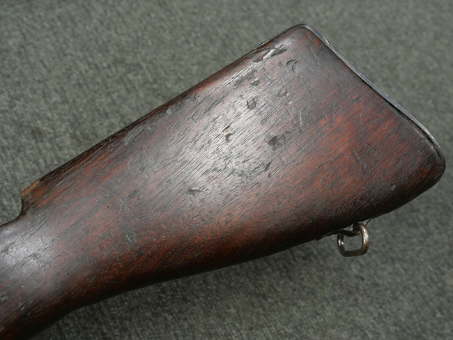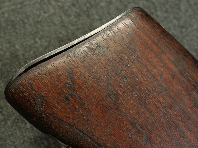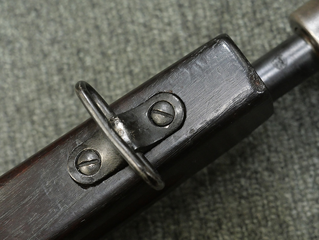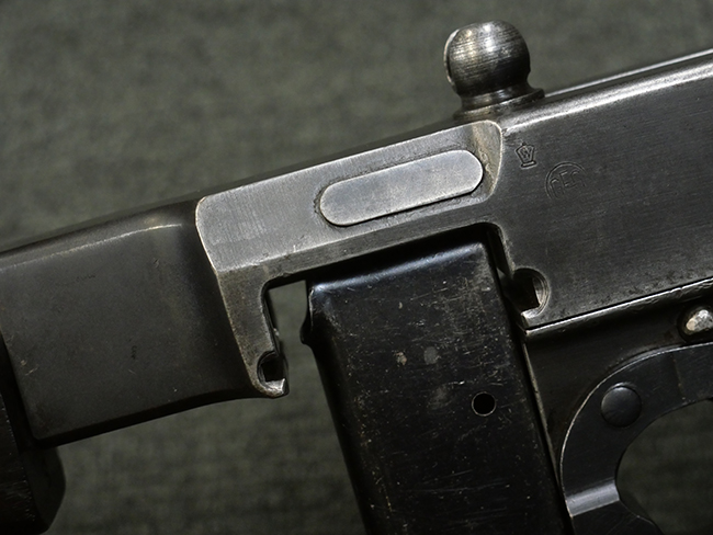 本品の金属部には角部に仕上げが薄くなっている箇所が見受けられるものの、全体に目立った欠損等は見られず、大部分で表面仕上げ残った概ねしっかりとした状態が保たれています。 木製のハンドガード及びバット・ストックは、木部には若干の打ち傷や角部の摩耗が見られるものの、大きな破損等は見られません。 ハンドガード右面に強度に長さ約4cmほどのクラックが見られますが、現状大きく欠損している箇所は見られません。 ハンドガードはグリップやバット・ストックに比べてやや暗めの色合いとなっていますが、大きな違和感のない程度のものです。 グリップには若干の打ち傷や左面上部に小さな欠けが見られるものの、取り付けにガタつきは見られません。 また、グリップ左側面には複数のピン状打刻によって「S」の刻印が打たれています。 バットストックには頬の当たる部分にやや目立つ打ち傷が見られる他、銃本体の取り付け金具付近に乾燥に伴う古いヒビが見られますが、現状広がっている様子はありません。 また、バット・ストック基部左側面に長さ約10cm程、右側面に長さ約1.5cm/約0.5cmほどのクラックが見られますが、こちらも現状広がっている様子はなく、銃本体への取り付け金具の固定にガタつきも見られません。 バット・ストックの取り付けは、ごく僅かな遊びが見られますが十分許容レベルで、着脱もスムーズに行えます。 バット・プレート部は、細かな打ち傷や一部に擦れが見られるものの、ストック内コンパートメントの蓋の開閉についても問題なく行う事が可能です。 マガジンの着脱やリア・サイトの起倒・調整についても問題なく行う事が可能です。 また、トリガーとの連動は有りませんが、セレクター・レバーやセーフティ・レバーの切り替えも可能です。