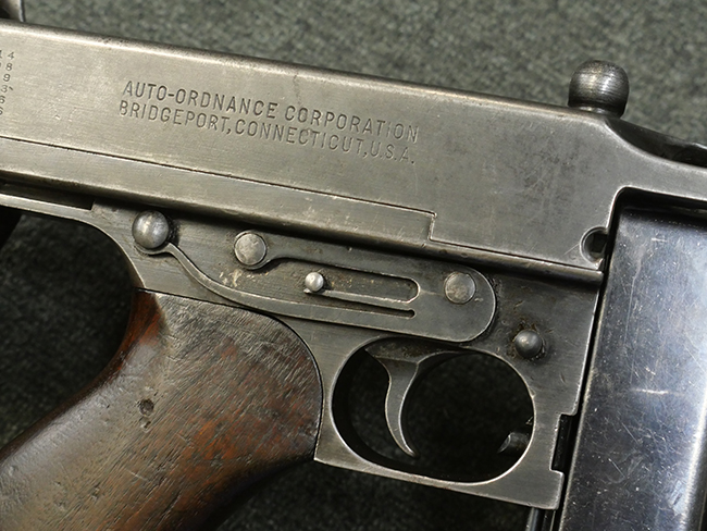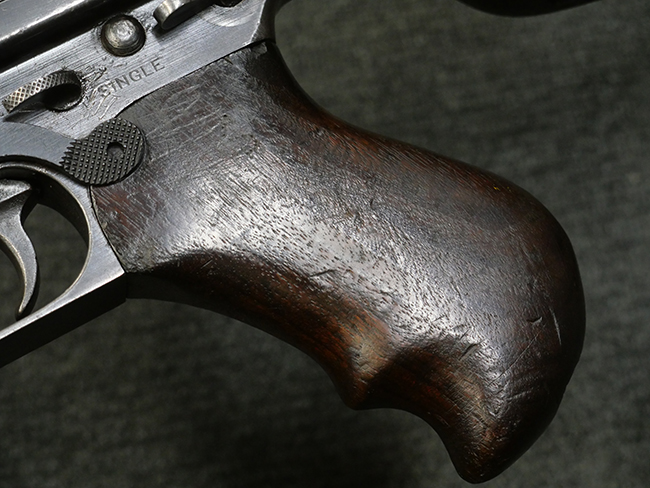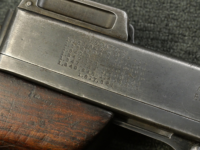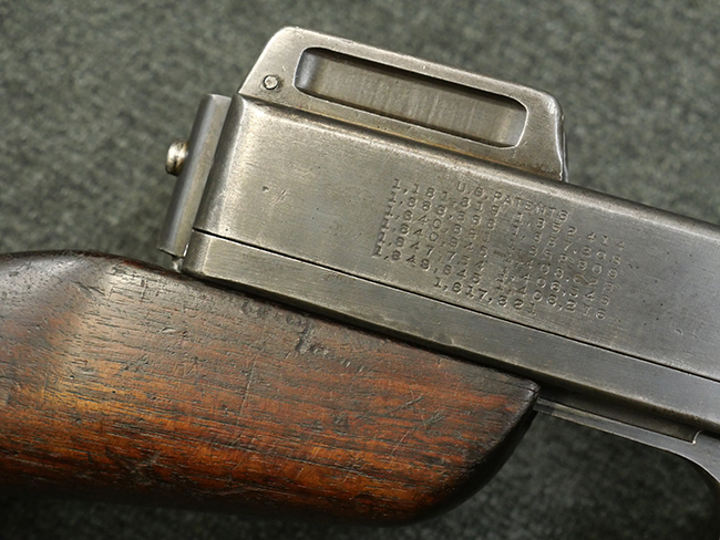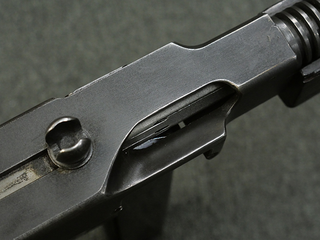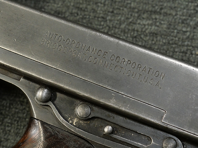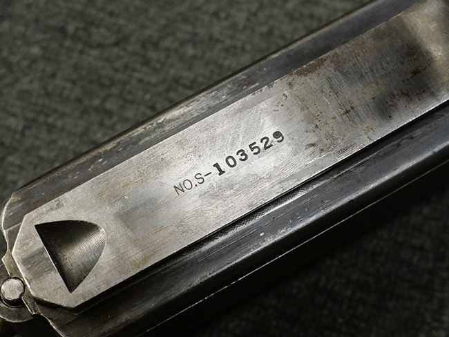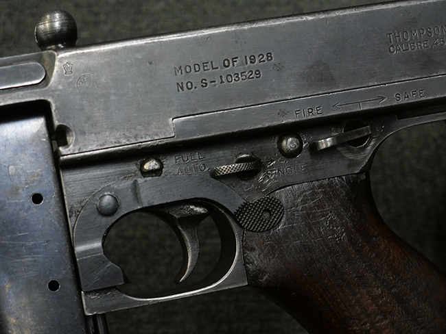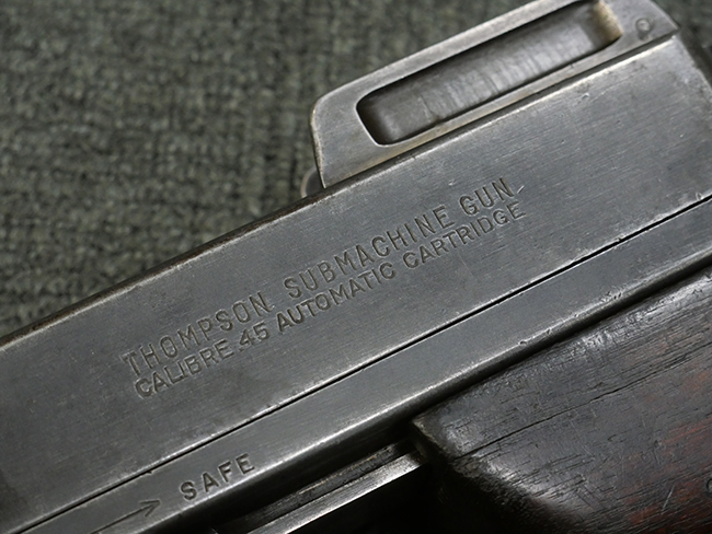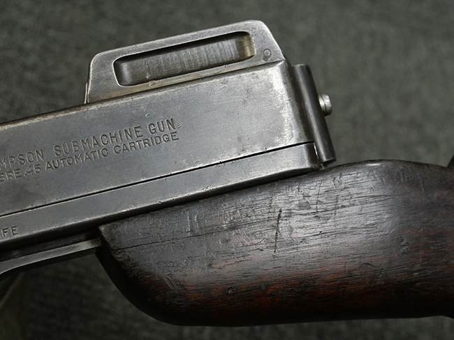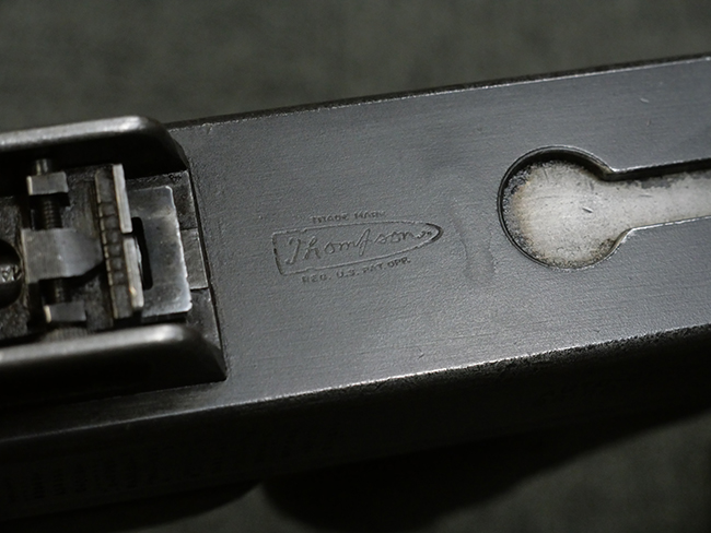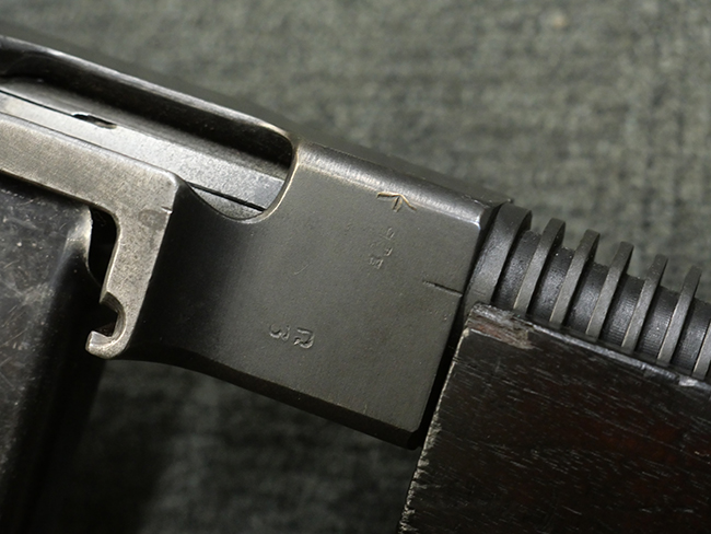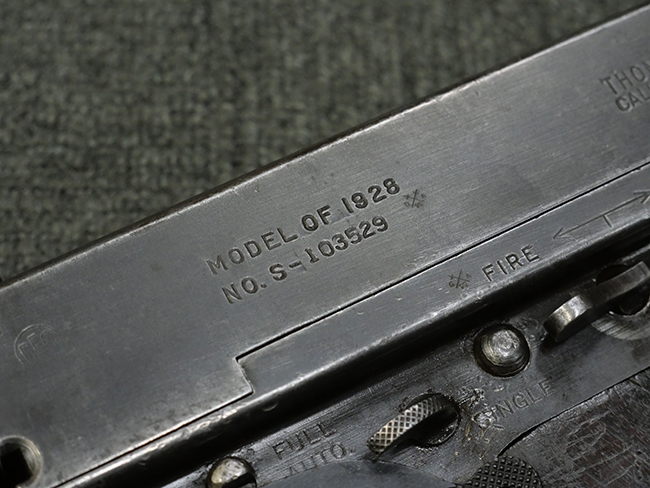 本品のレシーバー左側面にはシリアルNo.S-103529で、 レシーバー左側面には「U.S. MODEL 1928 A1」及び「THOMPSON SUBMACHINE GUN CALIBRE .45 AUTOMATIC CARTRIDGE」の刻印が入っています。 レシーバー右側面には米国のパテント刻印の他、「AUTO-ORDNANCE CORPORATION BRIDGEPORT, CONNECTICUT,U.S.A」の刻印が入っており、レシーバー上面にはトンプソンのロゴが入っています。 ロア・レシーバーのシリアルNo.はアッパー・レシーバーのシリアルNo.とマッチしています。 また、アッパー・レシーバー左側面にはオート・オードナンス社検査官George E.GOllを示す「GEG」の検査刻印が打刻されており、薬室部右面には英軍で使用されたことを示すブロード・アロー刻印が見られます。