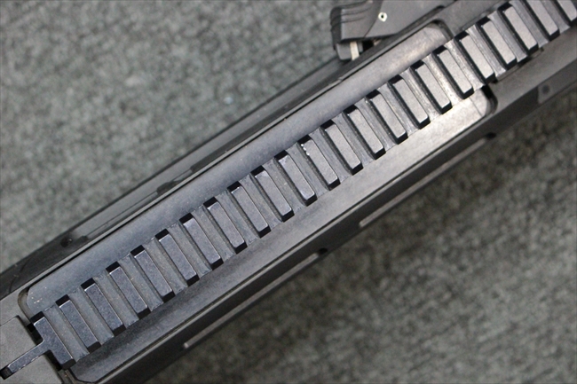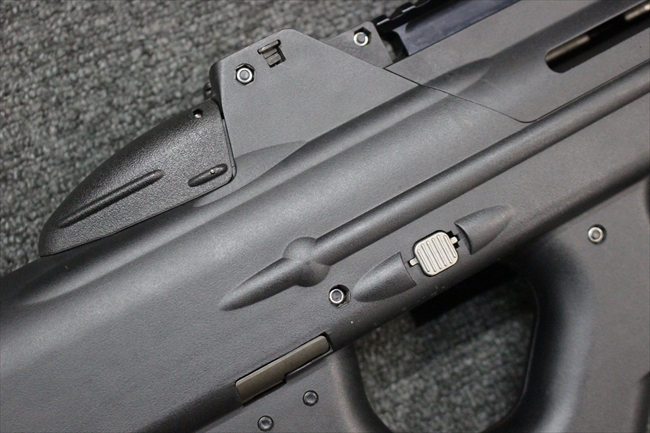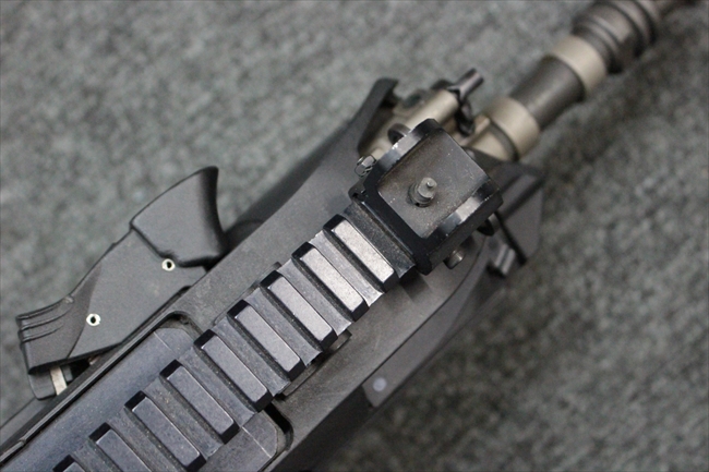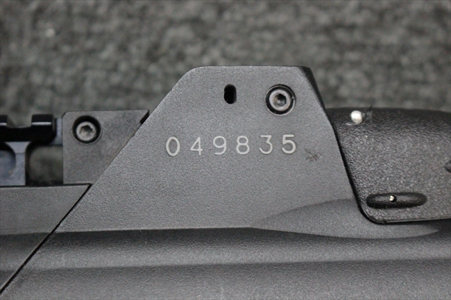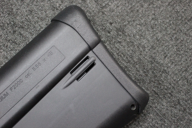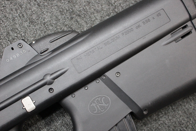 本品は本体上部のスコープ・モジュールを省略してピカティニー・レールを延長したF2000 タクティカルと呼ばれるモデルです。 リア・サイトは折り畳み式のバックアップ・サイトが装備されています。 本品のレシーバー左側面には「FN HERSTAL BELGIUM F2000 cal. 5.56 x 45」の刻印が入っている他、本体両側面にはFN社のロゴが入っています。