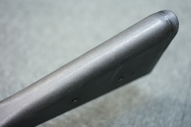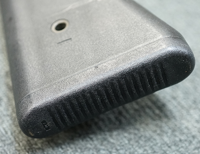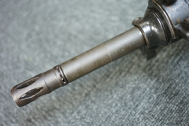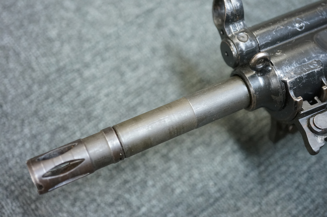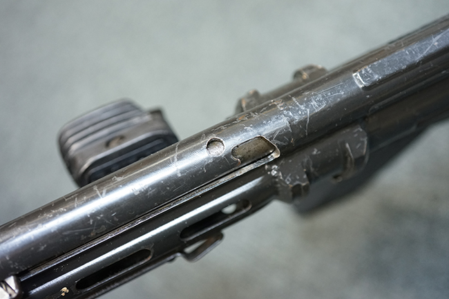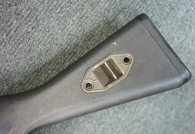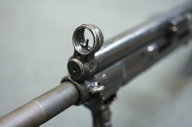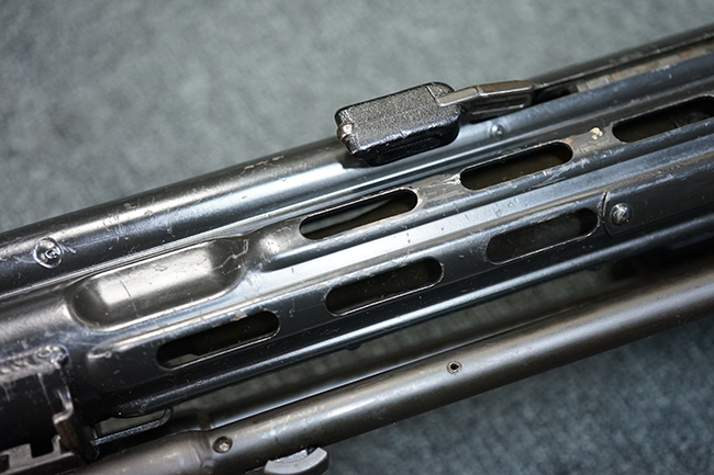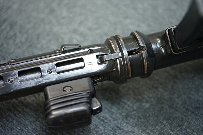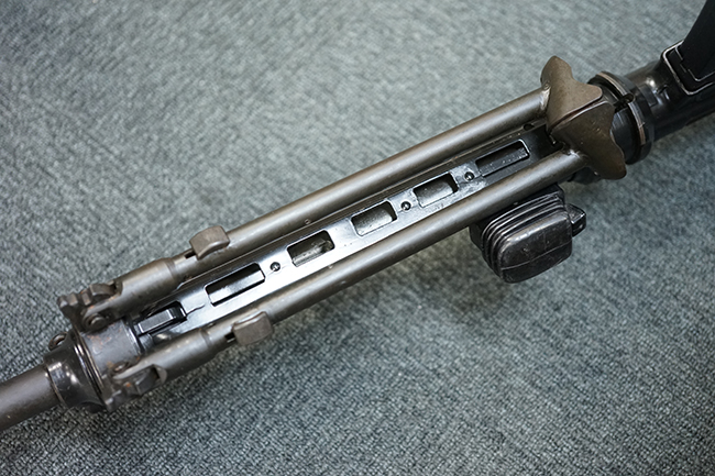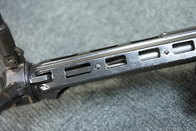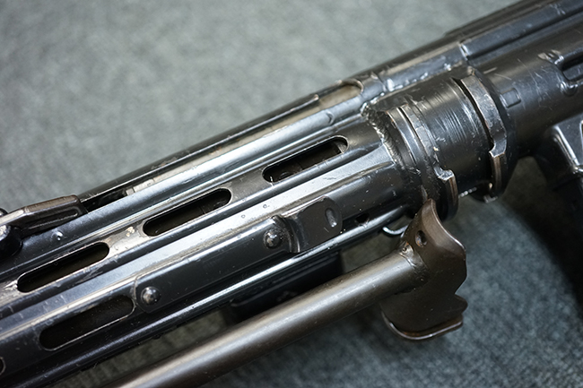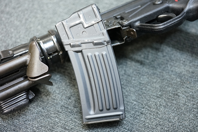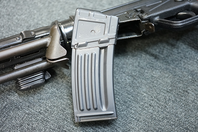 本品の金属部は適度な使用感が見受けられ、金属部分の黒色焼付塗装にやや傷や擦れ、若干の仕上げの剥落は見受けられるものの、目立った破損や欠損等は見受けられず、概ねしっかりとした状態が保たれています。 樹脂製のグリップ・フレームやバット・ストックについては使用感は比較的少なく、若干の小傷や擦れの他、バット・ストック右側面にやや目立つ線傷が見受けられるものの、それ以外に大きな欠損は見られず、概ね良好な状態が保たれています。 傷み易いバット・プレート部についても、目立った摩耗などは見られず、滑り止めのモールドもしっかりと残っています。 グリップ・フレームの取り付けに若干のガタつきが見られますが、それほど気にならないレベルのものです。 二脚の展開操作やマガジンの着脱、ドラム式リア・サイトの切り替えについては問題なく行う事が可能です。 二脚の取り付けレールは前後に設けられており、取り付け位置を入れ替える事も可能です。 付属のマガジンは20連タイプとなっており、マガジン側面に「5,56x45 IB」の口径表示刻印が入っています。