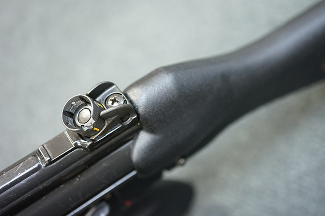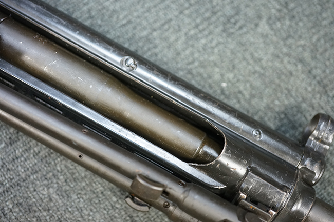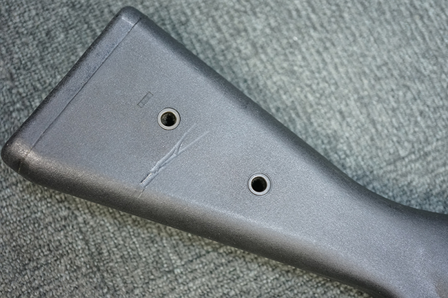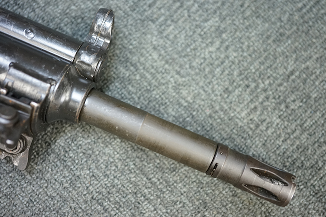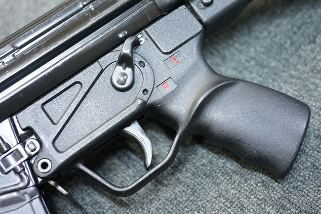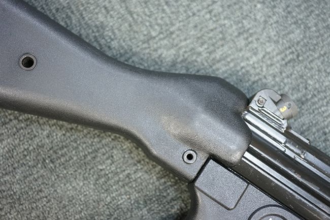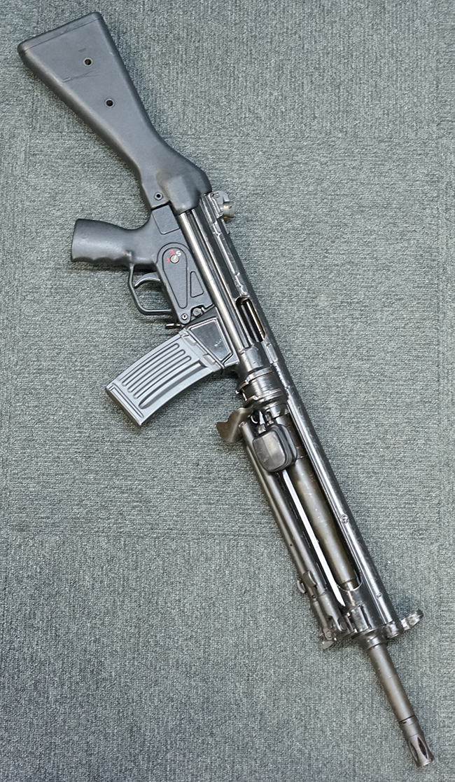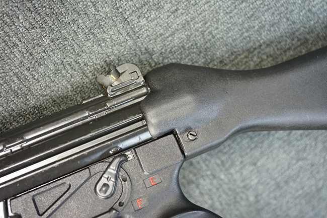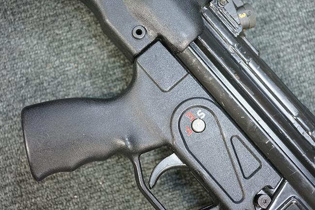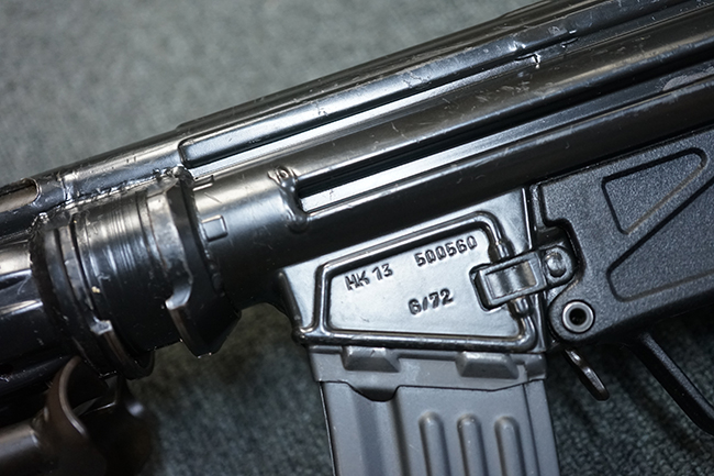 本品のマガジン・ハウジングには、シリアルNo.及び「HK13」のモデル名の他、製造年月を示す「6/72」の刻印が入っています。 また、銃身にも「HK 13」のモデル名が入っている他、本体とマッチしたシリアルNo.560が入っています。 グリップ・フレームのセレクター表示は、「S-E-F」のアルファベット表記となっています。 ストックは固定式のタイプが取り付けられています。