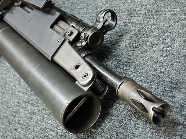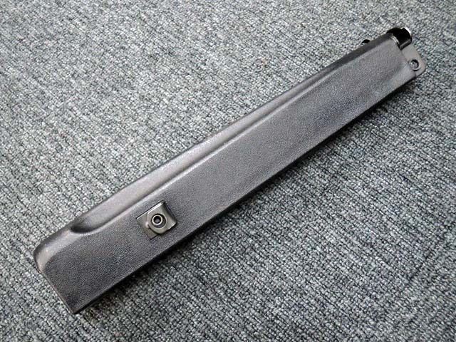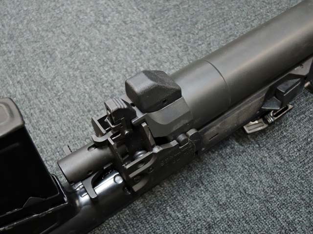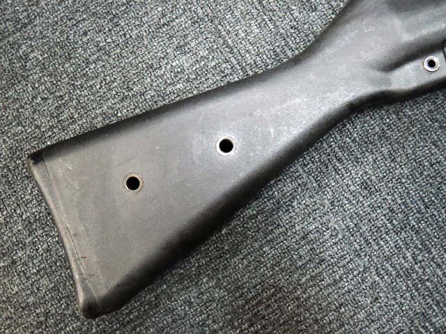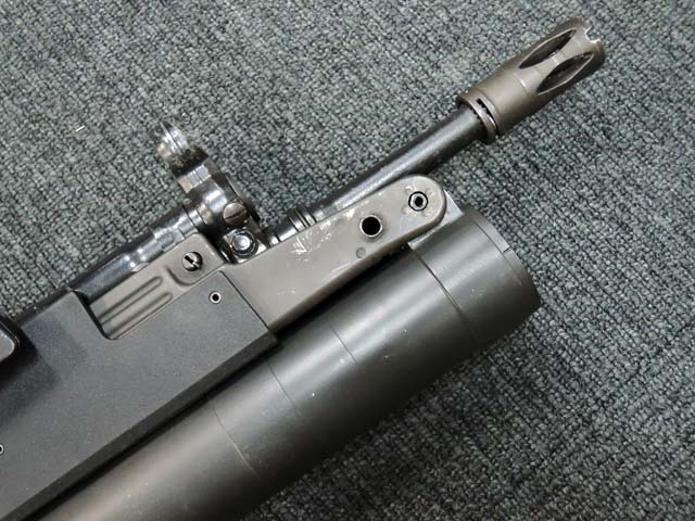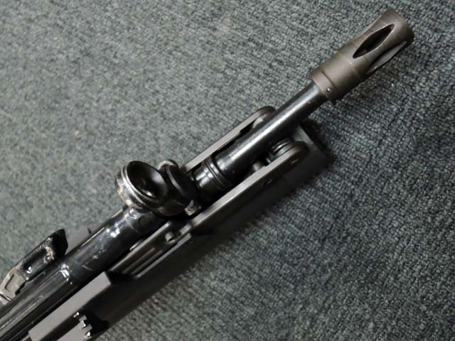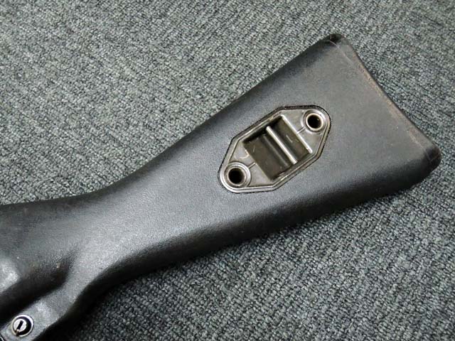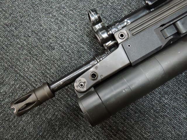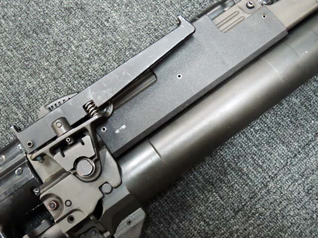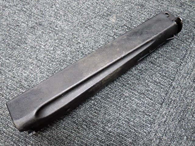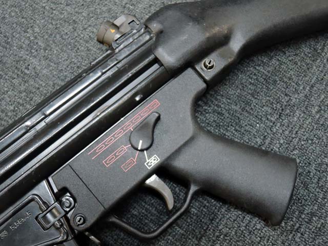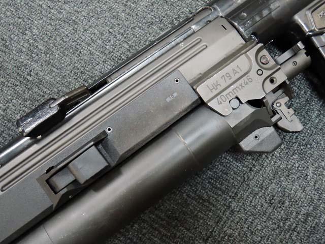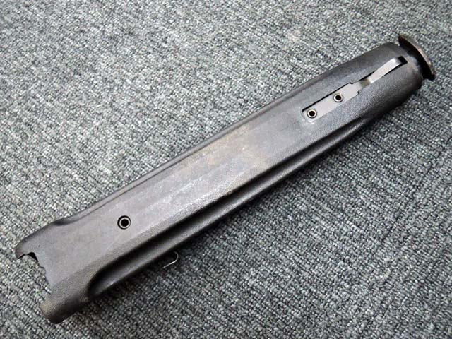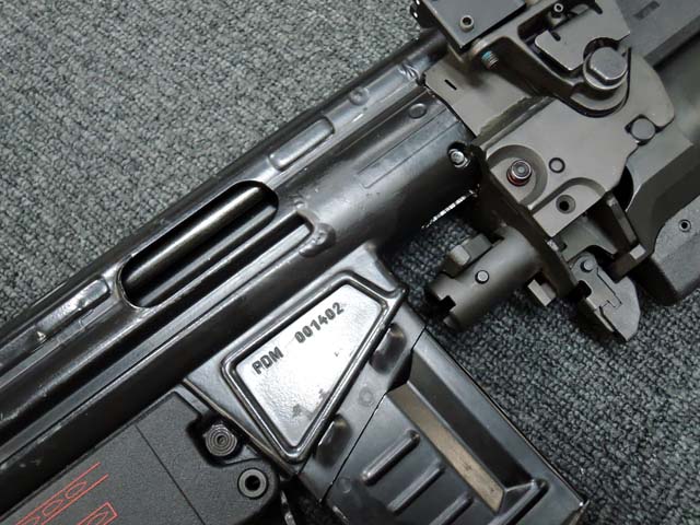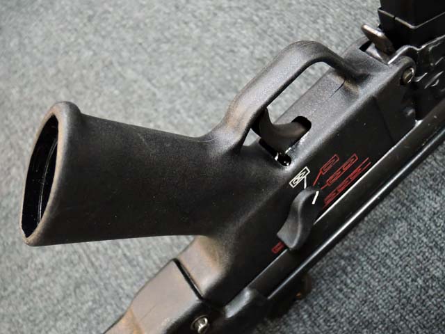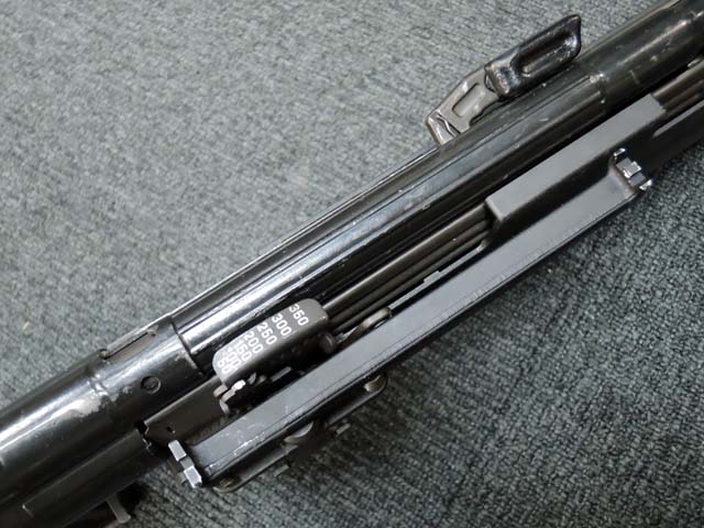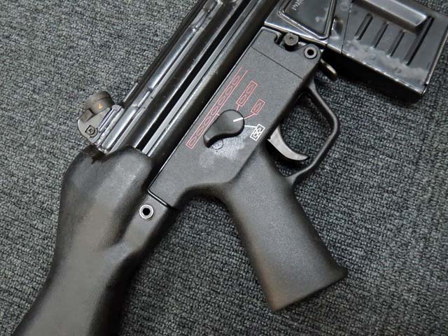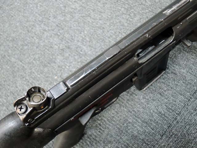 本品の金属部は黒の焼付け塗装仕上げとなっており、やや打ち傷や擦れ、一部に塗装の剥落等が見られるものの、目立った欠損等は見られず、塗装も比較的良好に残っています。 マガジン・ハウジング上部周辺の機関部両側面には無可動加工に伴い、塗装の質感が異なっている箇所が見受けられます。 樹脂製のグリップ・フレーム及びバット・ストックは、やや小傷や擦れは見られますが、こちらも大きな破損等は見られず、取り付けについてもがたつきもなくしっかりとしています。 本品にはHK79A1と樹脂製のハンドガードが付属いたします。 付属のマガジンは横方向にリブの入ったストレート形状の20連タイプで、やや小傷や擦れは見られるものの、目立った凹みや変形等は見られず、比較的良好な状態が保たれています。 尚、マガジン・スプリングは入っていません。 マガジンの着脱やリア・サイトの切り替えについては問題なく行う事が可能です。 セレクター・レバーの切り替えも可能ですが、加工の関係上安全位置に入れる事が出来なくなっています。
