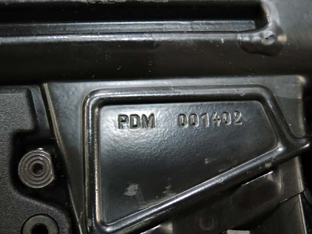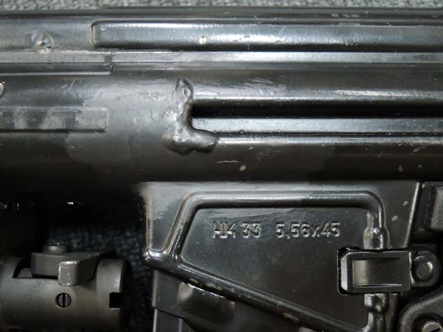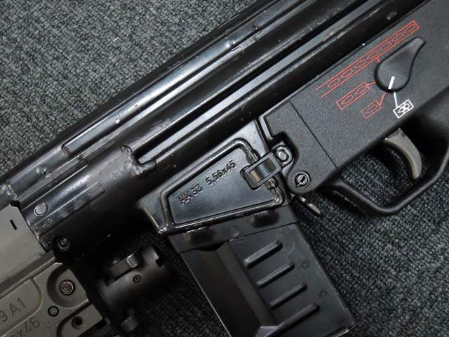 本品はマガジン・ハウジング左側面に「HK33 5,56mm×45」の刻印が入っている他、本体右側面には「PDM」の刻印及びシリアルNo.が刻印されています。 これらの刻印から、パーツをドイツHK社から輸入してマレーシアでノックダウン生産された品と思われます。 記録によると、55,000挺のHK33自動小銃がHK社の支援の下、パーツとしてマレーシアに輸出され、現地で組み立てられました。 本品のセレクターの表記は言語依存のない弾丸のマークで、フル・オートマチック射撃、2点バースト、セミ・オートマチック射撃、安全位置の4ポジションとなっています。