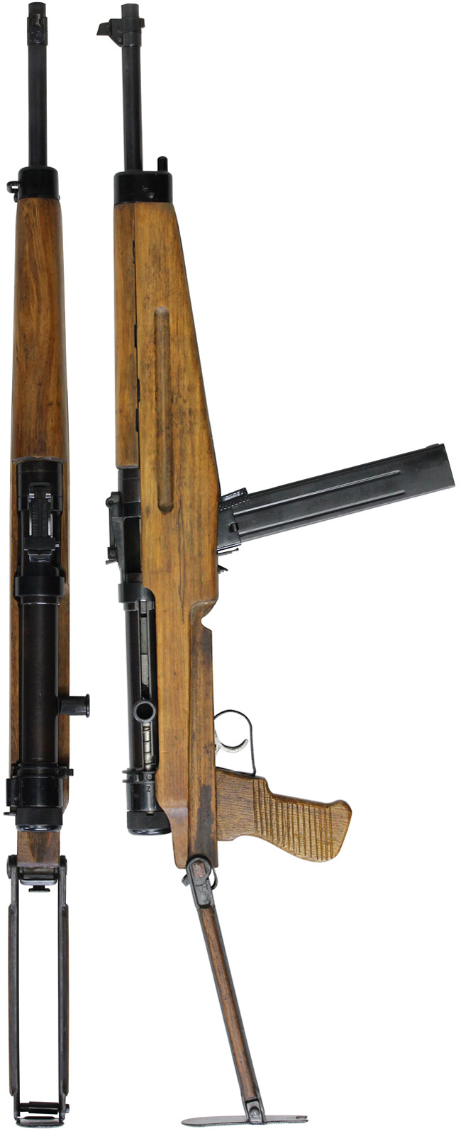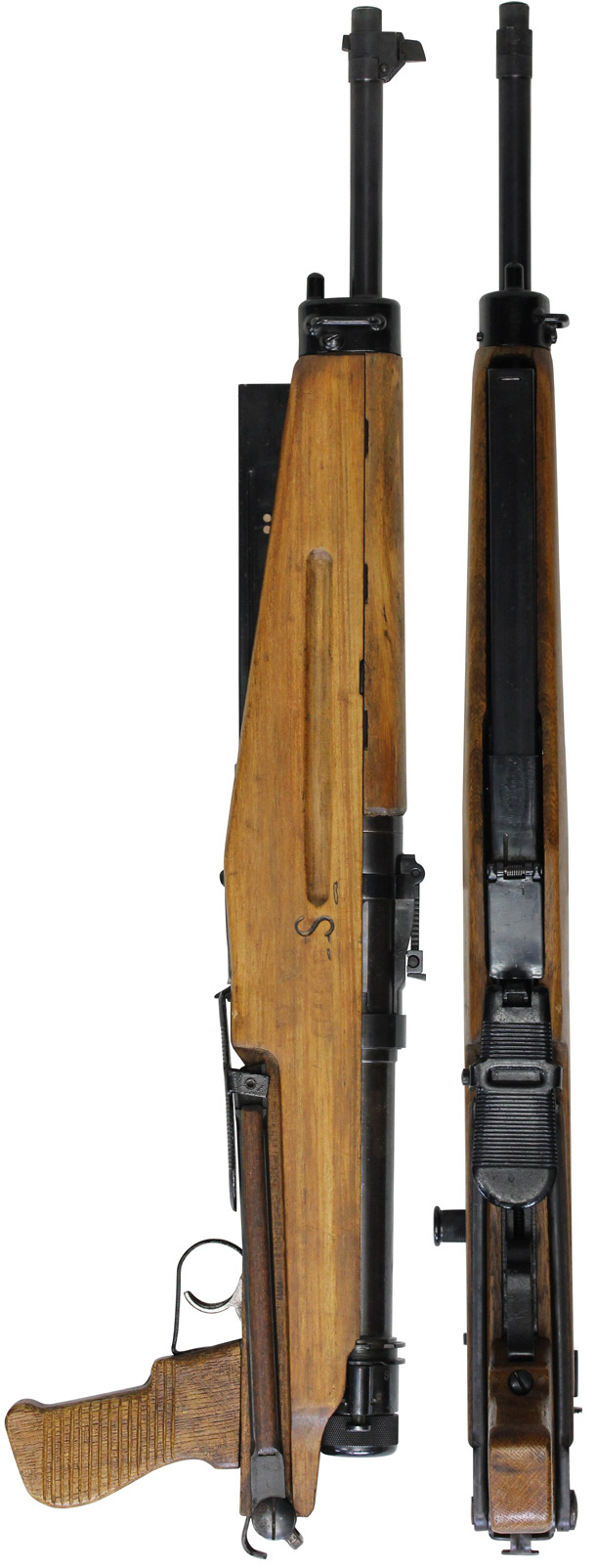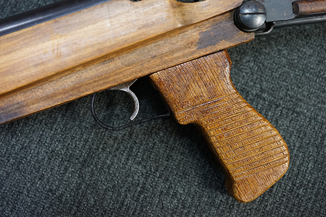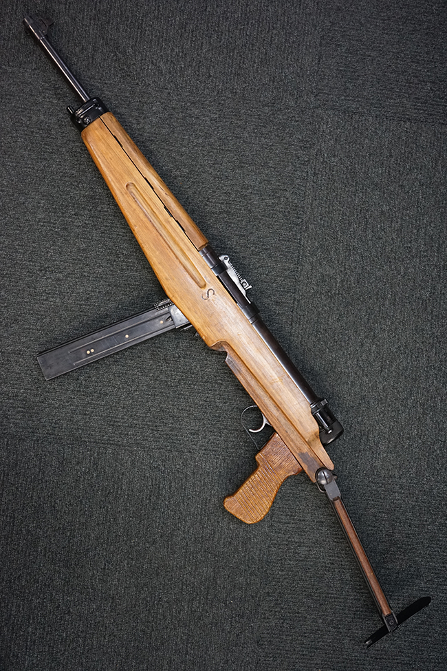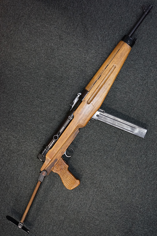 43M 短機関銃はハンガリーのダヌビア (Danuvia Gepgyar) 社の銃器設計者であったデダイ・キラーイ・パール (Dedai Kiraly Pal) 技師が設計したハンガリー軍の39M 短機関銃の改良型で、設計者の経歴が本銃の開発に大きく影響しています。 設計者であるキラーイ技師は第一次世界大戦時はオーストリア=ハンガリー帝国陸軍に砲兵大尉として従軍し、自ら自動火器の重要性を認識しました。 第一次大戦後にスイスのSIG社で設計技師として働き、第一次大戦の従軍経験から、SIG KE7 軽機関銃やSIG MKMO 短機関銃などの自動火器を副主任設計者として開発しました。 その後ハンガリーに戻ってダヌビア社に勤務し、1929年には数種類の自動火器の設計をしましたが、軍用としては採用されませんでした。 1930年代後半にキラーイ技師はダヌビア社で9mm×19パラベラム弾より遥かに強力な9mm×25 モーゼル (Export) 弾を使用する短機関銃を開発しました。 これは.45 ACP弾を使用するトンプソンやグリース・ガンに次ぐ強力な短機関銃と言われ、自動小銃と短機関銃の中間的な役割をする突撃銃が出現する以前の新しいカテゴリーの兵器でした。 全長は自動小銃とほぼ同じ長さで、銃身も長く高初速で集弾率もかなり良好でした。 ハンガリー陸軍は当初本銃に対して消極的でしたが、1939年1月25日に「the Haditechnikai Intezet (HTI)=軍事技術研究所 (Institute of Military Technology)」が同盟国であるドイツ軍のMP38 短機関銃とキラーイ技師が設計した9mm×25弾を使用する短機関銃を比較検討した結果、キラーイ技師設計の短機関銃の方が「軽量」「長銃身」「集弾率の良さ」「大容量弾倉」「高い初速」「メンテナンスの容易さ」といった点において勝っているとされ、1939年12月8日ハンガリー陸軍 (Honvedseg) によって39M 短機関銃として制式採用されました。 39M 短機関銃は毎分750発という短機関銃としては発射速度は比較的高めであった事から射撃コントロールし難い発射速度と思われますが、大きく頑丈なため集弾率もかなり良くハンガリー軍の兵士からは好評でした。 40連マガジンの装弾数も他の短機関銃に比べ若干多く長めですが、SIG MKMO 短機関銃と同じように前方に折り畳み式が出来るマガジンを使用したため装弾数の多いマガジンでも邪魔になりませんでした。 特筆すべき点として、当時の大国が単純なストレート・ブローバックを採用していた時期にキラーイ技師の特許である「Lever-delayed Blowback」を採用していました。 更にマガジンを折り畳んだ時にマガジン・ハウジング後部のプレートがマガジン・ハウジングに被さり、異物がマガジン・ハウジングから進入することを防ぎます。 このシステムは本銃以外の小火器には見られない独自のものです。 東部戦線で戦ったハンガリー軍が使用した39M 短機関銃は泥まみれの氷点下の戦場でも問題なく作動し、1943年には下方から回転させる折り畳みストックを装備した改良版の43M 短機関銃が採用されました。 本品はこの43M 短機関銃です。 43M 短機関銃はバット・ストックが改良されただけではなく、マガジンも似てはいますがマガジン・リップの耐久性が高くなっており、39M 短機関銃用とは互換性はありません。 39M 短機関銃では垂直に取り付けられたマガジンは43M 短機関銃では僅かに前方に傾いた状態で装着されています。 また、エジェクターもレシーバー側にあったものがボルト・キャリアに移されました。 全長が39Mに比べ75mm短くなっており、それに伴いスリング・ループが下部に付いたセンター・バンドも省略されました。 スリング・ループはフロント・バンドの左側面に移されました。 それに伴いスリングのデザインも変更され43M独自のスリングが採用されました。 マガジンを含む殆どの部品が39Mとは互換性が無く、単に39M 短機関銃の折り畳みストック・バージョンと呼ぶには多くの改良された相違点があります。 また、39Mに比べ39M 短機関銃の総生産数は9,000挺から11,000挺と言われており、43M短機関銃の生産数はさらに少ないとも言われています。 Jozsef Kucher技師と Gyarik技師が参加してこのコンパクト・モデルを完成させた事から、43M 短機関銃は「'Gyarik-Kucher Geppisztoly 43M 短機関銃」とも呼ばれました。 43M 短機関銃の殆どは東部戦線で失われ、僅かに残った43M 短機関銃と39M 短機関銃は戦後も短期間使用されました。 第二次世界大戦後に設計者のデダイ・キラーイ・パール技師はスイスに逃れ、1947年にドミニカ共和国へ移住してサン・クリストバル・カービンを開発しました。 サン・クリストバル・カービンは口径が.30 カービン弾を使用する種類上は自動小銃ですが、ダヌビア43M 短機関銃の流れを受け継ぐ形状をしています。