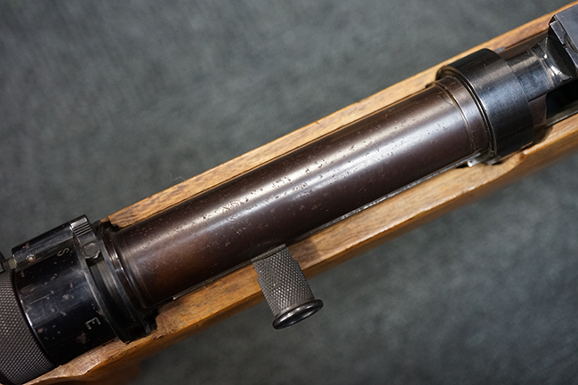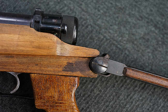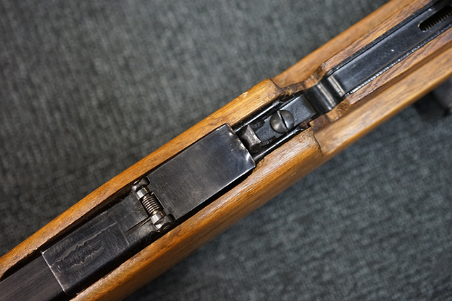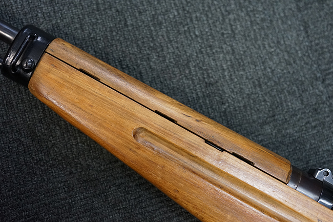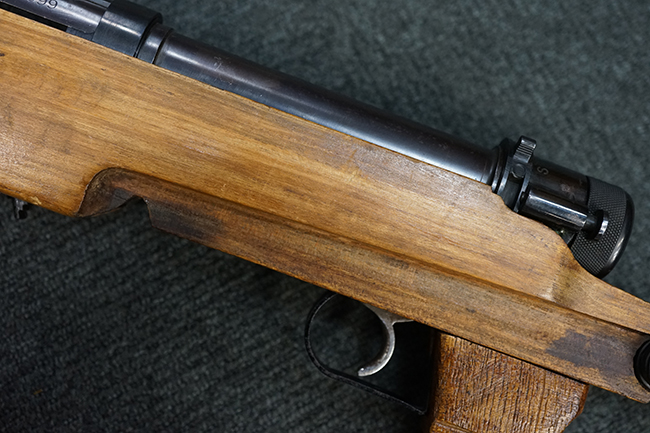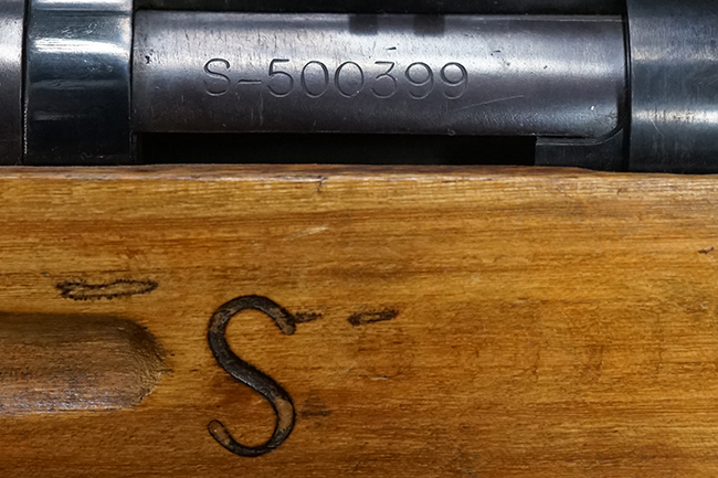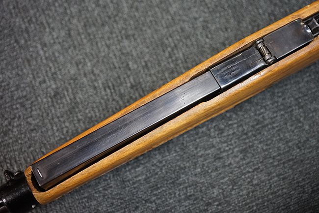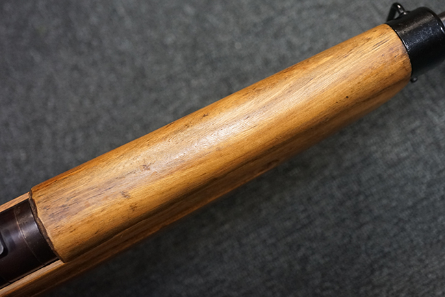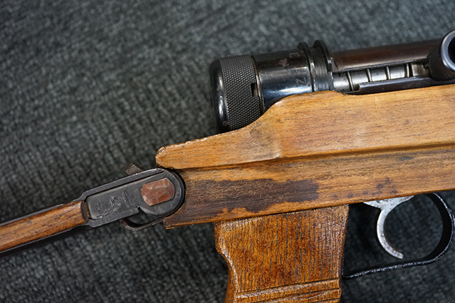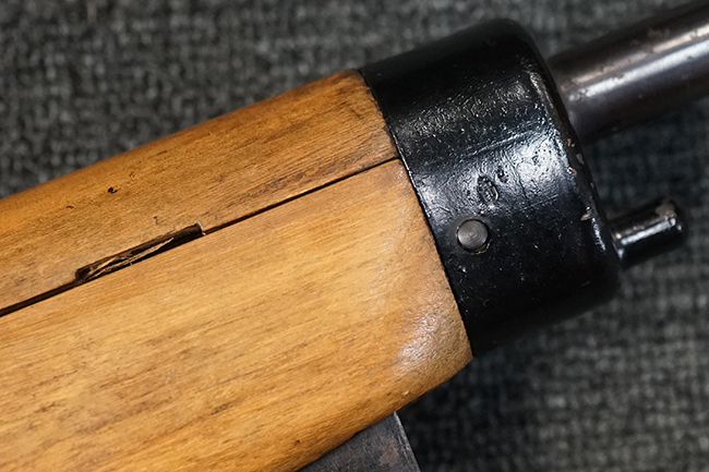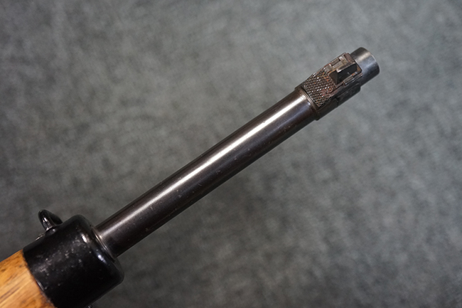 機関部左側面にシリアル#S-500399が打刻されており、上面には当時のDanuvia社のロゴが打たれています。 加えて薬室上部に「E」、ストック左側面に大きく「S」と打たれています。 機関部は多少経年が感じられますが表面処理が鮮やかに残っており充分に良い状態を保っています。 表面処理は部品毎に差があり、機関部や銃身はブルーイングが施されており、トリガー・ガード、フロント・バンド、バット・プレートには黒の焼付け塗装仕上げが施されています。 エンド・キャップや銃身は青い色味がでており、機関部は若干赤っぽくなっている印象です。 小さな表面錆が点々と見られる他、ストック基部のスクリューに浅い朽ち込みの跡が見られますが、状態は安定しており劣化が進行している様子は有りません。 黒の焼付け塗装が施されている各部は、塗膜が大変鮮やかです。 全体的に小傷は少ない印象です。