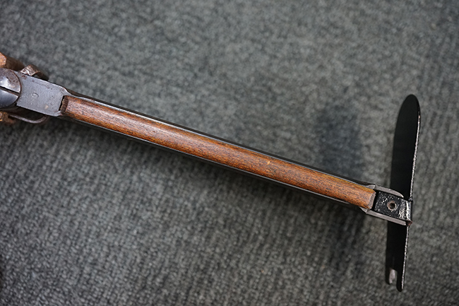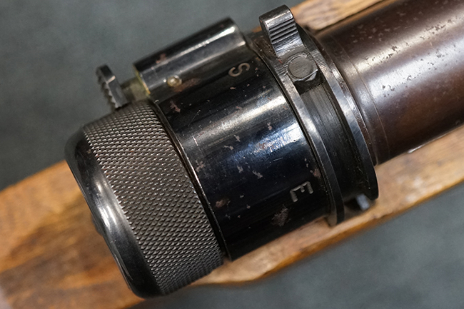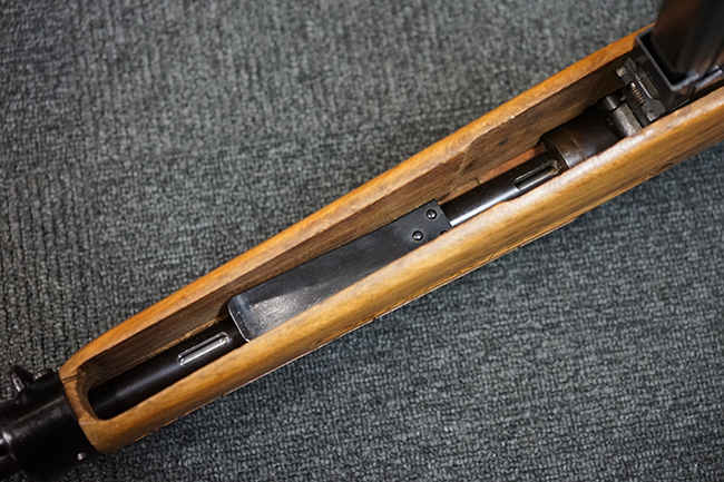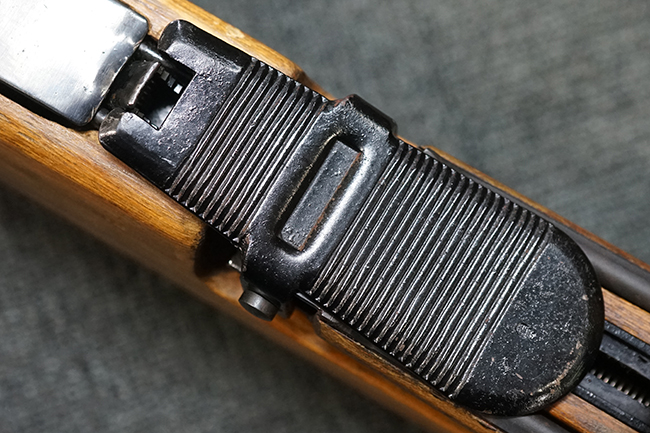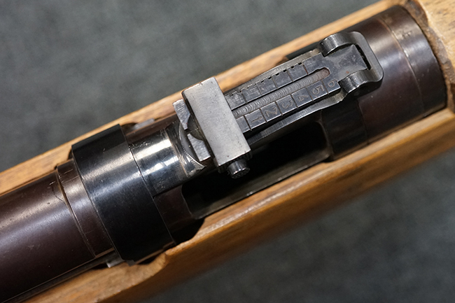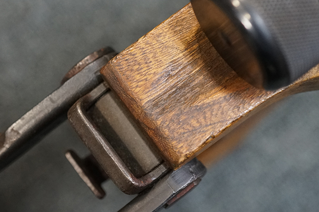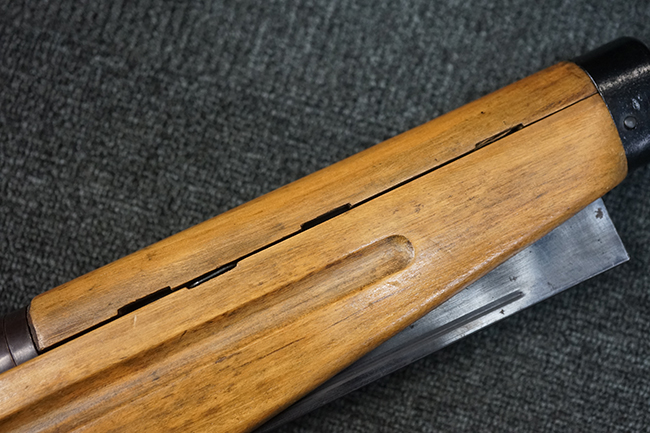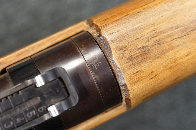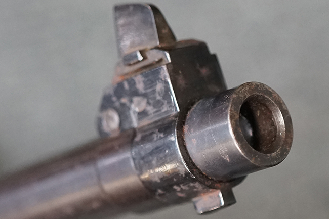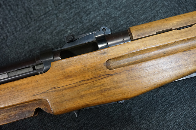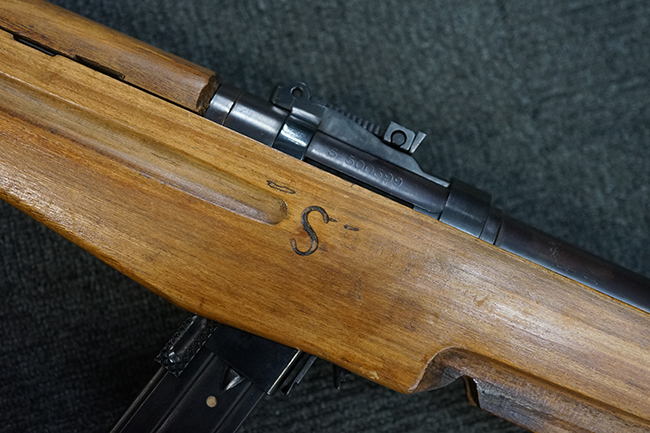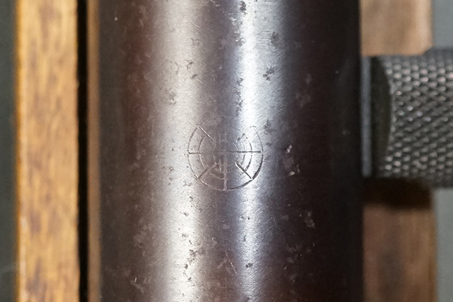 機関部左側面にシリアル#S-500399が打刻されており、上面には当時のDanuvia社のロゴが打たれています。 加えて薬室上部に「E」、ストック左側面に大きく「S」と打たれています。 機関部は多少経年が感じられますが表面処理が鮮やかに残っており充分に良い状態を保っています。 表面処理は部品毎に差があり、機関部や銃身はブルーイングが施されており、トリガー・ガード、フロント・バンド、バット・プレートには黒の焼付け塗装仕上げが施されています。 エンド・キャップや銃身は青い色味がでており、機関部は若干赤っぽくなっている印象です。 小さな表面錆が点々と見られる他、ストック基部のスクリューに浅い朽ち込みの跡が見られますが、状態は安定しており劣化が進行している様子は有りません。 黒の焼付け塗装が施されている各部は、塗膜が大変鮮やかです。 全体的に小傷は少ない印象です。
