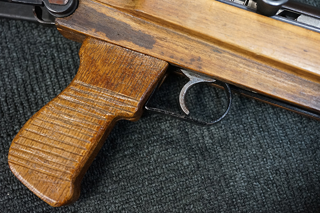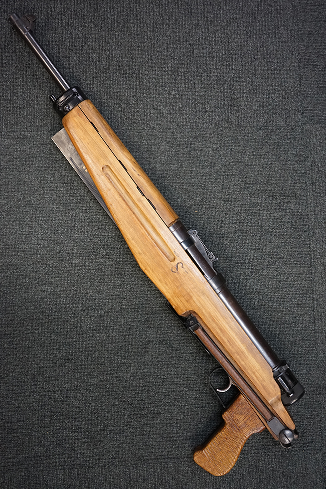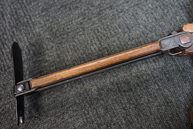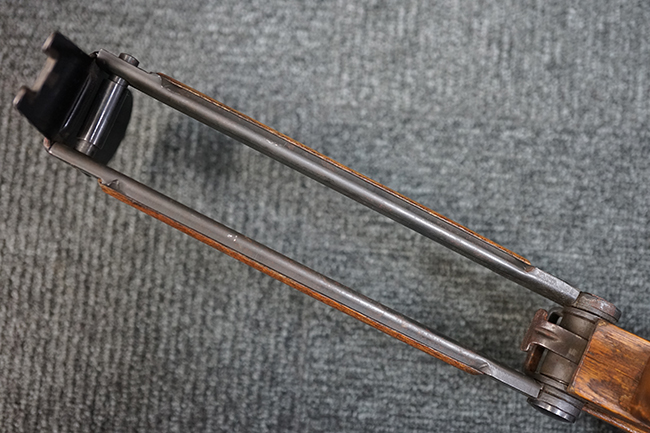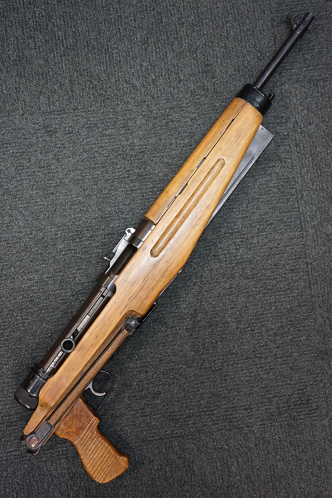 MP40を意識した折り畳み式ストックとグリップは木を多用し、バット・ストックの両側面に木製のパネルを装備し木製単材のグリップはMP40とは大きく異なっています。 自動小銃と同じように着剣装置が付いており、ハンガリー軍の35M 小銃と同じスタンダードな銃剣を装着します。 ハンガリーでは第二次大戦後も39Mと43M 短機関銃を新生ハンガリー陸軍でも1950年代まで使用されましたが、ソビエトの影響 (援助) によりPPSh41 短機関銃に置き換えられ、その後はコレクター市場に流れる事無く (スクラップ) 処分されたと言われています。 終戦の1945年にソビエト軍によって占領されたダヌビア社の生産機械はすべてソ連に持ち去られて39Mと43M共に戦後は生産されませんでした。 1950年以降はM39 短機関銃と43M 短機関銃の残余品は全て処分され、第二次大戦直後に戦勝国に資料として持ち帰られた数十挺のみが世界中に現存するだけとなりました。 本品はその内の一挺で、弊社のオーストリア=ハンガリー・ルートで一挺だけ仕入れに成功した品です。