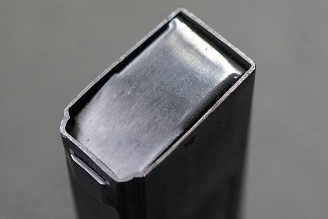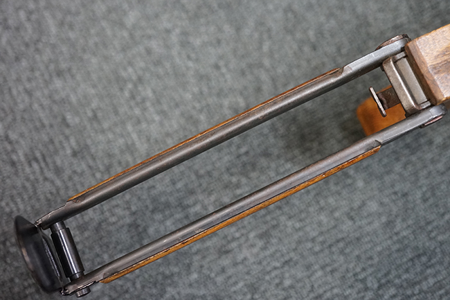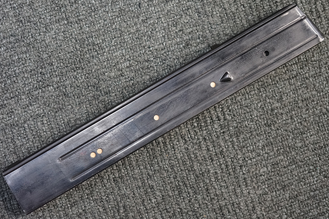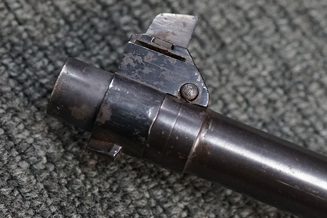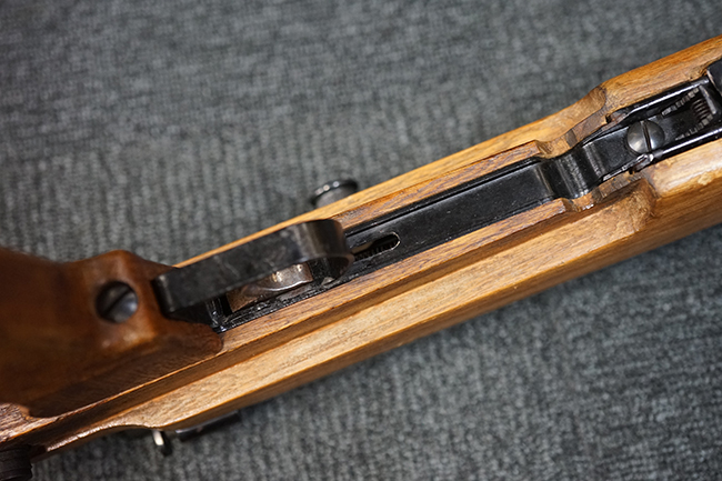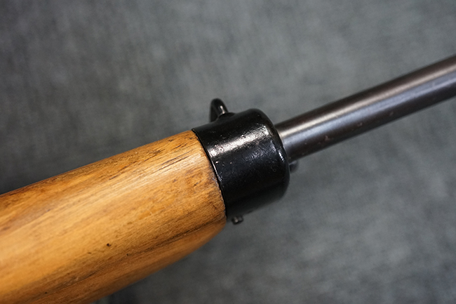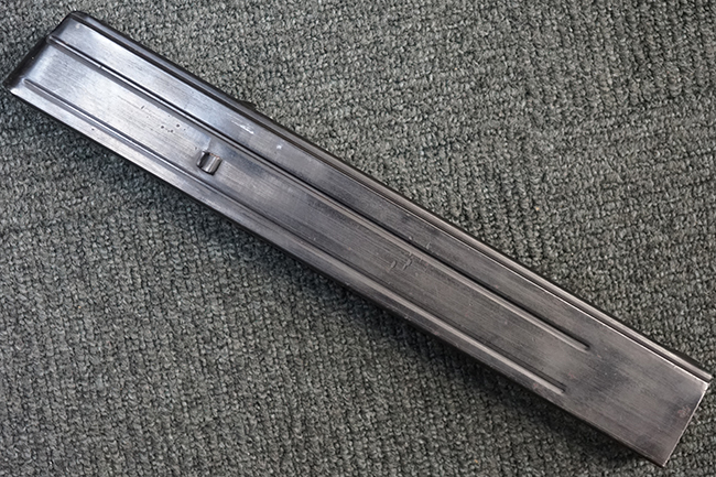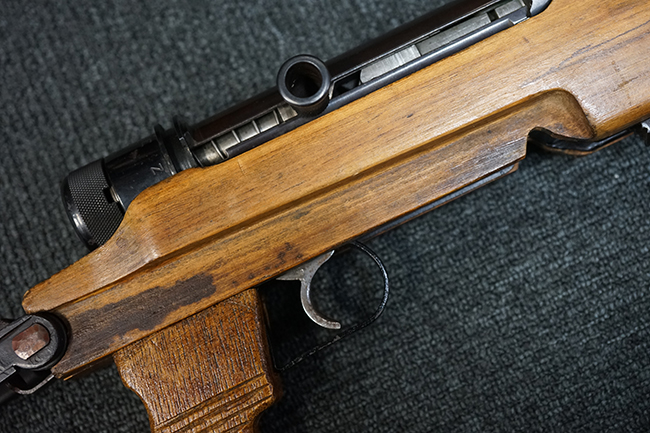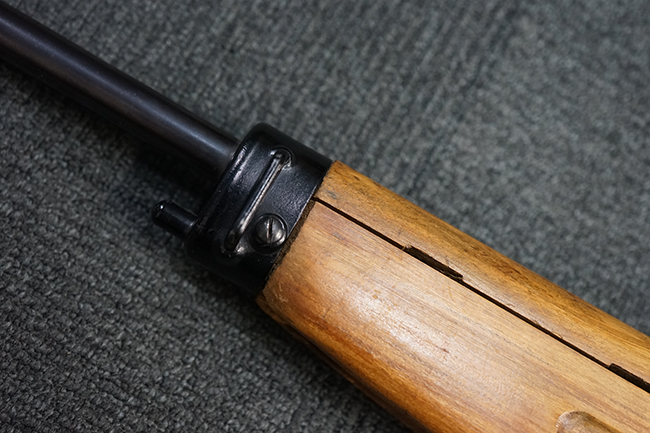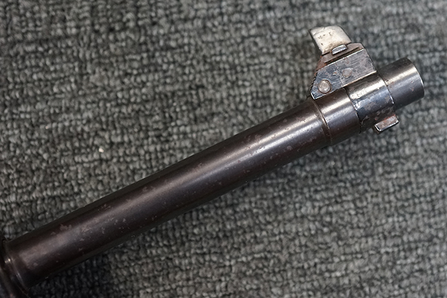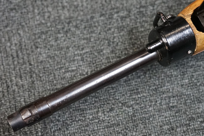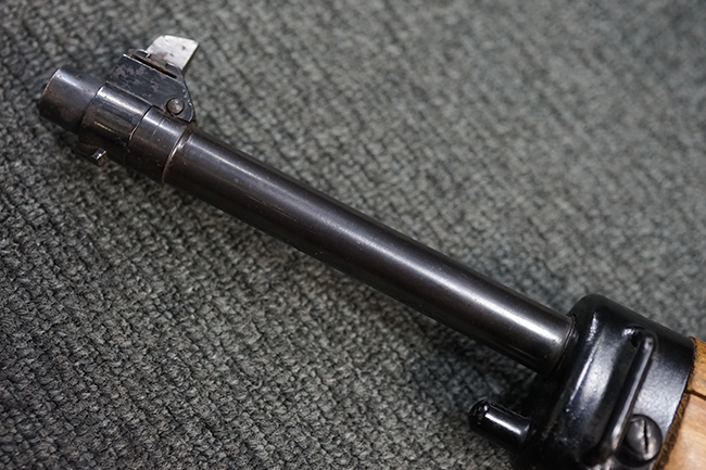 木部は申し分の無い状態で仕上げの艶がしっかりと残っています。 やはり僅かながら小傷は見られますが、割れ・欠けなく角が立っており、本銃の希少性を考えればこれ以上無いコンディションです。 アッパー・ハンドガードは左右に僅かに遊びがありますが仕組み上のものですのでマイナスではなく、折畳みストックに埋め込まれている部品はぐらつき無くぴったりと嵌め込まれています。 特徴的なマガジンの折畳み機能はスムーズに可動し、展開時・収納時ともにしっかりとキャッチが掛かります。 折畳みストックは展開時・収納時ともに若干遊びが見られますが、キャッチ自体は問題なくかかっており、勝手に展開したりすることはありません。 ストックの支柱を握りこむ事でバット・プレートを畳むことが出来ますがこちらはぐらつき無くタイトに固定されます。 機関部後部のセレクターはS・E・Z表記で各ポジションを小気味良く切り替えることができます。 また、Eのポジションでのみ、トリガーの引きが少し浅くなります。 付属のマガジンはブルー仕上げで、こちらも本体同様ブルーが大変鮮やかで小さな表面錆がほんの少し散見される他薄っすらと擦れている箇所も見受けられますが、特筆すべき難はありません。 銃口は丁寧に無可動加工が行われている為、銃口付近のライフリングを確認する事が出来ます。
