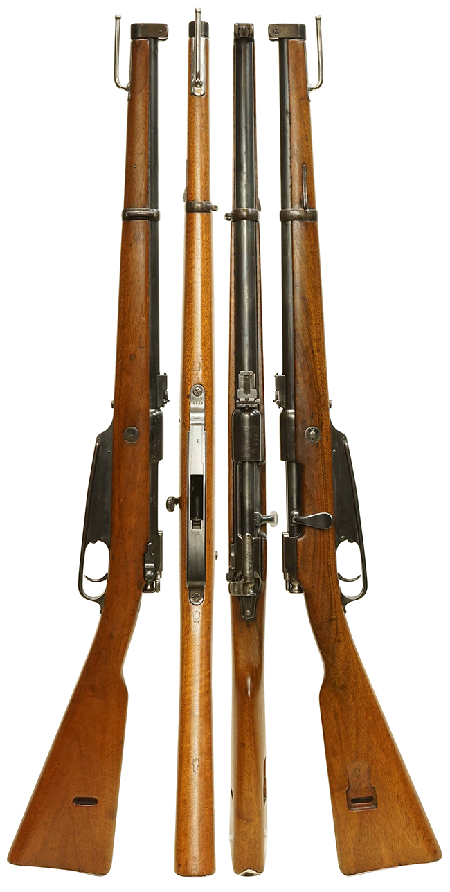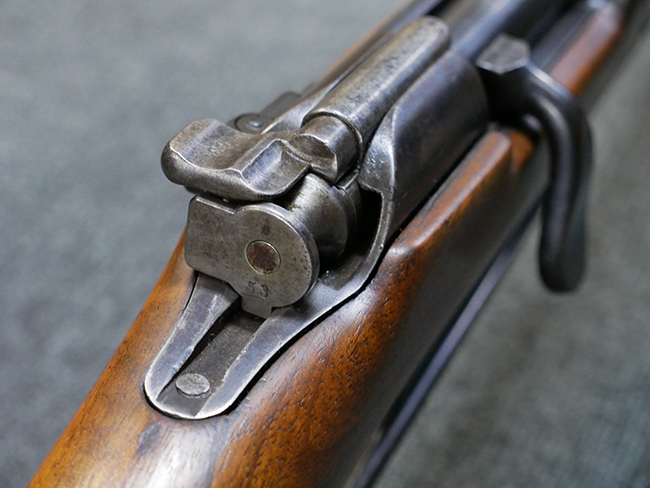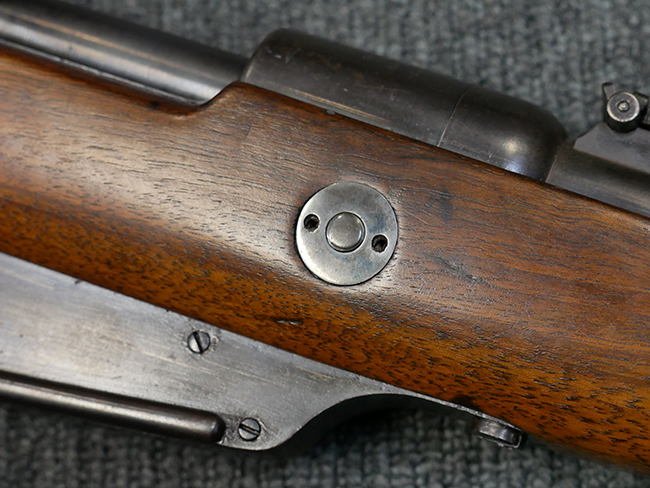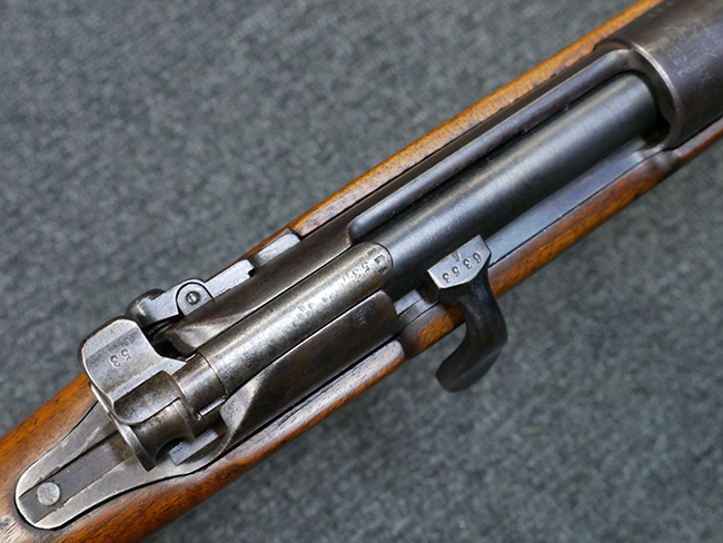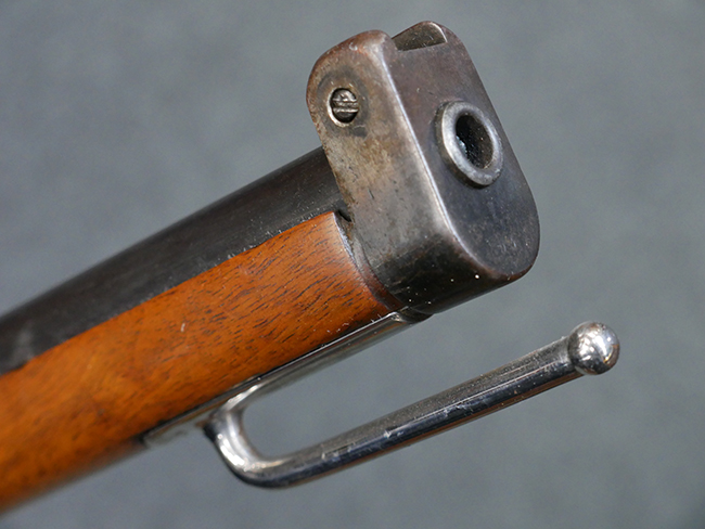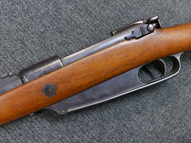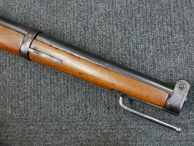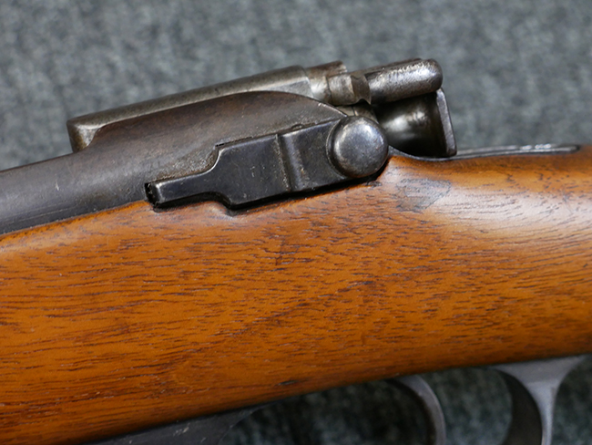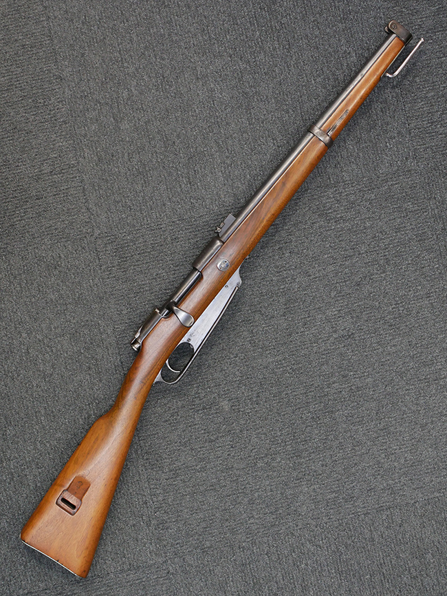 Kar.88 騎兵銃は乗馬兵科用に設計された品で銃を使用しない時は乗馬サドルの前にある革製のスキャバードに銃を入れて保管する事を前提デザインされていました。 その為に銃を地面に置く事は考えられておらず、叉銃(銃を三挺組み合わせて三脚の様に立てて保管する方法)用の突起(フック= Stacking Rod)はありませんでした。 また着剣装置がなく銃剣を付けないので銃剣に叉銃用突起(Hookedquillon)を付ける事も出来ませんでした。 小銃を主要火器とした歩兵以外の兵科では補助火器としてKar.88を使用しましたが、補助火器であるが故に銃を使用しない時に叉銃させる必要性が高いものでした。 Kar.88 騎兵銃の生産は1890年頃から始まり、直ぐに叉銃用突起を装備した改良型であるGew.88小銃を騎兵以外の兵科の補助火器として配備しました。 反対にこの叉銃用突起が付いたGew.91は騎兵のスキャバードに入れる際に引っ掛かる問題があったので騎兵には支給されませんでした。 その為騎兵用ではないので騎兵銃を意味するKarbine(Kar.)の名称を付けずに小銃を意味するGewehr (Gew.)の名称が付けられ、採用年を改定し騎兵銃と全く同じ全長でありながら全長の長い小銃を表すGew.91の名称になりました。 Gew.91は補助火器として採用されたので総生産数は少なく合計65,000挺程と言われています。 これは帝政ドイツで正式採用された小火器の中ではかなり少ない数です。因みにGew.88騎兵銃は20万挺以上生産されています。 最も大きなGew.91 短小銃とKar.88 騎兵銃の違いは叉銃用突起の有無の他にセーフティの形状の違いもあります。 Gew.91 短小銃は1909年にGew.98の短縮型であるKar.98aが採用されるまで砲兵等によって使用されました。 しかしながらKar.98a 小銃に比べ軽量でコンパクトなGew.91は輜重兵、自転車部隊、伝令兵などから気球搭乗員に至るまで第一次大戦の勃発でGew.91は軽量で取り回しの良さから重宝されました。 第一次大戦後の兵力を縮小されたヴァイマール共和国軍では十分な挺数のGew.98やkar.98aが支給され、Gew.91 は軍用としては使用されませんでした。(MM)