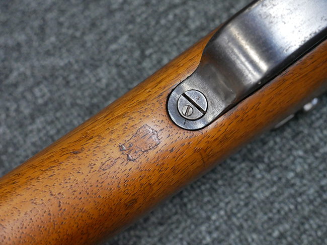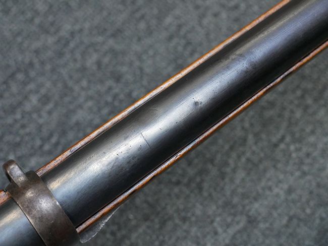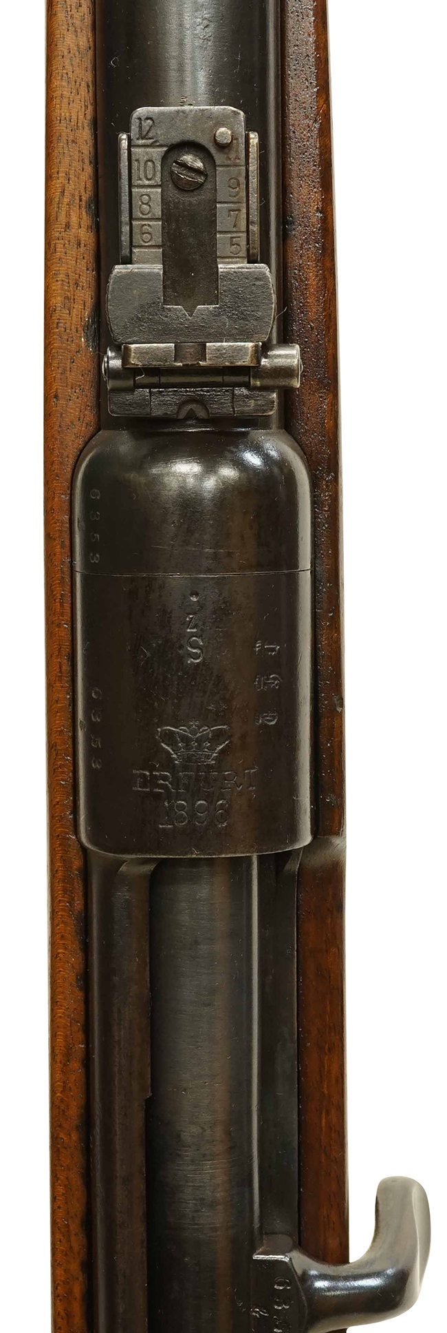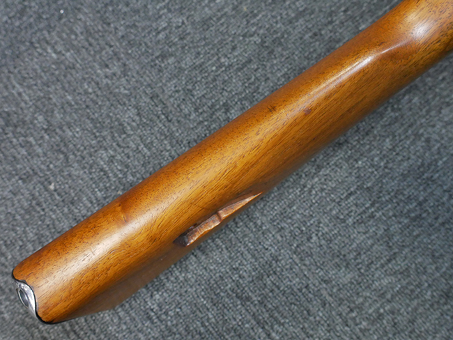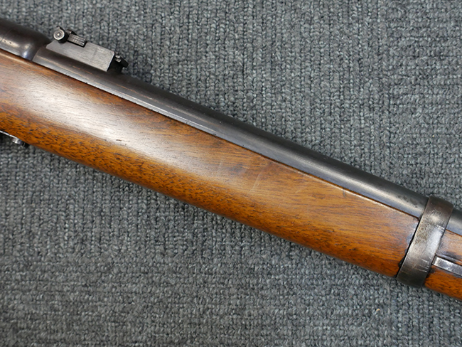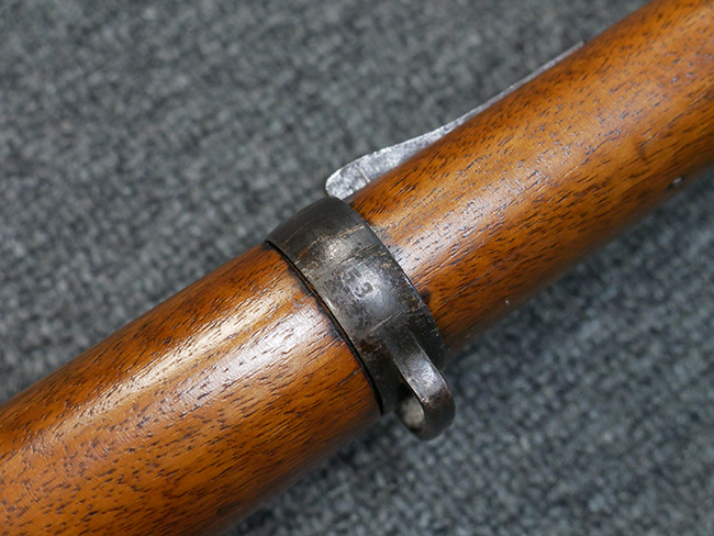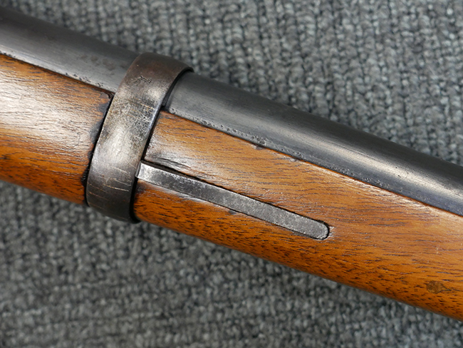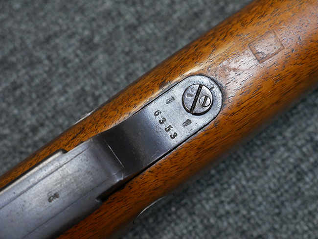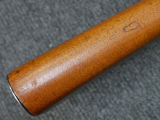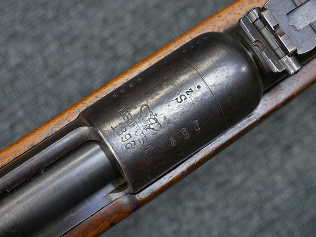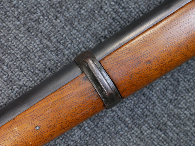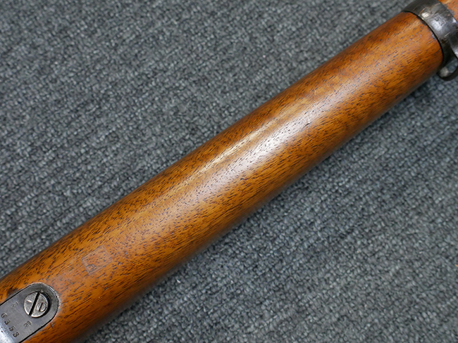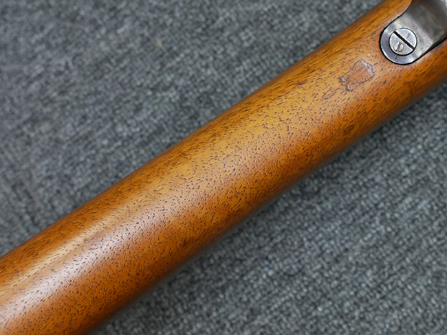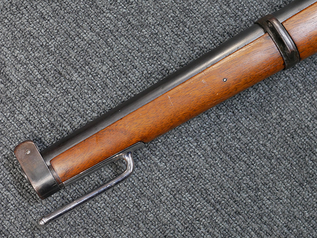 本品は非常に珍しいモデルである上に、状態も申し分のない弊社の資料室に入っていた品です。 薬室の上には1896年プロイセン国営Erfurt造兵廠で製造を表す刻印(王冠/ERFURT/1896)が入り、その上に「S」の刻印が入っています。 この「S」刻印はGew.88が採用された際はRound-nosed Cartridge(丸弾頭)でしたが、弾頭が尖ったSpizter Cartridge(尖頭弾)も使用できるGew.91にはこの「S」刻印が入っています。 薬室の右側面には帝政ドイツのアムト刻印に相当する検査刻印が三カ所続いて刻印されています。 また左側面にシリアル No.6353bが入っており、直ぐ前のバレル・ジャケットのNo.を含め、ボルト、ボルト・スリーブ、コッキング・ピース、セーフティ、トリガーガード、ストライカー、ノーズ・キャップ、センター・バンド、フロント・サイト、リア・サイト、リア・サイト・リーフ、フリップ・サイトに至るまでオール・マッチングのオリジナル性が非常に高い品です。 銃身や機関部を含む全ての金属部分のプロ職人によるブルー仕上げも当時の雰囲気を良く残しています。 木製ストックも僅かに手は加えられていますがオリジナル仕上げもほぼ残っておりこれ以上の品は無いような素晴らしい状態です。バット・ストック側面と下部に帝政ドイツの検査刻印が五ヵ所入っています。 叉銃用突起とバット・プレートがクローム仕上げになっています。 レシーバー・レイルには本品の特徴である「Gew.91」の刻印がハッキリと入っています。 またその下に「n.m.」の刻印も入っています。 リア・サイトは小型で騎兵が使用するのにも引っ掛かりが少ないように面取りされた美しい形状で、500mから1200mまでのラダー・サイトの後ろに固定式のバトル・サイトとは別にフリップ式の300m用と思われるバトル・サイトも付いています。 これらのリア・サイト一式の作動も完全です。 ボルト・リリース・ボタンやエン・ブロック・クリップを残弾がある状態で排出するトリガー前のボタンも完全に作動します。 さく杖は元々付属しない構造の銃です。 ボルトが閉鎖した状態で溶接固定された旧加工品です。(MM)