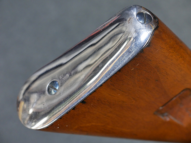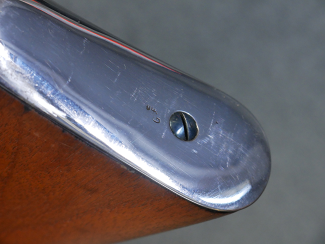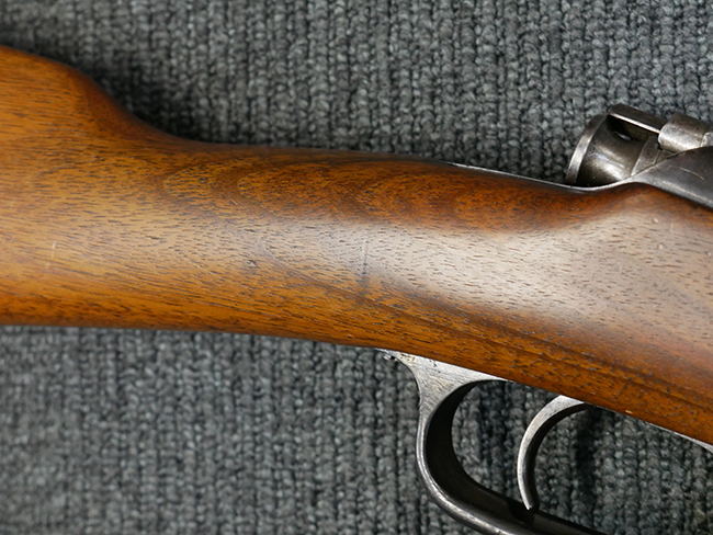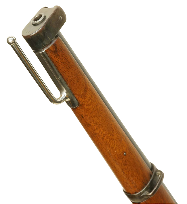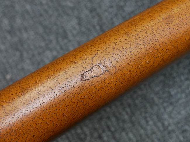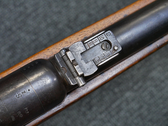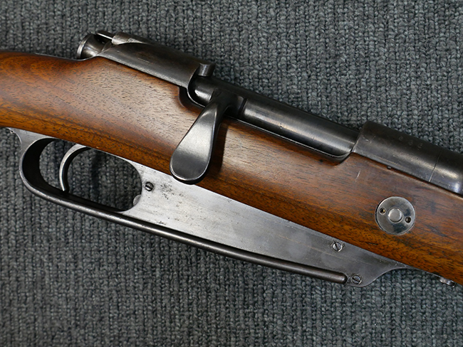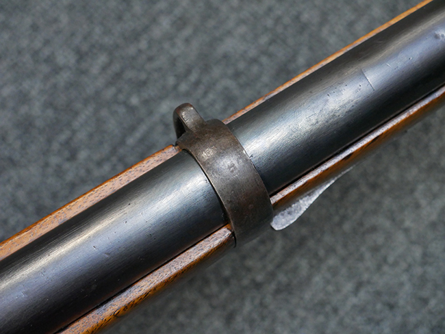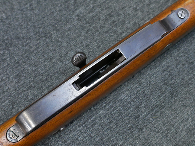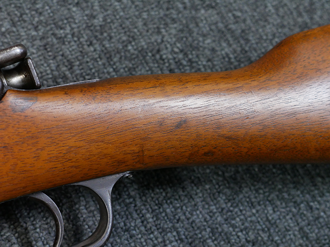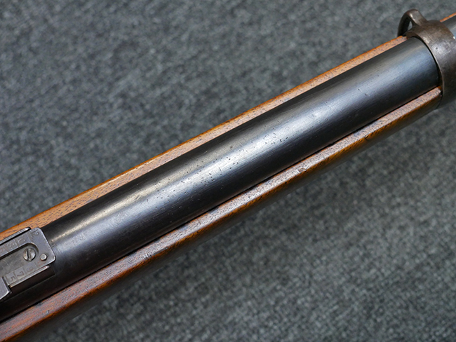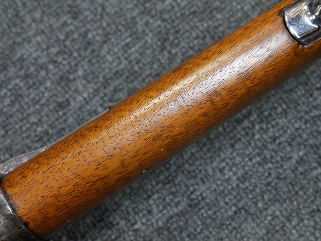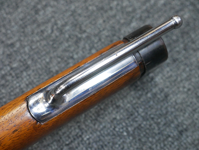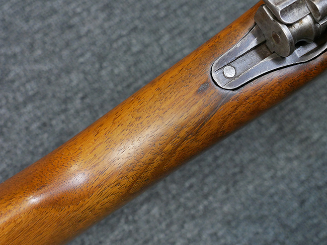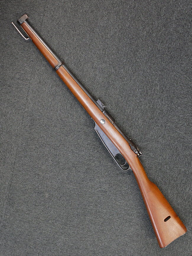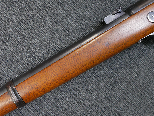 本品は非常に珍しいモデルである上に、状態も申し分のない弊社の資料室に入っていた品です。 薬室の上には1896年プロイセン国営Erfurt造兵廠で製造を表す刻印(王冠/ERFURT/1896)が入り、その上に「S」の刻印が入っています。 この「S」刻印はGew.88が採用された際はRound-nosed Cartridge(丸弾頭)でしたが、弾頭が尖ったSpizter Cartridge(尖頭弾)も使用できるGew.91にはこの「S」刻印が入っています。 薬室の右側面には帝政ドイツのアムト刻印に相当する検査刻印が三カ所続いて刻印されています。 また左側面にシリアル No.6353bが入っており、直ぐ前のバレル・ジャケットのNo.を含め、ボルト、ボルト・スリーブ、コッキング・ピース、セーフティ、トリガーガード、ストライカー、ノーズ・キャップ、センター・バンド、フロント・サイト、リア・サイト、リア・サイト・リーフ、フリップ・サイトに至るまでオール・マッチングのオリジナル性が非常に高い品です。 銃身や機関部を含む全ての金属部分のプロ職人によるブルー仕上げも当時の雰囲気を良く残しています。 木製ストックも僅かに手は加えられていますがオリジナル仕上げもほぼ残っておりこれ以上の品は無いような素晴らしい状態です。バット・ストック側面と下部に帝政ドイツの検査刻印が五ヵ所入っています。 叉銃用突起とバット・プレートがクローム仕上げになっています。 レシーバー・レイルには本品の特徴である「Gew.91」の刻印がハッキリと入っています。 またその下に「n.m.」の刻印も入っています。 リア・サイトは小型で騎兵が使用するのにも引っ掛かりが少ないように面取りされた美しい形状で、500mから1200mまでのラダー・サイトの後ろに固定式のバトル・サイトとは別にフリップ式の300m用と思われるバトル・サイトも付いています。 これらのリア・サイト一式の作動も完全です。 ボルト・リリース・ボタンやエン・ブロック・クリップを残弾がある状態で排出するトリガー前のボタンも完全に作動します。 さく杖は元々付属しない構造の銃です。 ボルトが閉鎖した状態で溶接固定された旧加工品です。(MM)