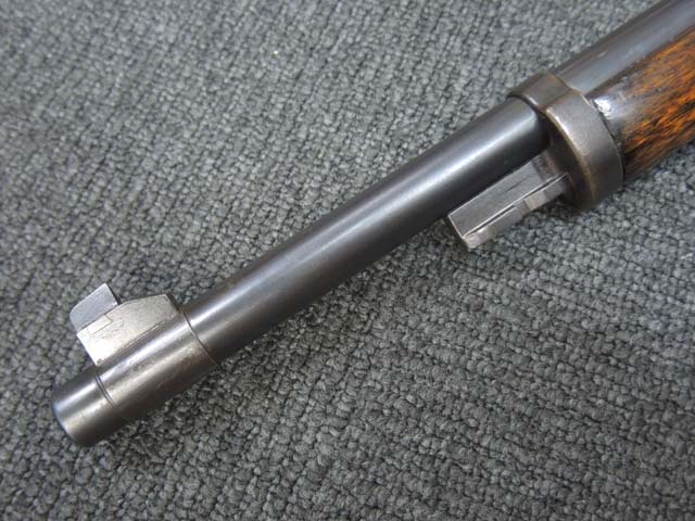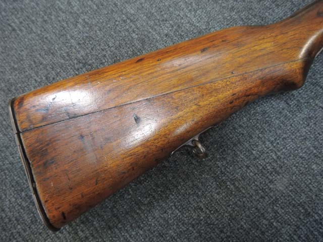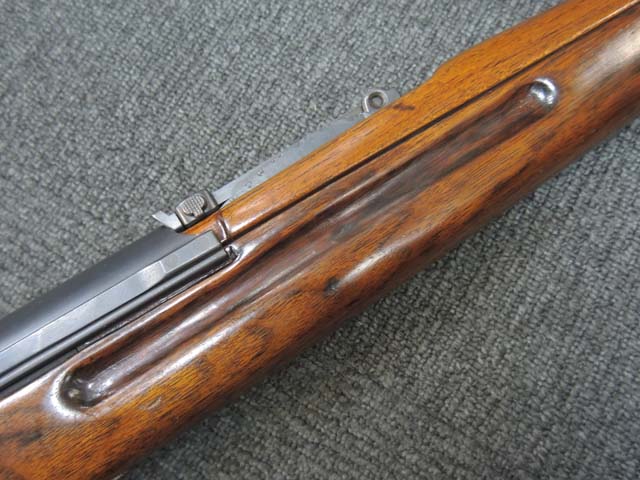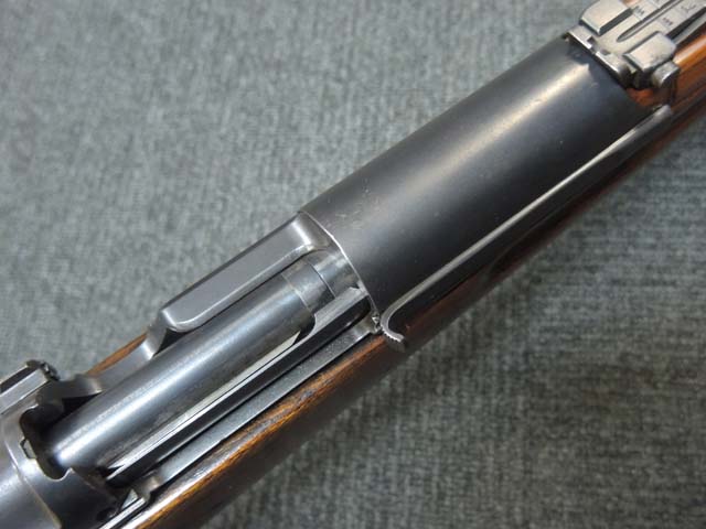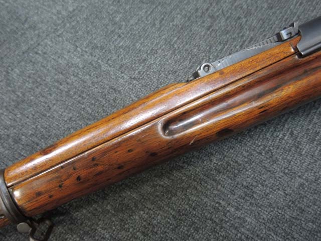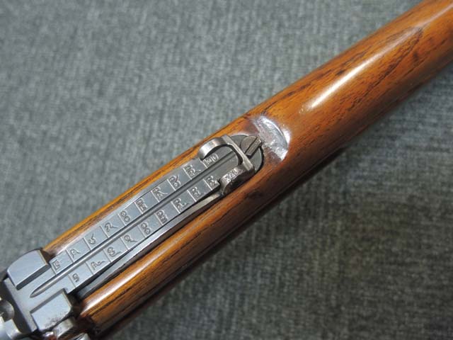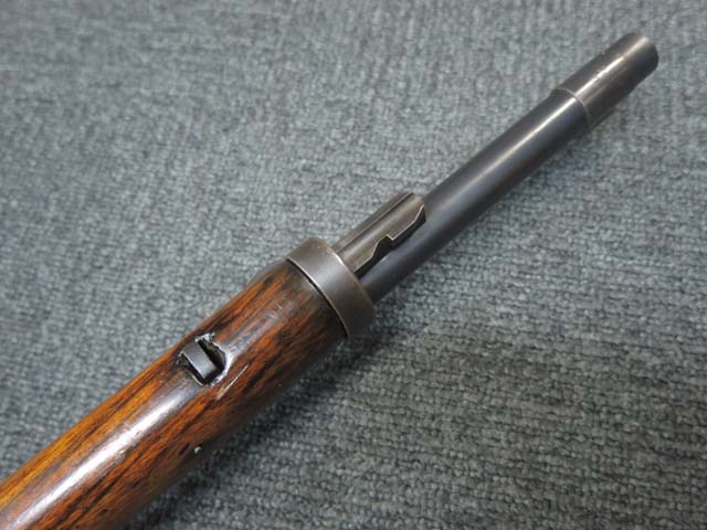 本品の機関部や銃身といった金属部はやや擦れ等が見受けられるものの、大部分にブルー仕上げが残っています。 ダスト・カバー表面やトリガー・ガード、弾倉底板、リア・サイト周辺にやや朽ち込み痕が見受けられるものの、現状では比較的目立たないレベルです。 木部は全体に艶のある仕上げ直しが行われており、アッパー・タング周辺やバット・プレート周辺にやや痩せが見受けられますが、丁寧な仕上げが行われているためあまり違和感はありません。 旧軍小銃と同様のバット・ストックの上下の継ぎ目についても隙間等はそれほど目立ちません。 バット・プレートは若干の朽ち込み痕や擦れが見受けられますが、大きな変形等は見られず、銃床への取り付けもガタつきもなくしっかりとしています。 スライド式のコンパートメントの蓋の開閉も問題なく行えます。 遊底覆のスライド操作や前後ポジションでのロックやリア・サイトの調整操作はスムーズに行う事が可能です。 リア・バンドやボルト・リリース・ラッチ、セーフティ・ノブにややガタつきが見られます。 弾倉底板の取り外しも可能で、マガジン・フォロアーやスプリングも入っています。