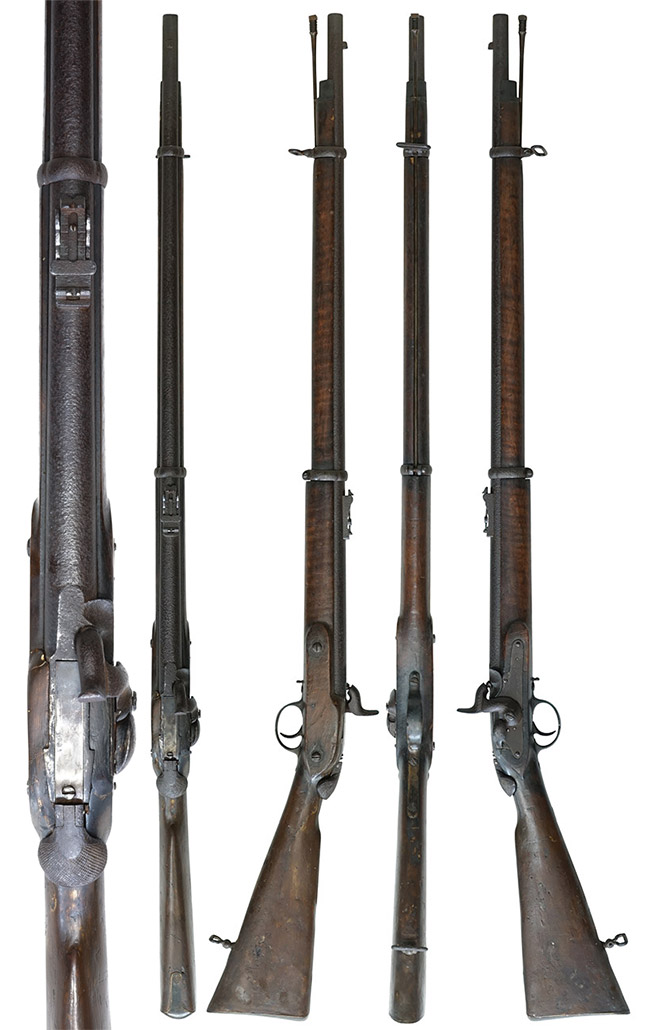 ウィルソン2 バンド ライフルはトーマス・ウィルソン(Thomas Wilson)が1859年5月28日にパテントを取得した No.1318(Thomas Wilsons British Patent No. 1318)と1860年10月12日にパテントを取得した No.2488(Thomas Wilsons British Patent No. 2488)の後装装置を使った後装施条管打式銃です。 元になった銃は.577口径のエンフィールド小銃で、口径も同じで腔綫「ライフリング」は初期型と同じ5条となっています。 撃発装置もエンフィールド小銃と同じような、サイド・ロックの雷管外火式です。 後装式でも雷管外火式はCapping-Breech-loading systemと呼ばれています。 後装式の構造を除けばエンフィールド小銃とほぼ同じスペックです。 1850年後半から1860年代に前装式から後装式に改造する数多くのシステムが発明されましたが、十種類ほどの軍用として採用されたシステム以外は極僅かな例外を除き量産されずウィルソン小銃もその一つとなりました。 前装式から後装式に改造された正式採用軍用銃も、その後の専用後装式システムの出現によって完全に消え去りました。 この小銃の装填方法の大きな転換期に現れた品々を研究する事は後の(手動)連発銃から現代の自動小銃までの銃砲史を知る上で非常に重要になっています。